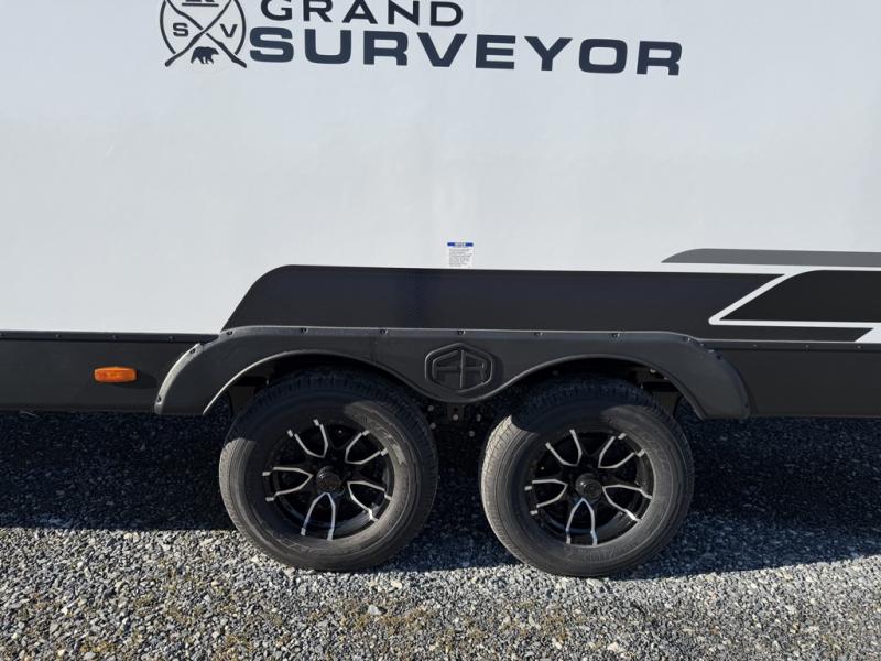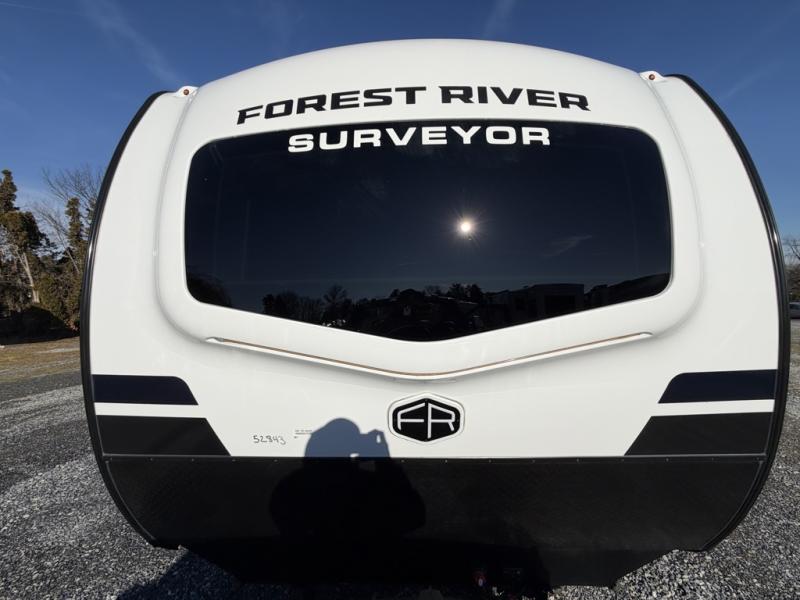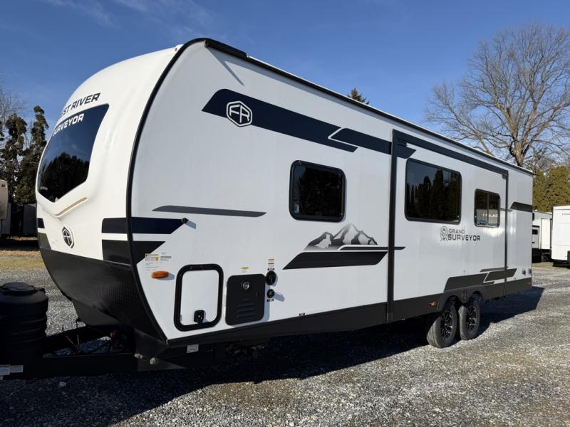 With any Grand Surveyor travel trailer by Forest River you will enjoy turn-key ready-to-go features and quality construction! Each model includes Azdel composite walls and a gel coated fiberglass front cap with an automotive style tinted windshield for a sleek look. There are friction hinge black glass entry door(s), an adjustable platform step with a night light, plus Goodyear tires and a power tongue jack for easy towing. The interior will have you feeling right at home with roller shades, residential faucets, sinks, and bathroom vanity, plus Surf(x) seamless countertops throughout. You can also plan for adventure with a 2" rear accessory and exterior spray port, and there are slam latch exterior baggage doors throughout to keep all your gear secure. Other stand-out features include a central vacuum system, a 200 watt solar panel with a 30 amp controller, a tankless water heater, carpet-free interiors, and the list goes on!