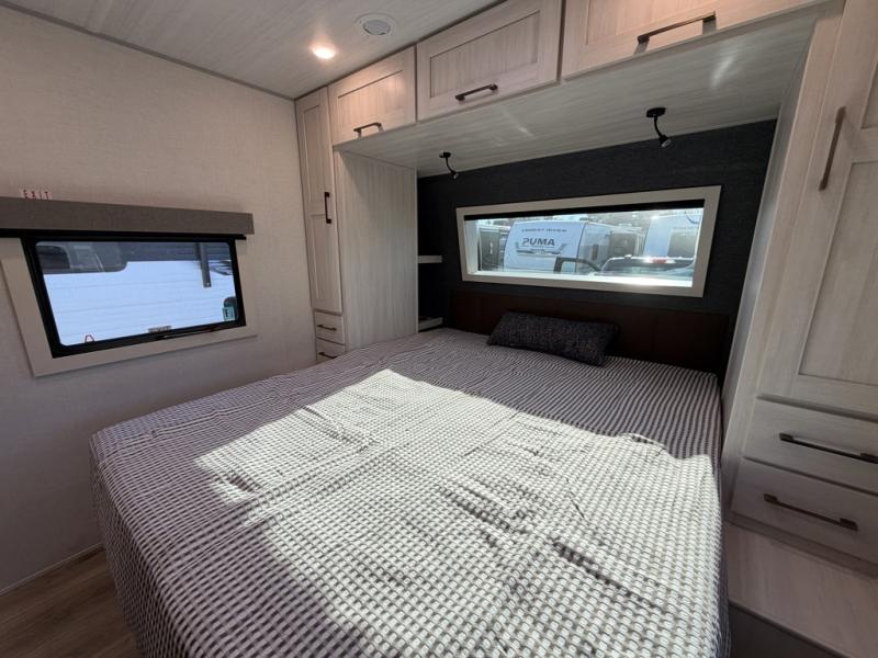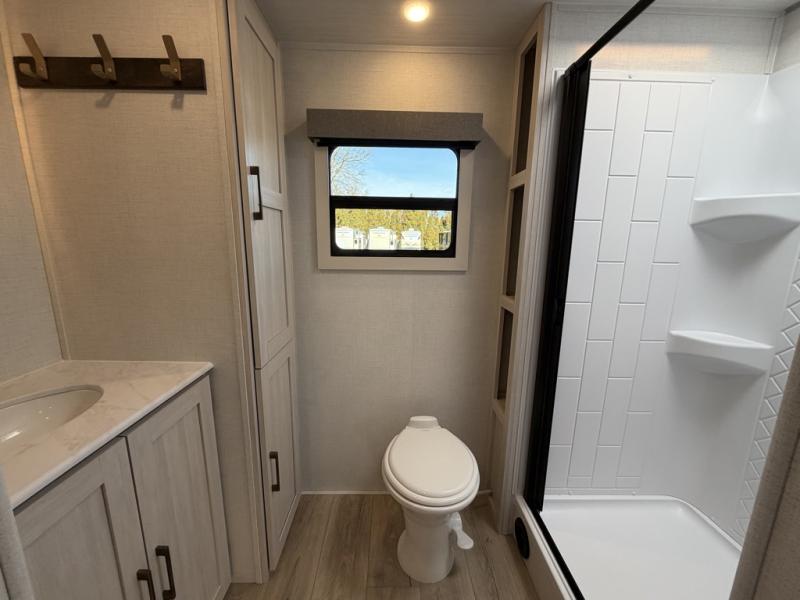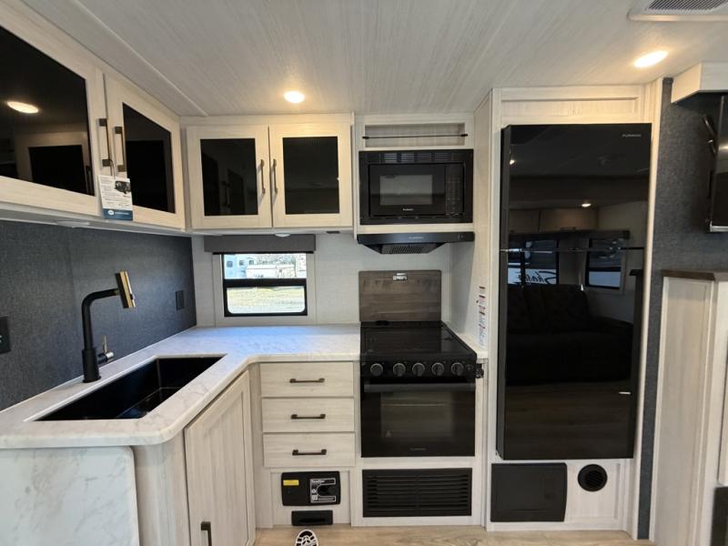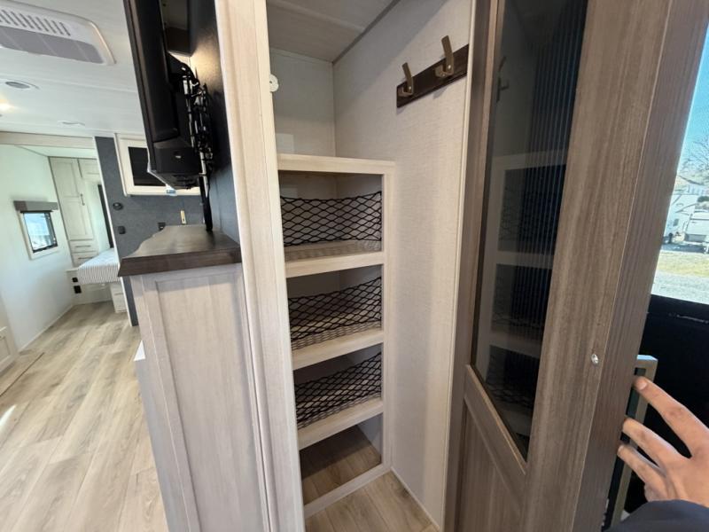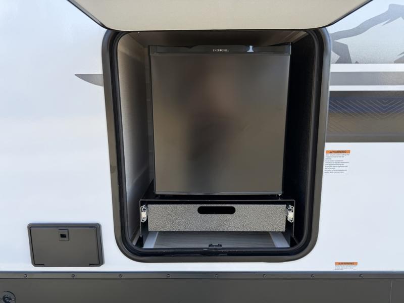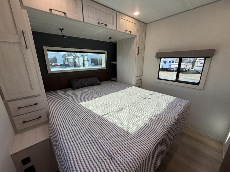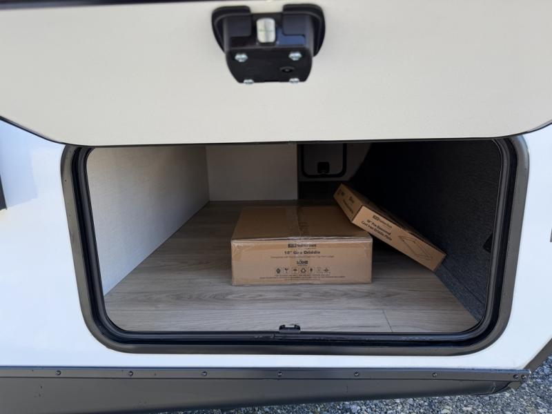 No need to rough it when you camp; this trailer offers amenities that allow you to "Glamp" if you want! The rear spacious bathroom is tucked away behind a beautiful barn door, and inside features a shower, wardrobe, and linen storage. The front master bedroom offers privacy, a walk-around custom king bed, dual wardrobes and underbed storage, plus TV prep if you want the option to watch movies in bed. The L-shaped counter in the kitchen provides enough space to have everything at your fingertips while you cook, plus there is a countertop extension for more prep and serving space if needed. A nice walk-in pantry just inside the entry door will be perfect for chips and snacks or canned goods for those longer camping trips. If dining inside, the booth dinette with pull-out dinette drawers will be comfortable plus you will enjoy the view provided by the panoramic windows within the slide out. An outside kitchen will be a favorite for anyone that cooks, and the 19' awning will provide some protection and offering an outdoor living area to enjoy with everyone.