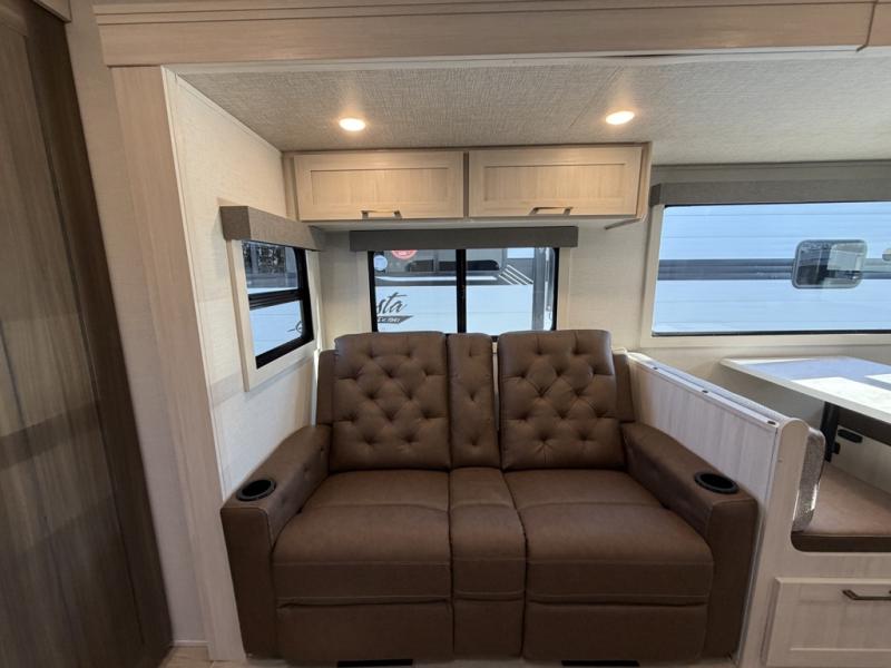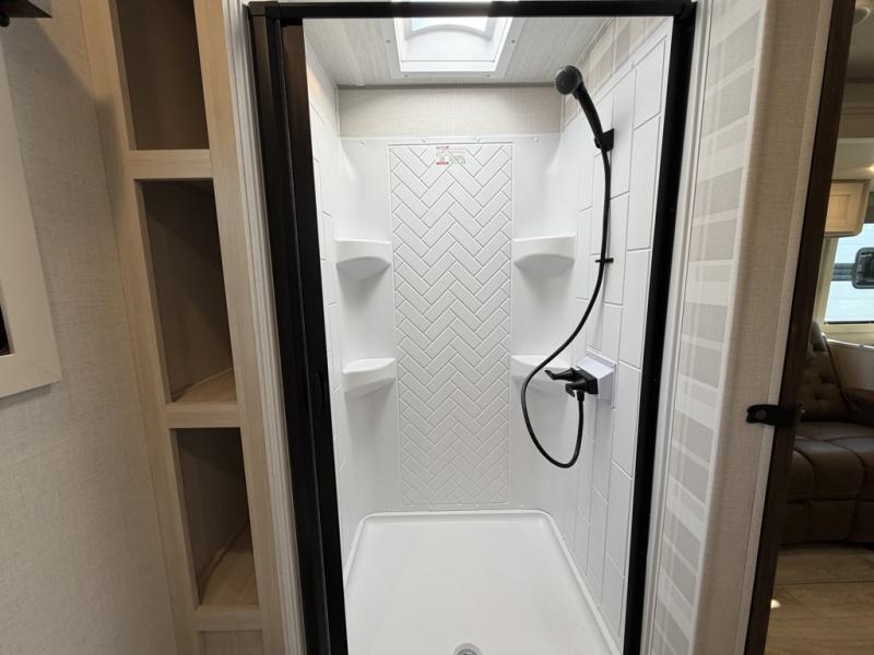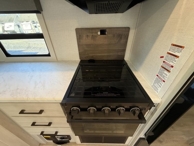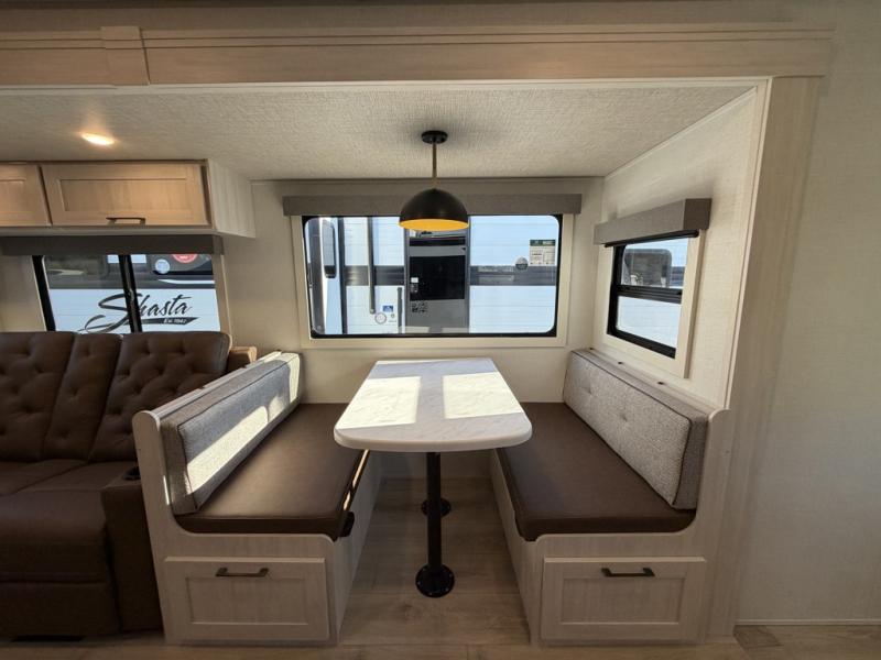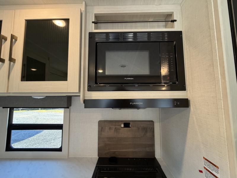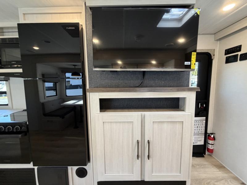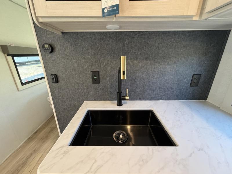 No need to rough it when you camp; this trailer offers amenities that allow you to "Glamp" if you want! The rear spacious bathroom is tucked away behind a beautiful barn door, and inside features a shower, wardrobe, and linen storage. The front master bedroom offers privacy, a walk-around custom king bed, dual wardrobes and underbed storage, plus TV prep if you want the option to watch movies in bed. The L-shaped counter in the kitchen provides enough space to have everything at your fingertips while you cook, plus there is a countertop extension for more prep and serving space if needed. A nice walk-in pantry just inside the entry door will be perfect for chips and snacks or canned goods for those longer camping trips. If dining inside, the booth dinette with pull-out dinette drawers will be comfortable plus you will enjoy the view provided by the panoramic windows within the slide out. An outside kitchen will be a favorite for anyone that cooks, and the 19' awning will provide some protection and offering an outdoor living area to enjoy with everyone.