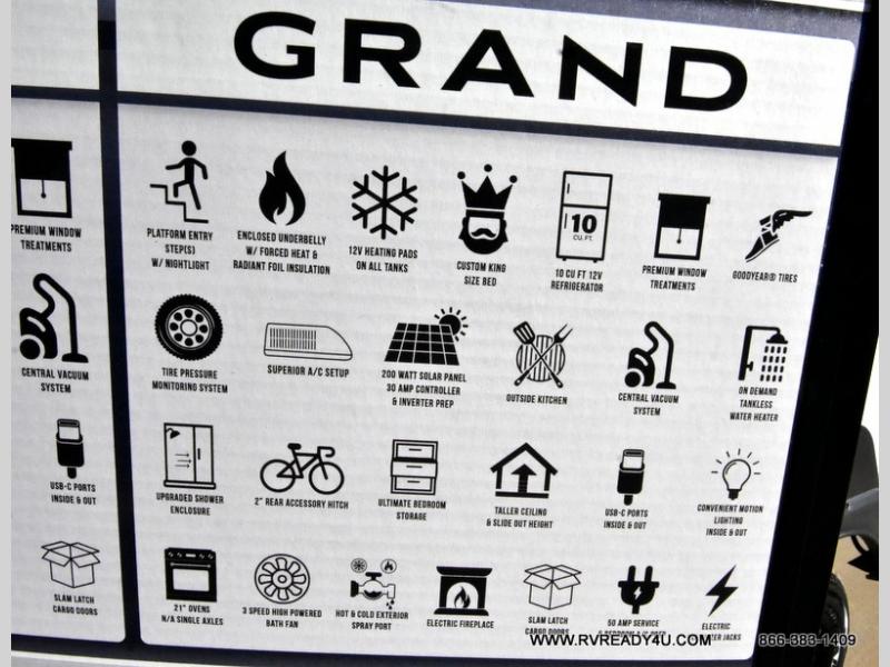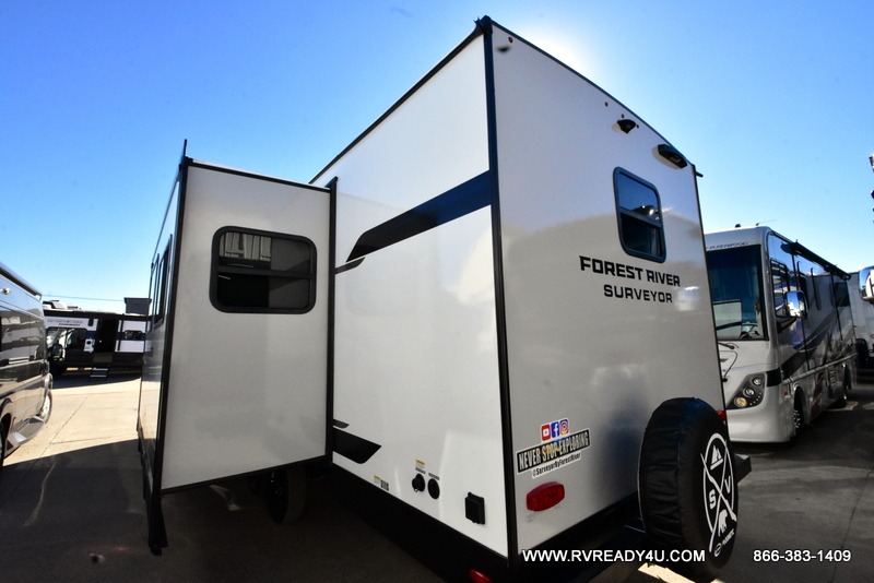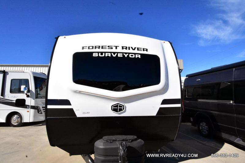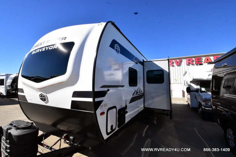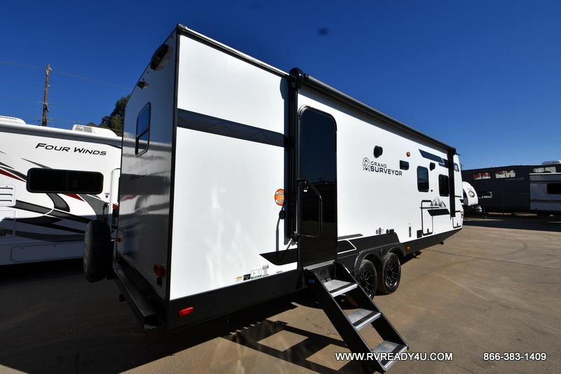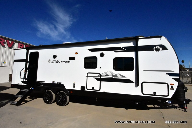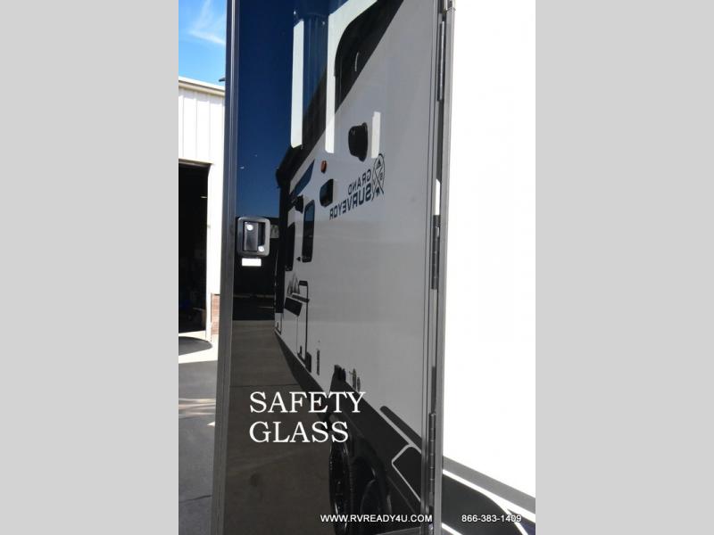 With any Grand Surveyor travel trailer by Forest River you will enjoy turn-key ready-to-go features and quality construction! Each model includes Azdel composite walls and a gel coated fiberglass front cap with an automotive style tinted windshield for a sleek look. There are friction hinge black glass entry door(s), an adjustable platform step with a night light, plus Goodyear tires and a power tongue jack for easy towing. The interior will have you feeling right at home with roller shades, residential faucets, sinks, and bathroom vanity, plus Surf(x) seamless countertops throughout. You can also plan for adventure with a 2" rear accessory and exterior spray port, and there are slam latch exterior baggage doors throughout to keep all your gear secure. Other stand-out features include a central vacuum system, a 200 watt solar panel with a 30 amp controller, a tankless water heater, carpet-free interiors, and the list goes on!