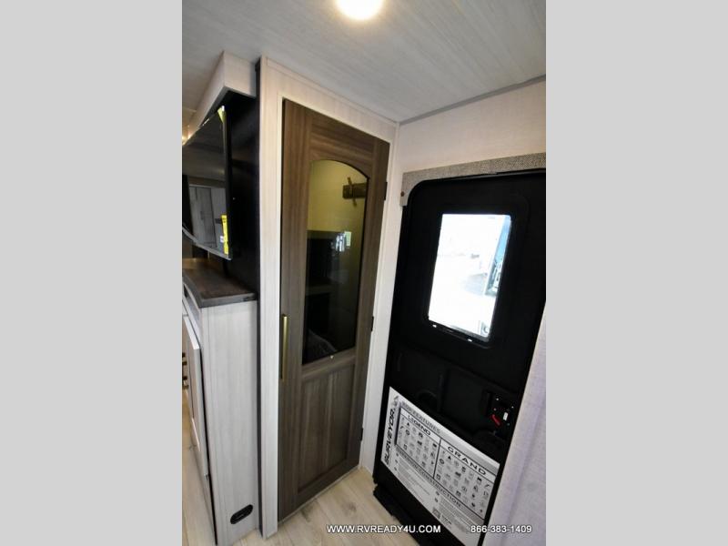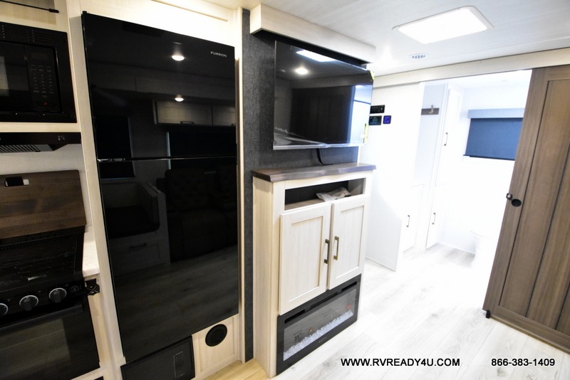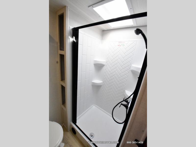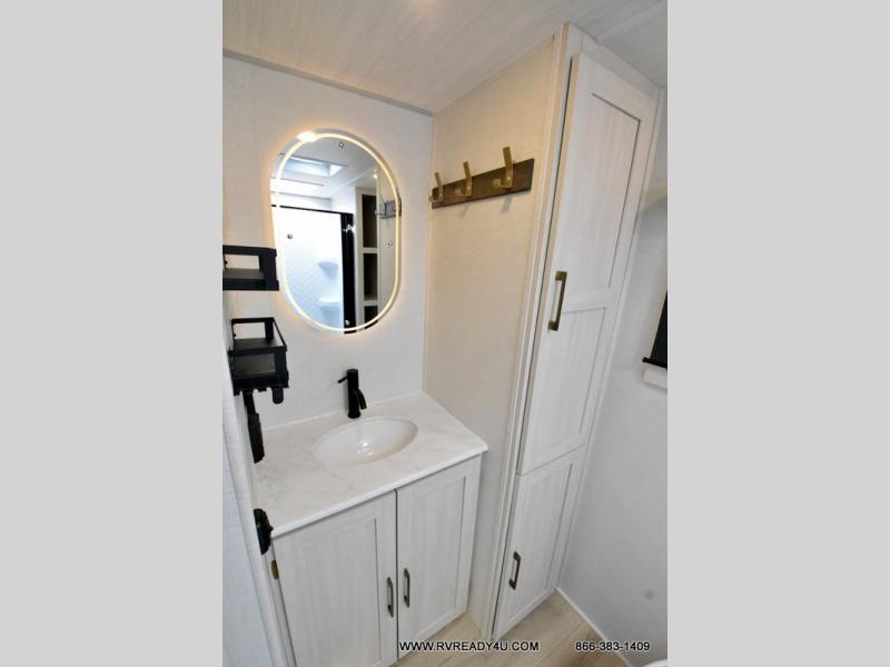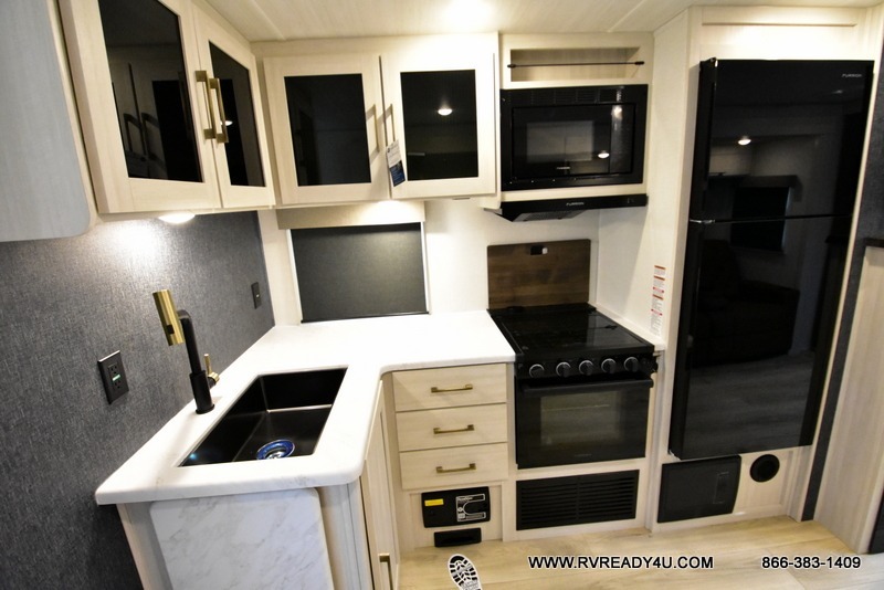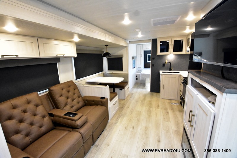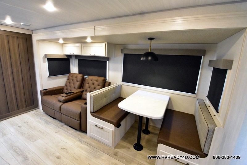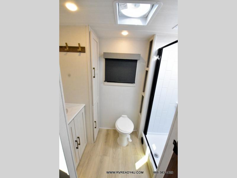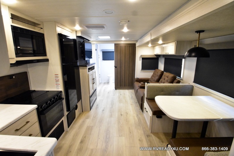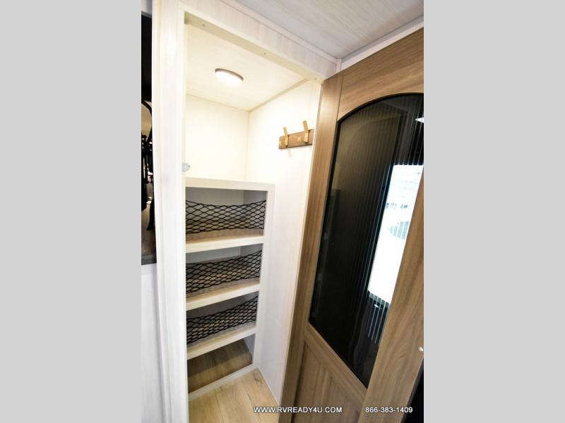 No need to rough it when you camp; this trailer offers amenities that allow you to "Glamp" if you want! The rear spacious bathroom is tucked away behind a beautiful barn door, and inside features a shower, wardrobe, and linen storage. The front master bedroom offers privacy, a walk-around custom king bed, dual wardrobes and underbed storage, plus TV prep if you want the option to watch movies in bed. The L-shaped counter in the kitchen provides enough space to have everything at your fingertips while you cook, plus there is a countertop extension for more prep and serving space if needed. A nice walk-in pantry just inside the entry door will be perfect for chips and snacks or canned goods for those longer camping trips. If dining inside, the booth dinette with pull-out dinette drawers will be comfortable plus you will enjoy the view provided by the panoramic windows within the slide out. An outside kitchen will be a favorite for anyone that cooks, and the 19' awning will provide some protection and offering an outdoor living area to enjoy with everyone.