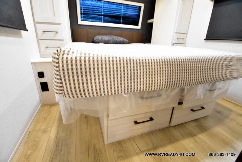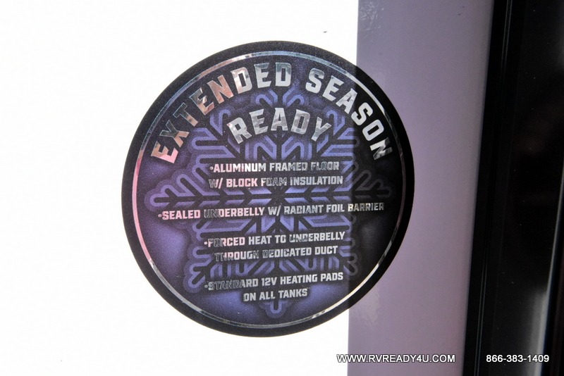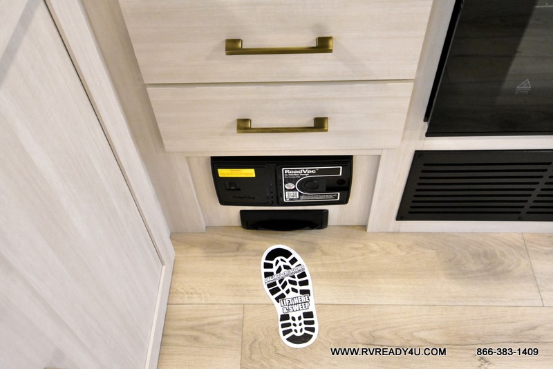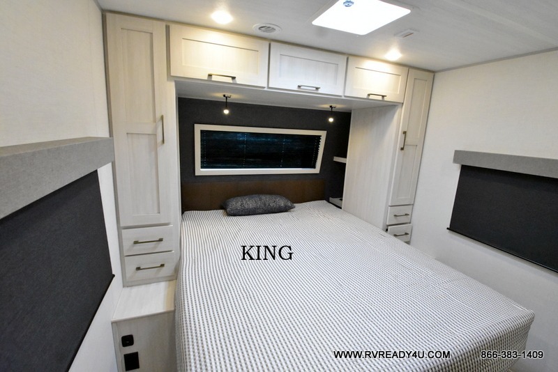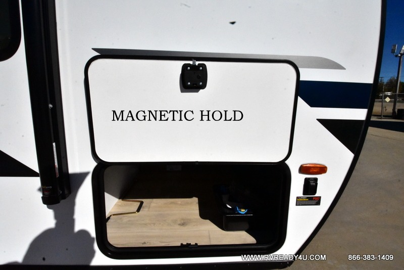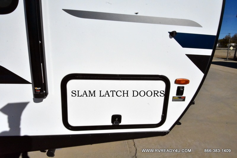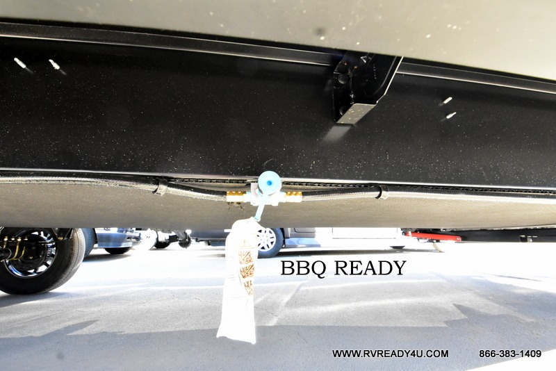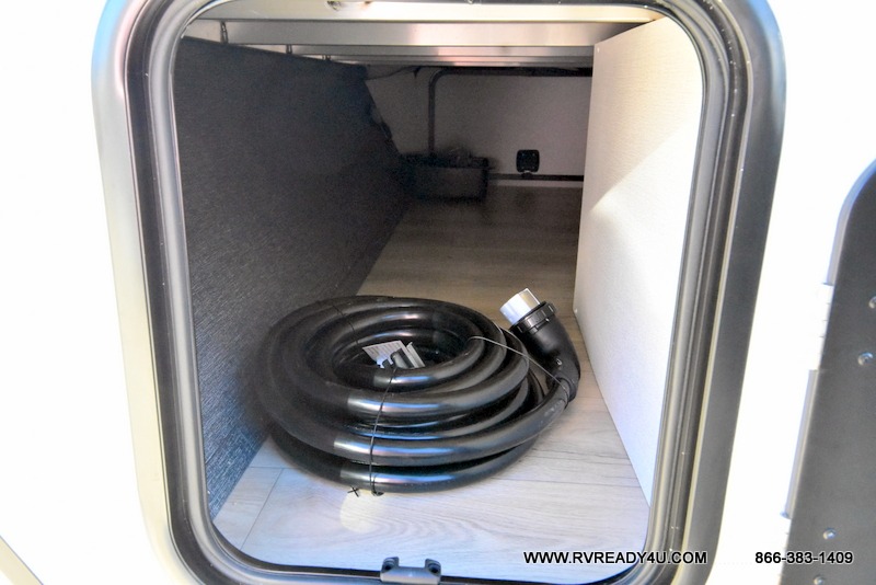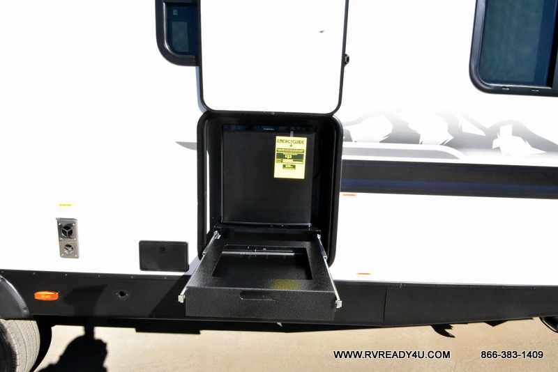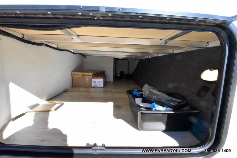 No need to rough it when you camp; this trailer offers amenities that allow you to "Glamp" if you want! The rear spacious bathroom is tucked away behind a beautiful barn door, and inside features a shower, wardrobe, and linen storage. The front master bedroom offers privacy, a walk-around custom king bed, dual wardrobes and underbed storage, plus TV prep if you want the option to watch movies in bed. The L-shaped counter in the kitchen provides enough space to have everything at your fingertips while you cook, plus there is a countertop extension for more prep and serving space if needed. A nice walk-in pantry just inside the entry door will be perfect for chips and snacks or canned goods for those longer camping trips. If dining inside, the booth dinette with pull-out dinette drawers will be comfortable plus you will enjoy the view provided by the panoramic windows within the slide out. An outside kitchen will be a favorite for anyone that cooks, and the 19' awning will provide some protection and offering an outdoor living area to enjoy with everyone.
