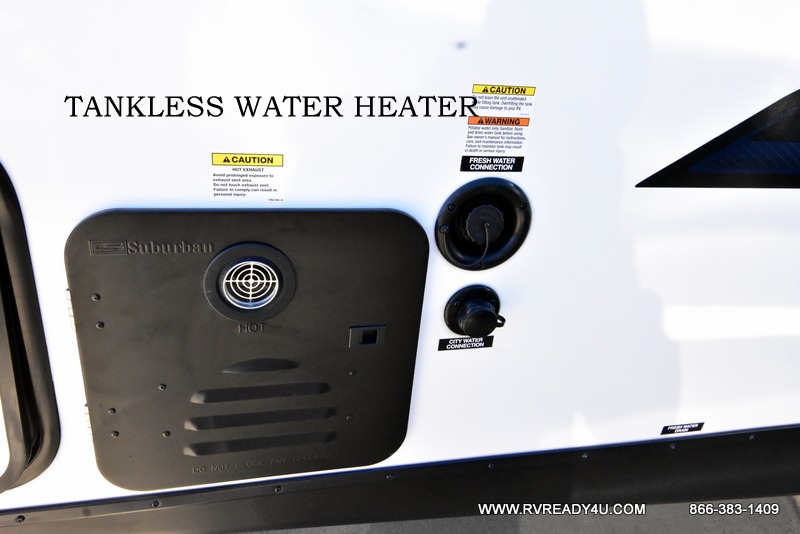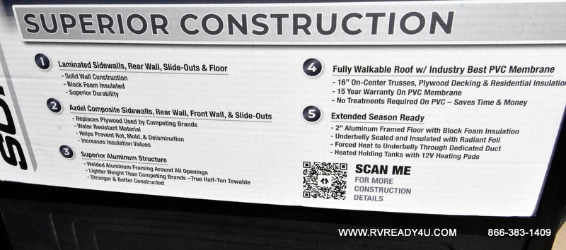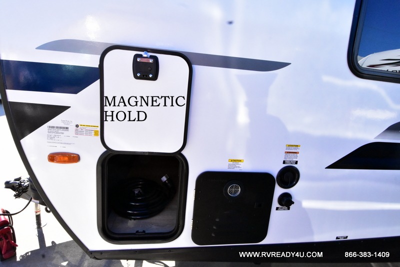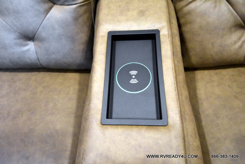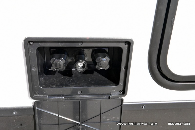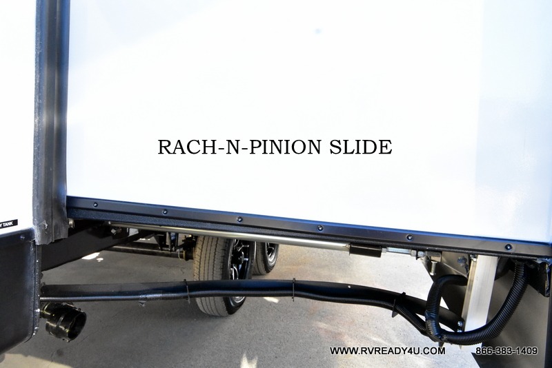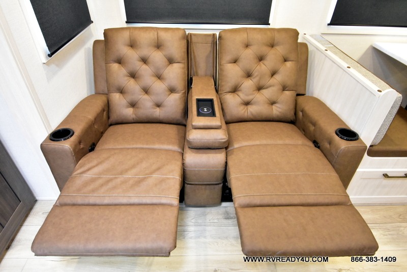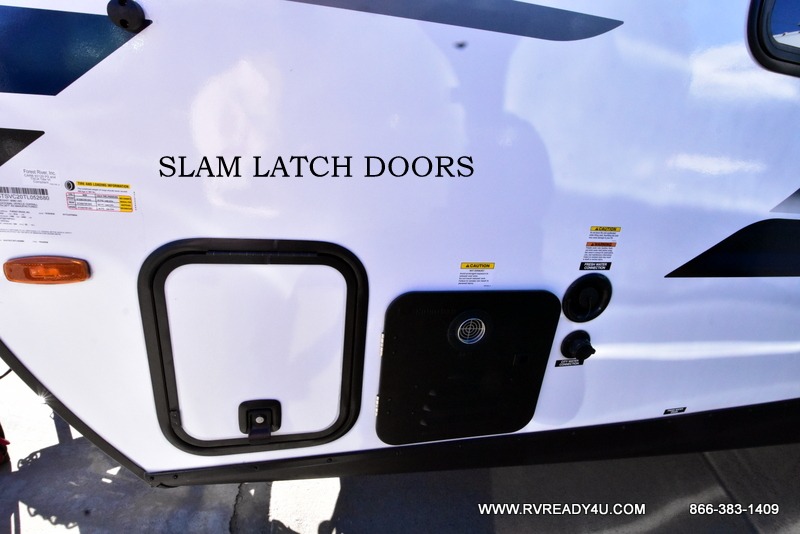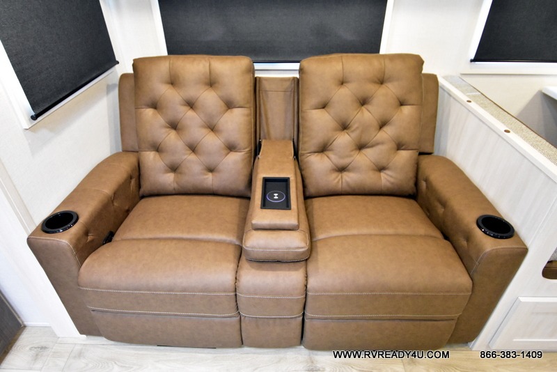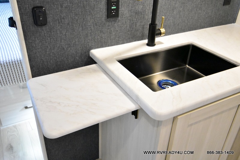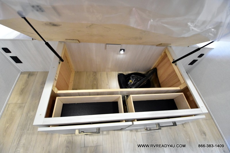 No need to rough it when you camp; this trailer offers amenities that allow you to "Glamp" if you want! The rear spacious bathroom is tucked away behind a beautiful barn door, and inside features a shower, wardrobe, and linen storage. The front master bedroom offers privacy, a walk-around custom king bed, dual wardrobes and underbed storage, plus TV prep if you want the option to watch movies in bed. The L-shaped counter in the kitchen provides enough space to have everything at your fingertips while you cook, plus there is a countertop extension for more prep and serving space if needed. A nice walk-in pantry just inside the entry door will be perfect for chips and snacks or canned goods for those longer camping trips. If dining inside, the booth dinette with pull-out dinette drawers will be comfortable plus you will enjoy the view provided by the panoramic windows within the slide out. An outside kitchen will be a favorite for anyone that cooks, and the 19' awning will provide some protection and offering an outdoor living area to enjoy with everyone.
