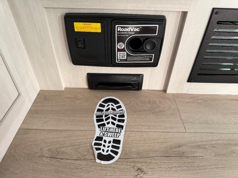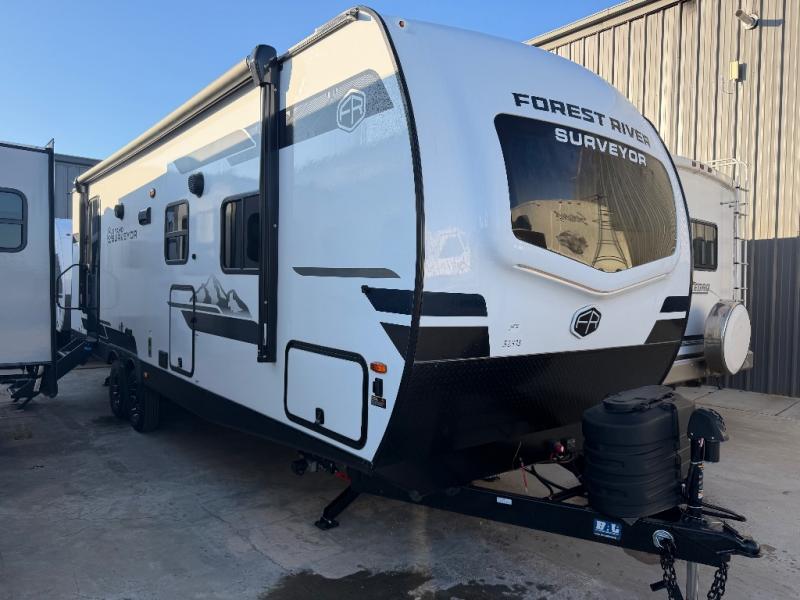 With any Grand Surveyor travel trailer by Forest River you will enjoy turn-key ready-to-go features and quality construction! Each model includes Azdel composite walls and a gel coated fiberglass front cap with an automotive style tinted windshield for a sleek look. There are friction hinge black glass entry door(s), an adjustable platform step with a night light, plus Goodyear tires and a power tongue jack for easy towing. The interior will have you feeling right at home with roller shades, residential faucets, sinks, and bathroom vanity, plus Surf(x) seamless countertops throughout. You can also plan for adventure with a 2" rear accessory and exterior spray port, and there are slam latch exterior baggage doors throughout to keep all your gear secure. Other stand-out features include a central vacuum system, a 200 watt solar panel with a 30 amp controller, a tankless water heater, carpet-free interiors, and the list goes on!