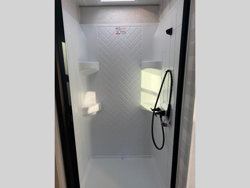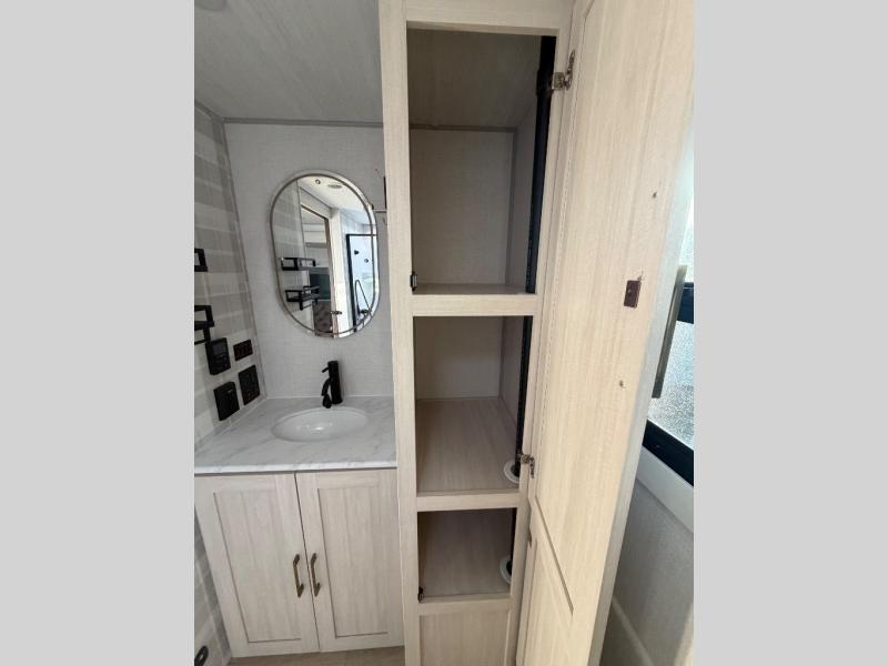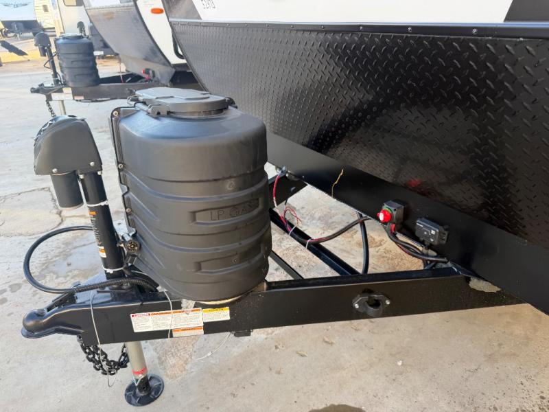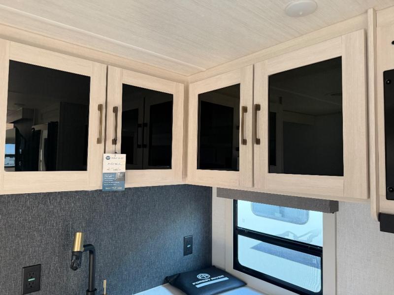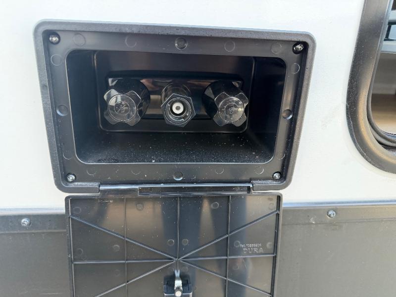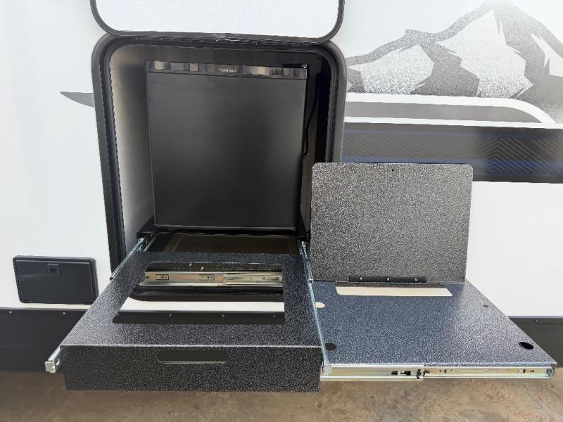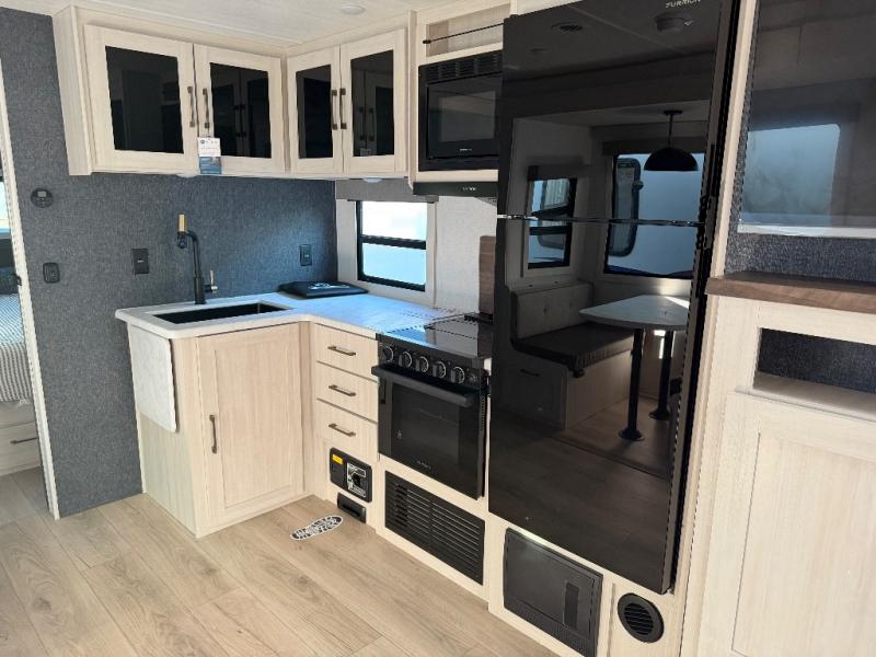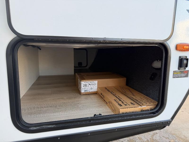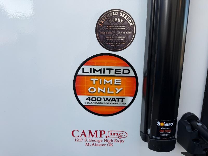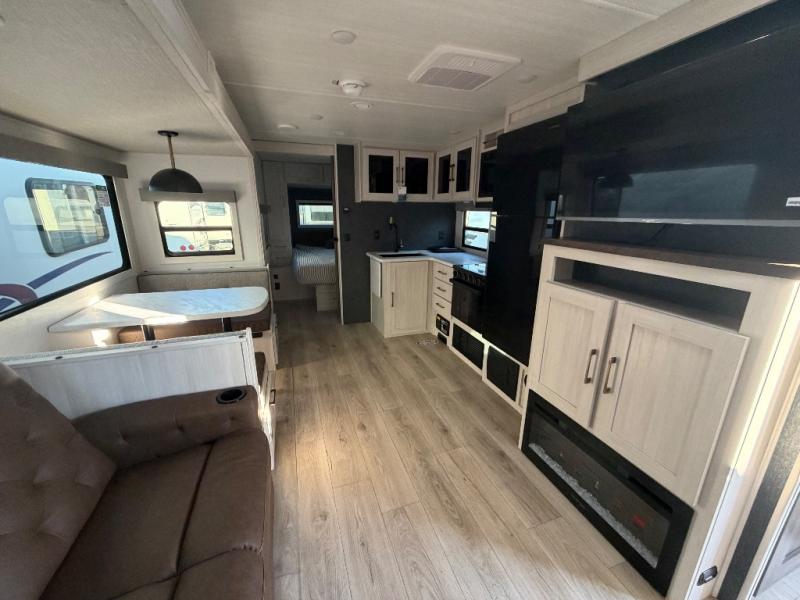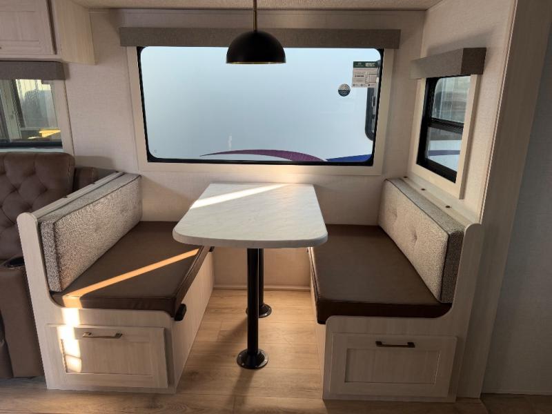 No need to rough it when you camp; this trailer offers amenities that allow you to "Glamp" if you want! The rear spacious bathroom is tucked away behind a beautiful barn door, and inside features a shower, wardrobe, and linen storage. The front master bedroom offers privacy, a walk-around custom king bed, dual wardrobes and underbed storage, plus TV prep if you want the option to watch movies in bed. The L-shaped counter in the kitchen provides enough space to have everything at your fingertips while you cook, plus there is a countertop extension for more prep and serving space if needed. A nice walk-in pantry just inside the entry door will be perfect for chips and snacks or canned goods for those longer camping trips. If dining inside, the booth dinette with pull-out dinette drawers will be comfortable plus you will enjoy the view provided by the panoramic windows within the slide out. An outside kitchen will be a favorite for anyone that cooks, and the 19' awning will provide some protection from the elements and offering an outdoor living area to enjoy with everyone.