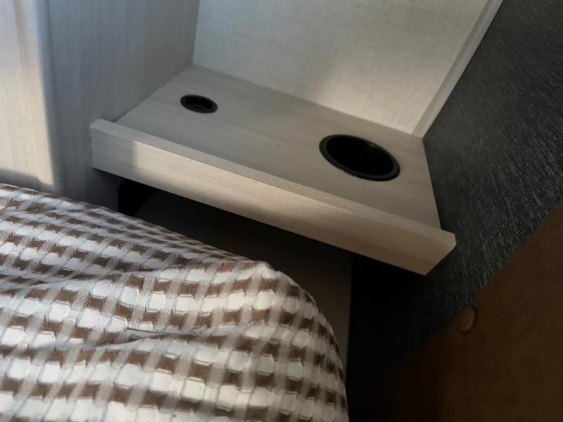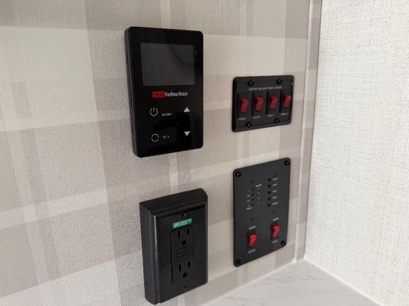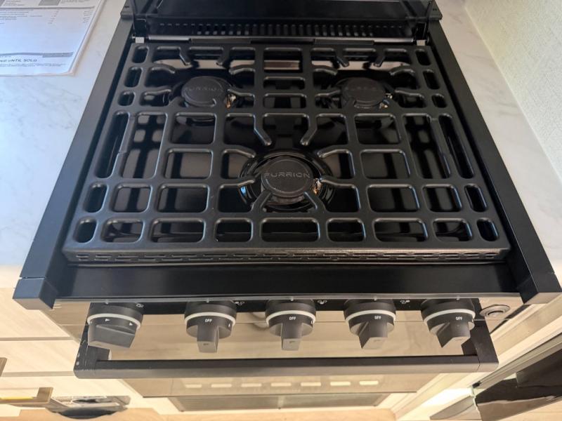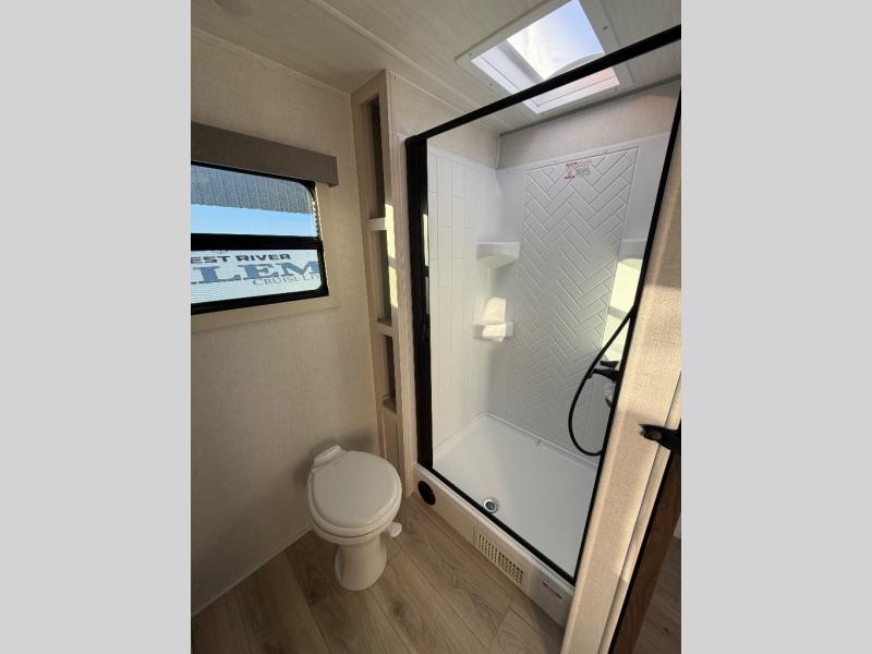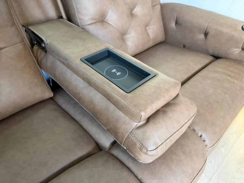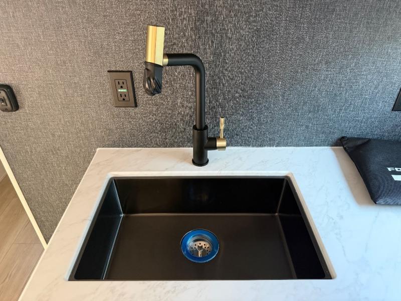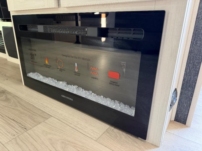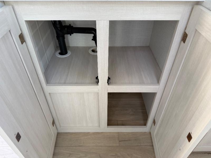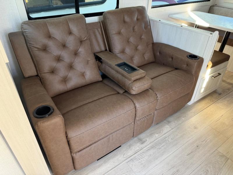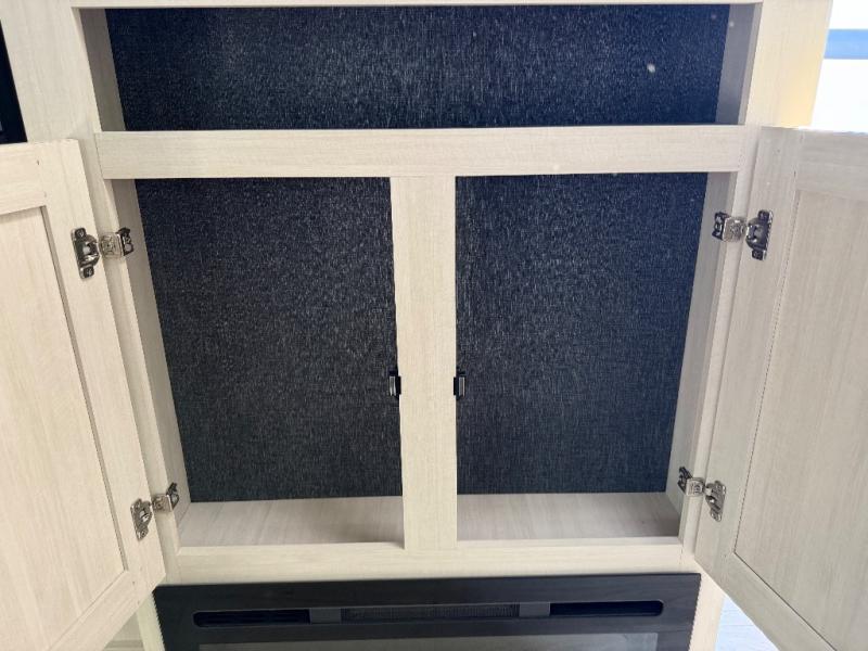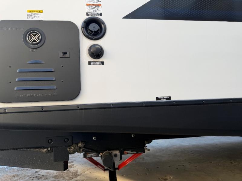 No need to rough it when you camp; this trailer offers amenities that allow you to "Glamp" if you want! The rear spacious bathroom is tucked away behind a beautiful barn door, and inside features a shower, wardrobe, and linen storage. The front master bedroom offers privacy, a walk-around custom king bed, dual wardrobes and underbed storage, plus TV prep if you want the option to watch movies in bed. The L-shaped counter in the kitchen provides enough space to have everything at your fingertips while you cook, plus there is a countertop extension for more prep and serving space if needed. A nice walk-in pantry just inside the entry door will be perfect for chips and snacks or canned goods for those longer camping trips. If dining inside, the booth dinette with pull-out dinette drawers will be comfortable plus you will enjoy the view provided by the panoramic windows within the slide out. An outside kitchen will be a favorite for anyone that cooks, and the 19' awning will provide some protection from the elements and offering an outdoor living area to enjoy with everyone.
