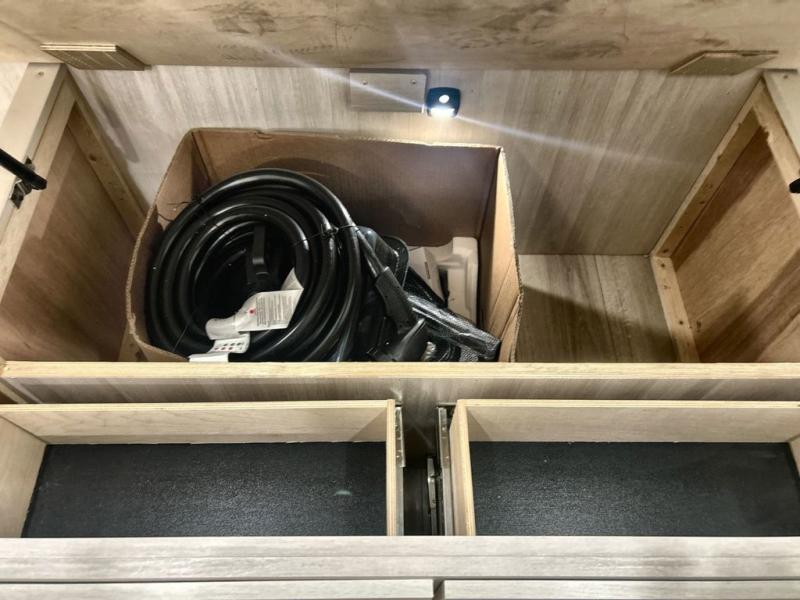 No need to rough it when you camp; this trailer offers amenities that allow you to "Glamp" if you want! The rear spacious bathroom is tucked away behind a beautiful barn door, and inside features a shower, wardrobe, and linen storage. The front master bedroom offers privacy, a walk-around custom king bed, dual wardrobes and underbed storage, plus TV prep if you want the option to watch movies in bed. The L-shaped counter in the kitchen provides enough space to have everything at your fingertips while you cook, plus there is a countertop extension for more prep and serving space if needed. A nice walk-in pantry just inside the entry door will be perfect for chips and snacks or canned goods for those longer camping trips. If dining inside, the booth dinette with pull-out dinette drawers will be comfortable plus you will enjoy the view provided by the panoramic windows within the slide out. An outside kitchen will be a favorite for anyone that cooks, and the 19' awning will provide some protection from the elements and offering an outdoor living area to enjoy with everyone.