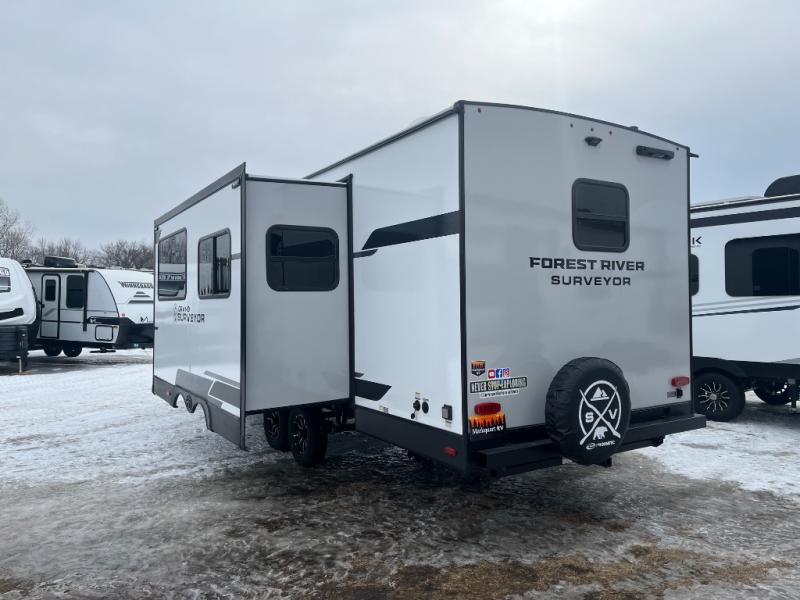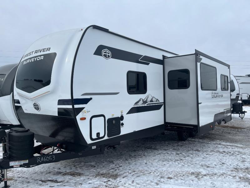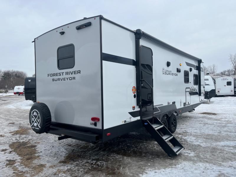 With any Grand Surveyor travel trailer by Forest River you will enjoy turn-key ready-to-go features and quality construction! Each model includes Azdel composite walls and a gel coated fiberglass front cap with an automotive style tinted windshield for a sleek look. There are friction hinge black glass entry door(s), an adjustable platform step with a night light, plus Goodyear tires and a power tongue jack for easy towing. The interior will have you feeling right at home with roller shades, residential faucets, sinks, and bathroom vanity, plus Surf(x) seamless countertops throughout. You can also plan for adventure with a 2" rear accessory and exterior spray port, and there are slam latch exterior baggage doors throughout to keep all your gear secure. Other stand-out features include a central vacuum system, a 200 watt solar panel with a 30 amp controller, a tankless water heater, carpet-free interiors, and the list goes on!