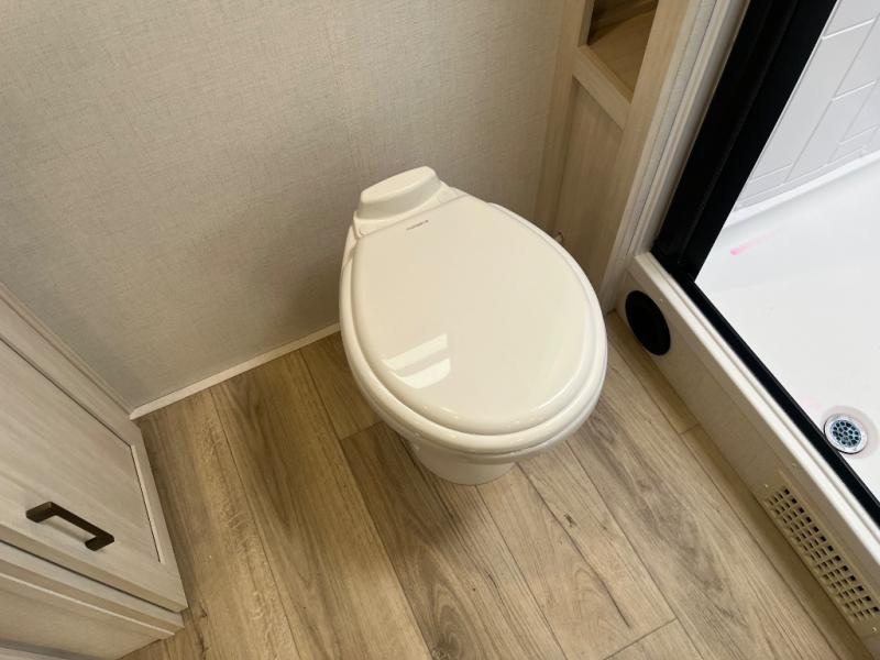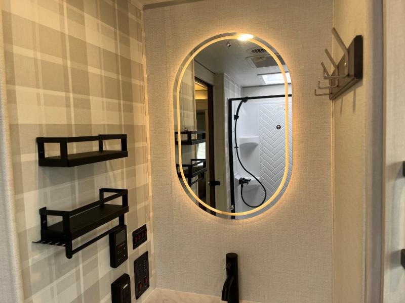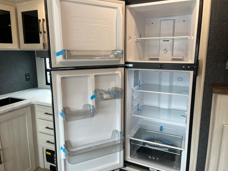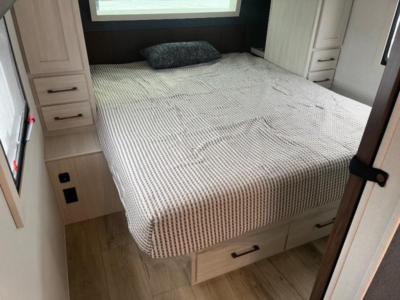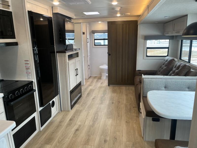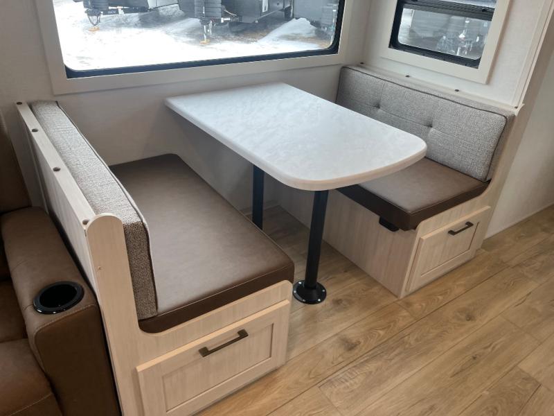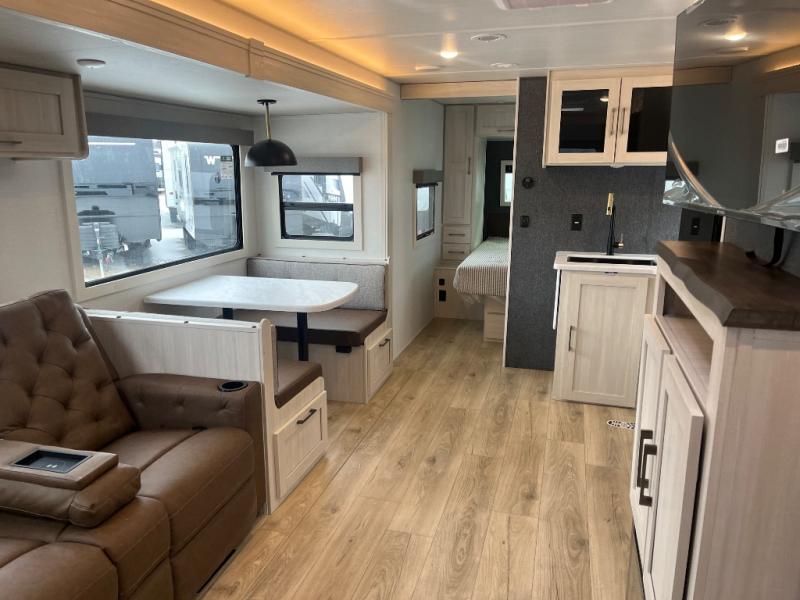No need to rough it when you camp; this trailer offers amenities that allow you to "Glamp" if you want! The rear spacious bathroom is tucked away behind a beautiful barn door, and inside features a shower, wardrobe, and linen storage. The front master bedroom offers privacy, a walk-around custom king bed, dual wardrobes and underbed storage, plus TV prep if you want the option to watch movies in bed. The L-shaped counter in the kitchen provides enough space to have everything at your fingertips while you cook, plus there is a countertop extension for more prep and serving space if needed. A nice walk-in pantry just inside the entry door will be perfect for chips and snacks or canned goods for those longer camping trips. If dining inside, the booth dinette with pull-out dinette drawers will be comfortable plus you will enjoy the view provided by the panoramic windows within the slide out. An outside kitchen will be a favorite for anyone that cooks, and the 19' awning will provide some protection and offering an outdoor living area to enjoy with everyone.