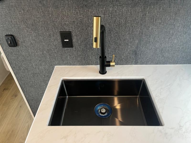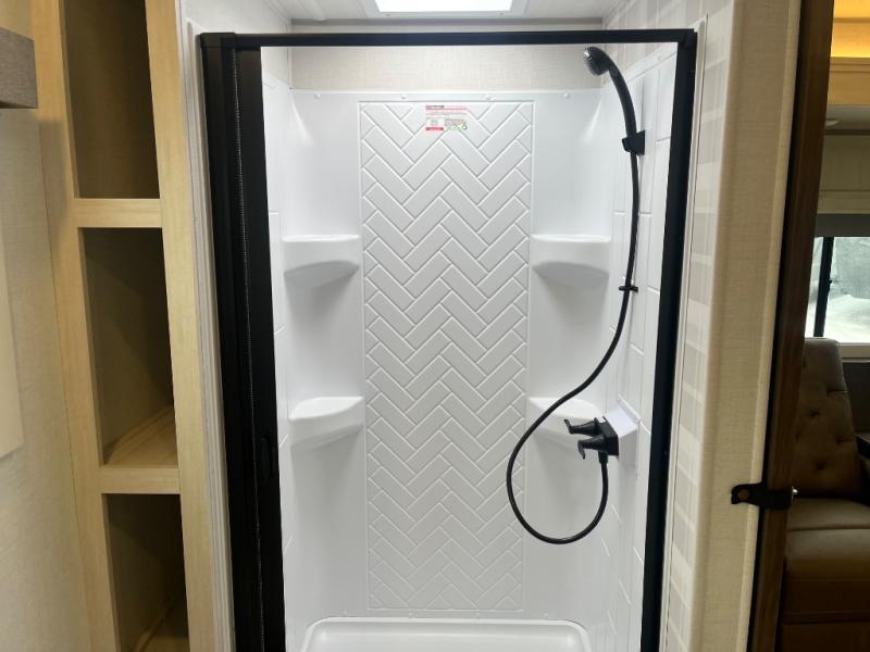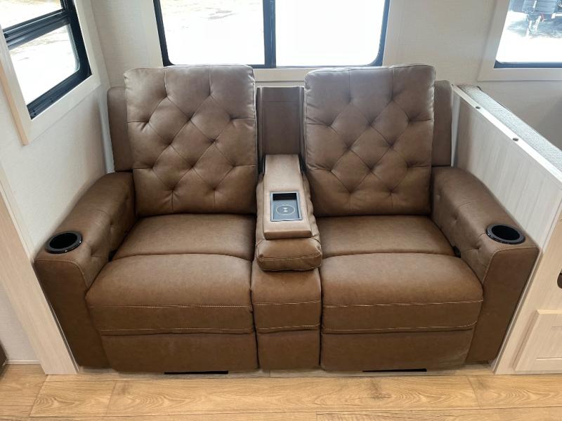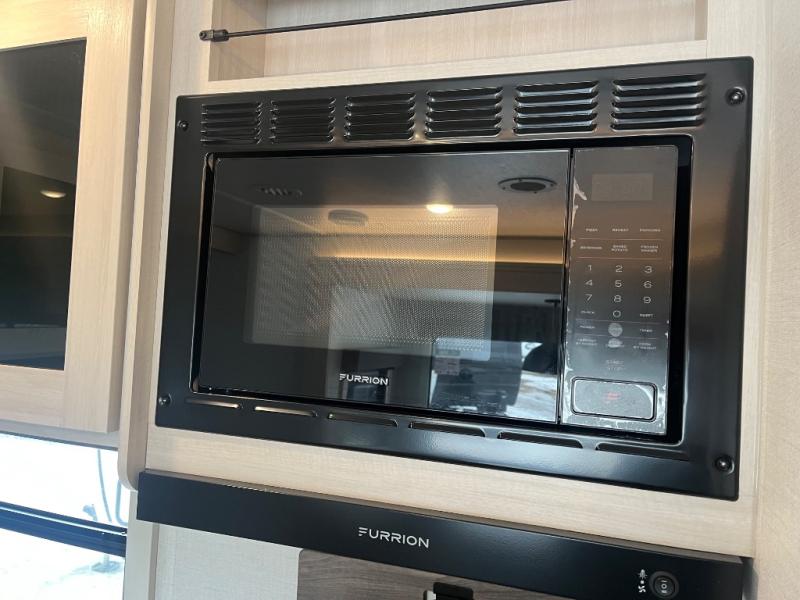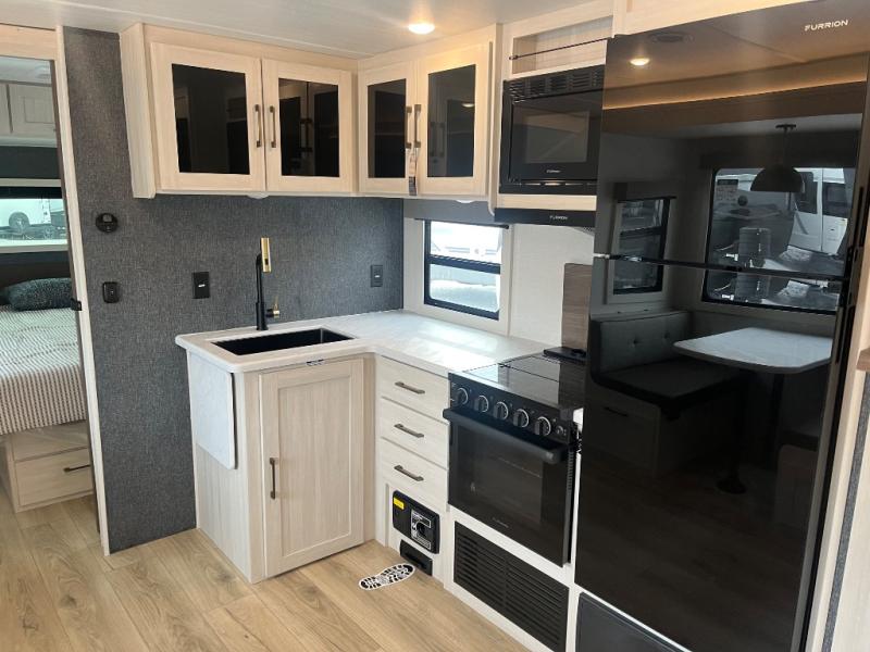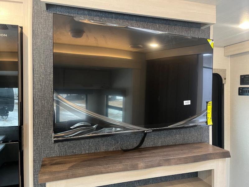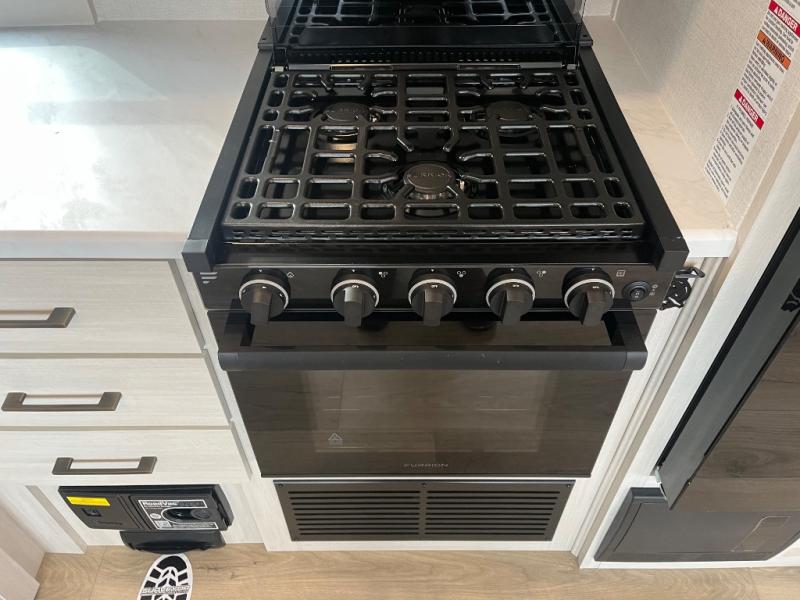 No need to rough it when you camp; this trailer offers amenities that allow you to "Glamp" if you want! The rear spacious bathroom is tucked away behind a beautiful barn door, and inside features a shower, wardrobe, and linen storage. The front master bedroom offers privacy, a walk-around custom king bed, dual wardrobes and underbed storage, plus TV prep if you want the option to watch movies in bed. The L-shaped counter in the kitchen provides enough space to have everything at your fingertips while you cook, plus there is a countertop extension for more prep and serving space if needed. A nice walk-in pantry just inside the entry door will be perfect for chips and snacks or canned goods for those longer camping trips. If dining inside, the booth dinette with pull-out dinette drawers will be comfortable plus you will enjoy the view provided by the panoramic windows within the slide out. An outside kitchen will be a favorite for anyone that cooks, and the 19' awning will provide some protection and offering an outdoor living area to enjoy with everyone.