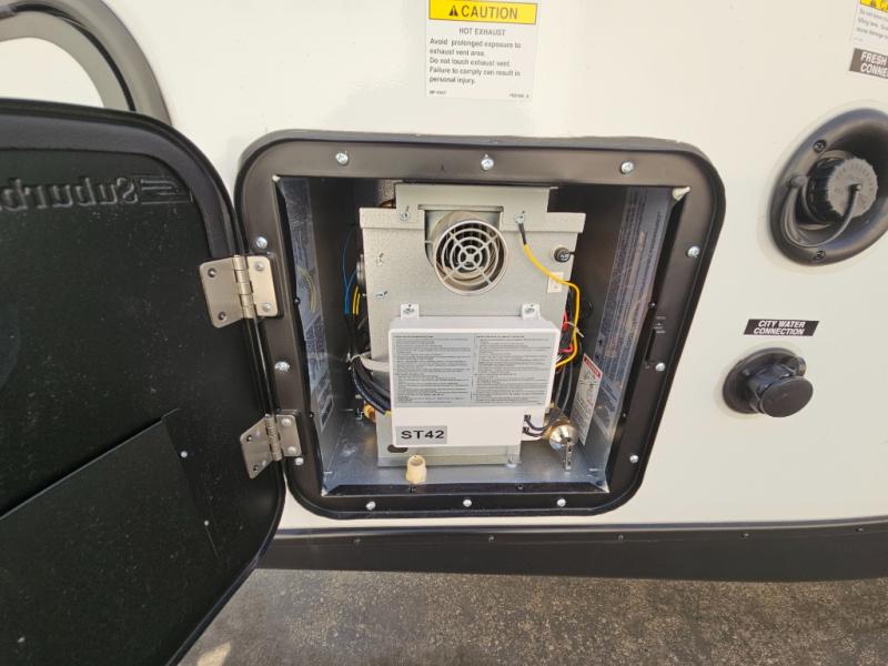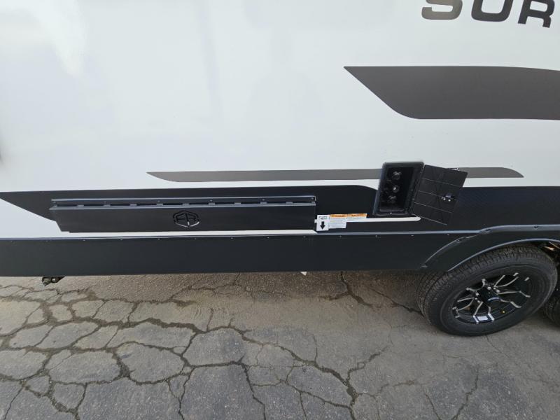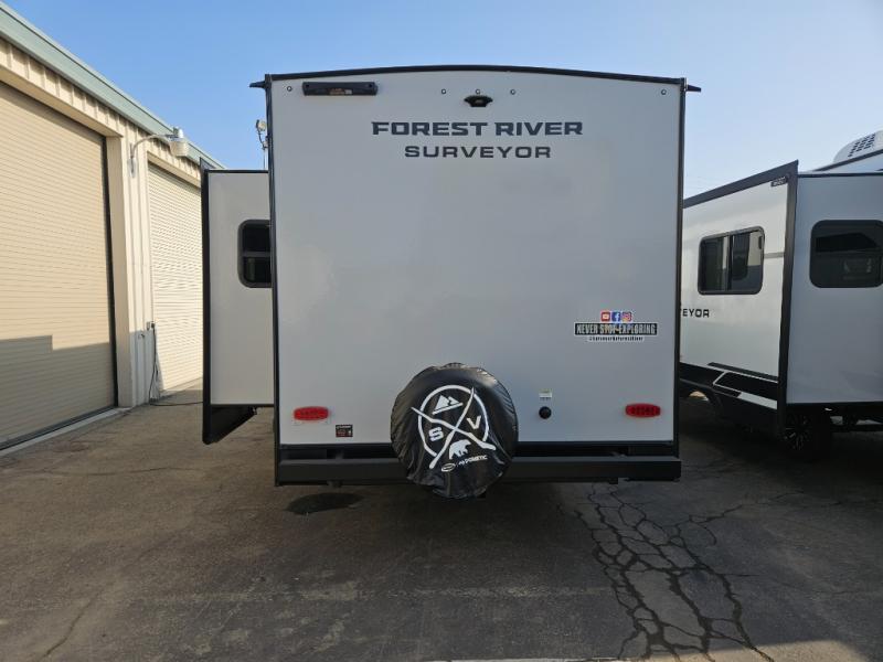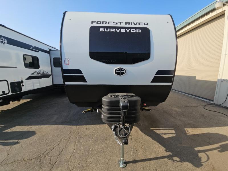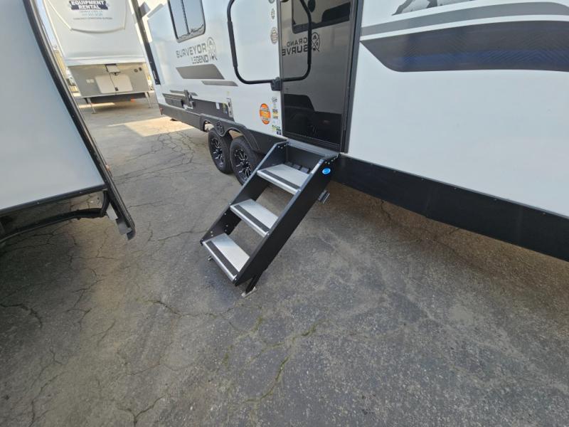With any Grand Surveyor travel trailer by Forest River you will enjoy turn-key ready-to-go features and quality construction! Each model includes Azdel composite walls and a gel coated fiberglass front cap with an automotive style tinted windshield for a sleek look. There are friction hinge black glass entry door(s), an adjustable platform step with a night light, plus Goodyear tires and a power tongue jack for easy towing. The interior will have you feeling right at home with roller shades, residential faucets, sinks, and bathroom vanity, plus Surf(x) seamless countertops throughout. You can also plan for adventure with a 2" rear accessory and exterior spray port, and there are slam latch exterior baggage doors throughout to keep all your gear secure. Other stand-out features include a central vacuum system, a 200 watt solar panel with a 30 amp controller, a tankless water heater, carpet-free interiors, and the list goes on!