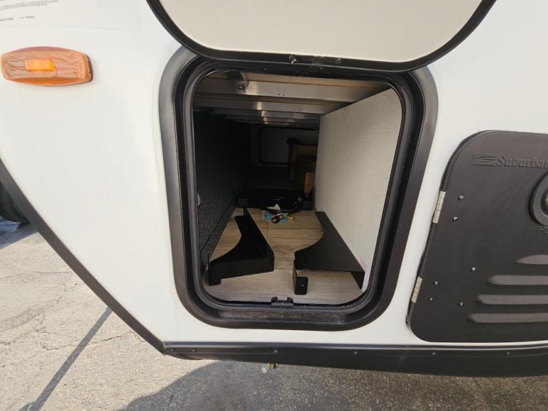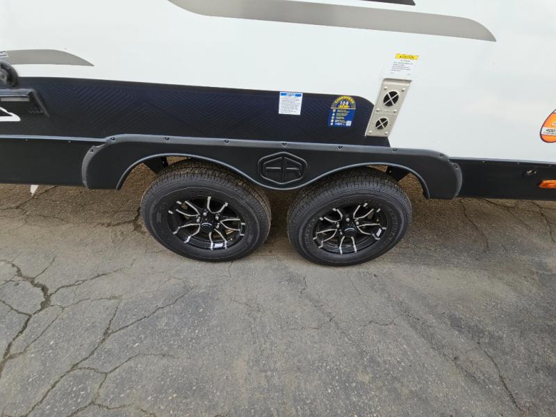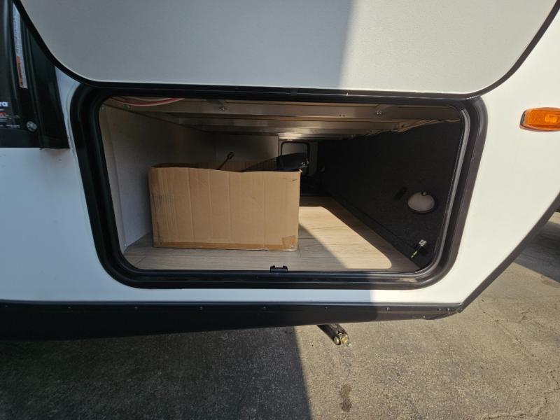 No need to rough it when you camp; this trailer offers amenities that allow you to "Glamp" if you want! The rear spacious bathroom is tucked away behind a beautiful barn door, and inside features a shower, wardrobe, and linen storage. The front master bedroom offers privacy, a walk-around custom king bed, dual wardrobes and underbed storage, plus TV prep if you want the option to watch movies in bed. The L-shaped counter in the kitchen provides enough space to have everything at your fingertips while you cook, plus there is a countertop extension for more prep and serving space if needed. A nice walk-in pantry just inside the entry door will be perfect for chips and snacks or canned goods for those longer camping trips. If dining inside, the booth dinette with pull-out dinette drawers will be comfortable plus you will enjoy the view provided by the panoramic windows within the slide out. An outside kitchen will be a favorite for anyone that cooks, and the 19' awning will provide some protection and offering an outdoor living area to enjoy with everyone.