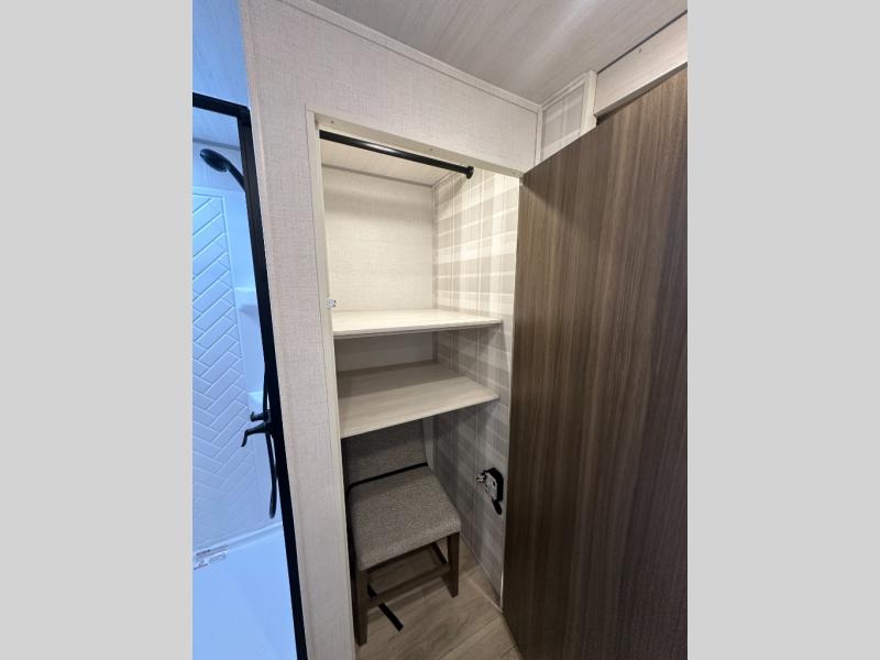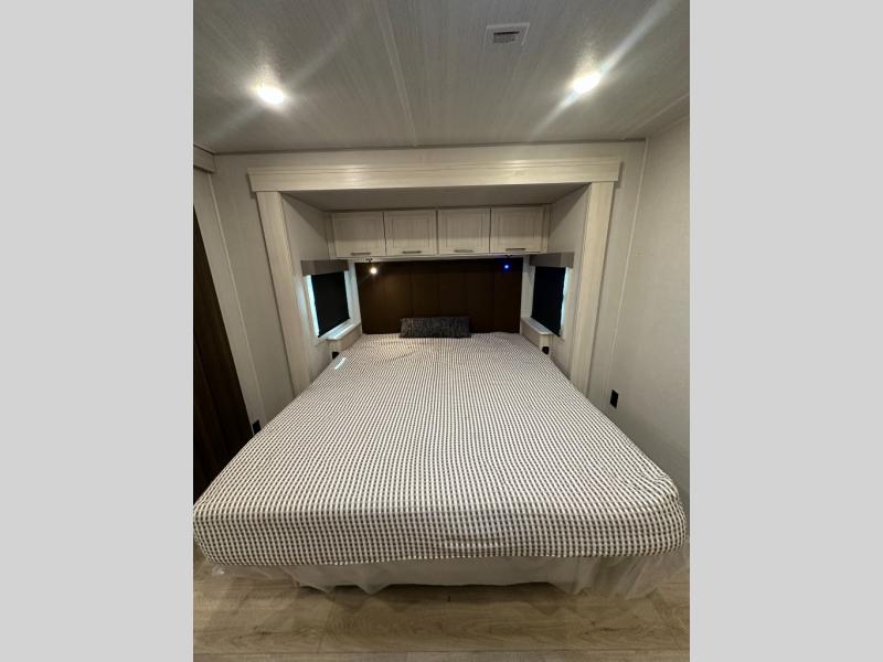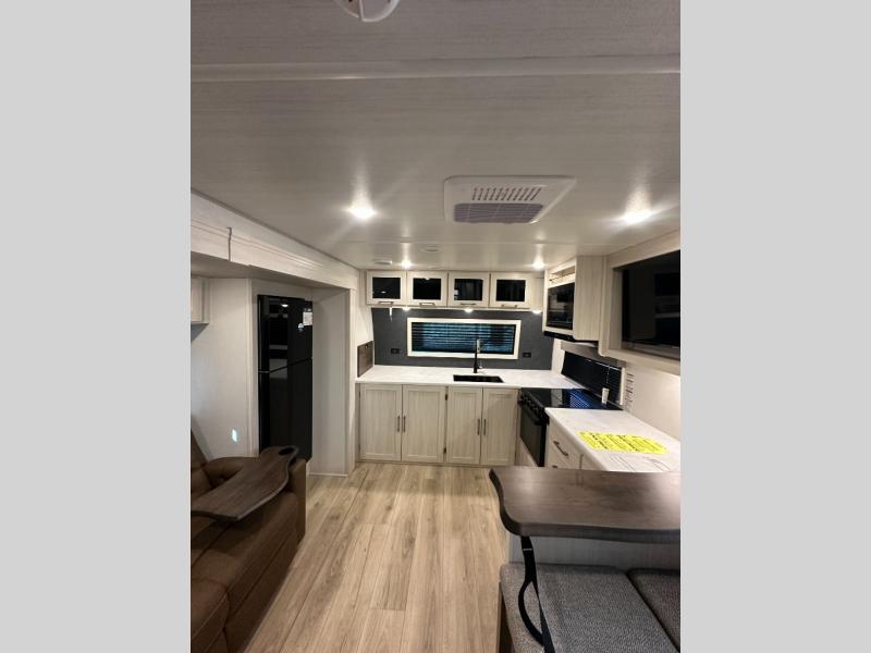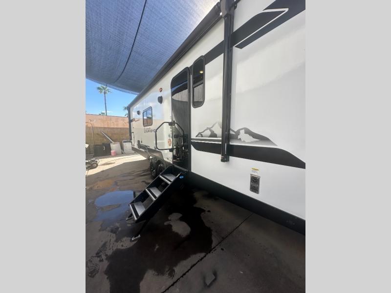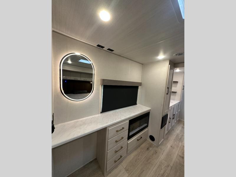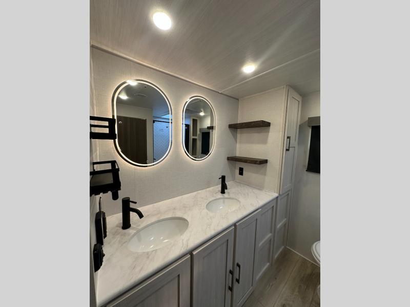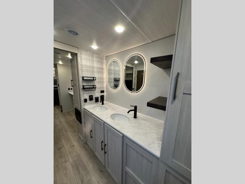 This couple's trailer will be giving you all the glamping vibes! There is a front kitchen with ample counter space, along with a counter with two bar stools, a central vacuum to easily clean up, and a slide out for more space! The second slide out is found in the middle master bedroom where you'll also enjoy a custom king bed across from a bedroom fireplace, a wardrobe, and a dresser with TV prep. Head towards the back and you'll be wowed by the full bath with dual bath sinks, an upgraded slow-close shower door, and a closet with washer and dryer prep. The exterior is just as impressive as the interior with its outside kitchen, 20' power awning with LED lights, pass-through storage, TV coax, and so much more!