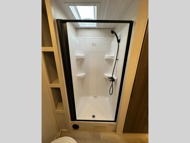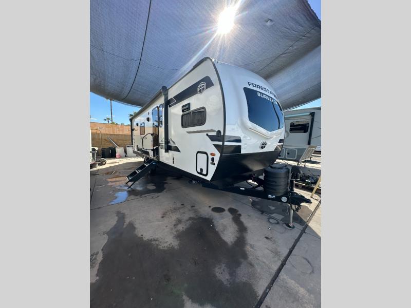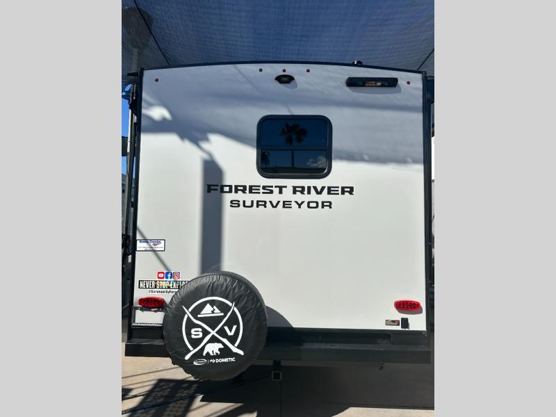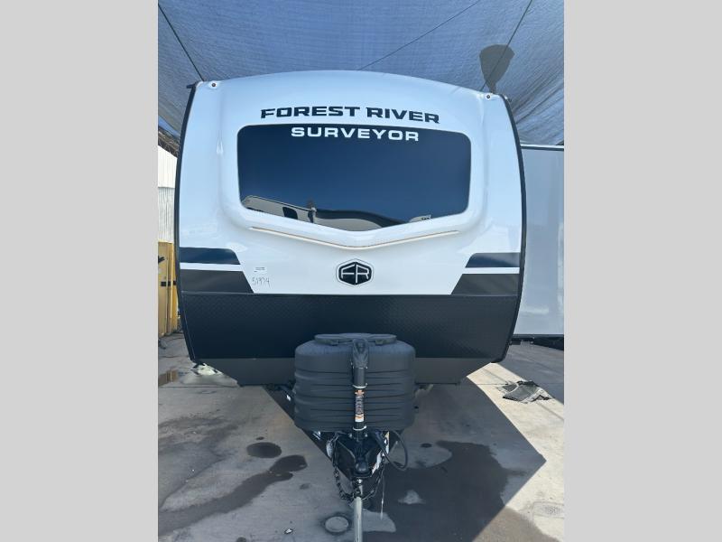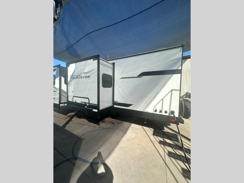 With any Grand Surveyor travel trailer by Forest River you will enjoy turn-key ready-to-go features and quality construction! Each model includes Azdel composite walls and a gel coated fiberglass front cap with an automotive style tinted windshield for a sleek look. There are friction hinge black glass entry door(s), an adjustable platform step with a night light, plus Goodyear tires and a power tongue jack for easy towing. The interior will have you feeling right at home with roller shades, residential faucets, sinks, and bathroom vanity, plus Surf(x) seamless countertops throughout. You can also plan for adventure with a 2" rear accessory and exterior spray port, and there are slam latch exterior baggage doors throughout to keep all your gear secure. Other stand-out features include a central vacuum system, a 200 watt solar panel with a 30 amp controller, a tankless water heater, carpet-free interiors, and the list goes on!