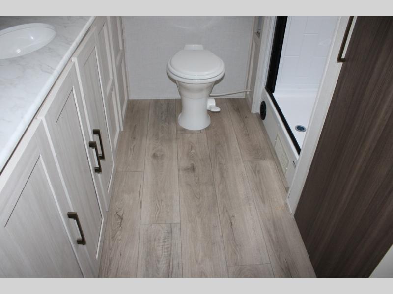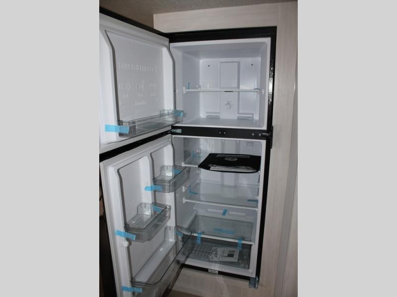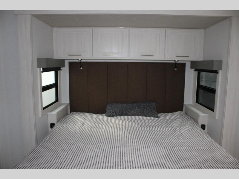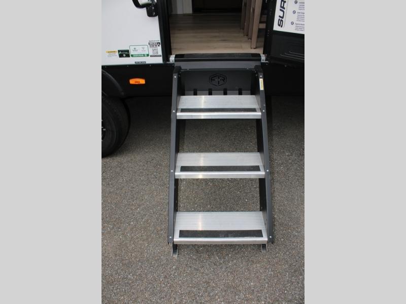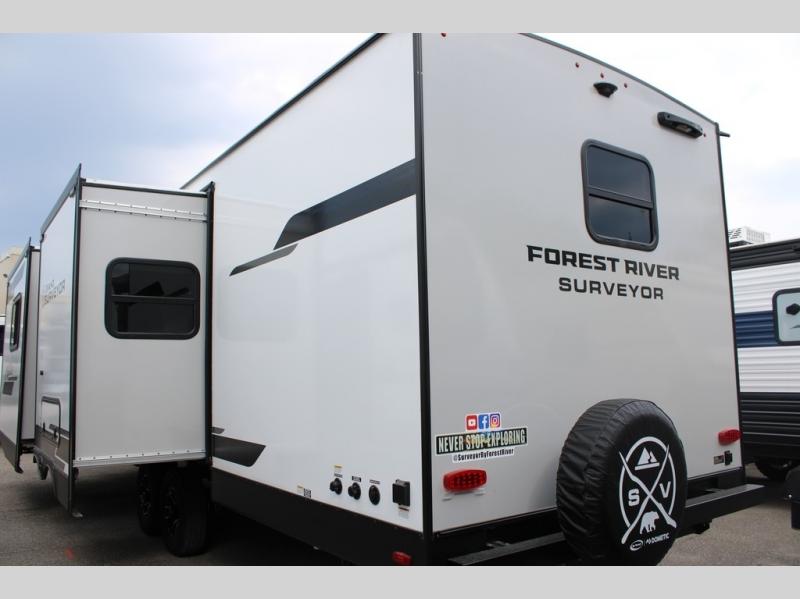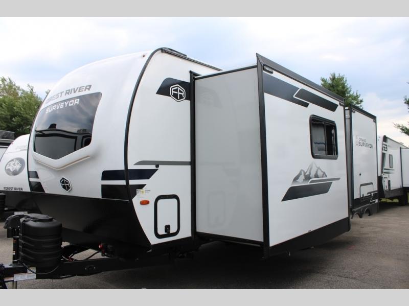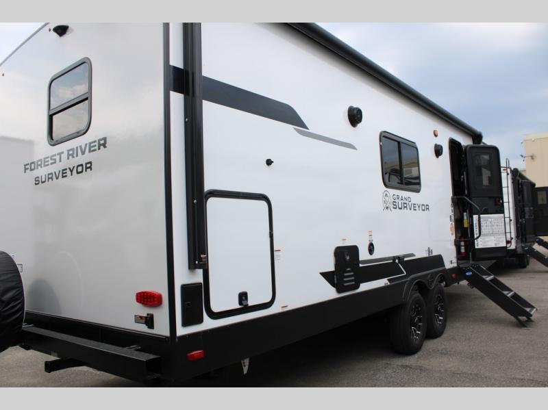 With any Grand Surveyor travel trailer by Forest River you will enjoy turn-key ready-to-go features and quality construction! Each model includes Azdel composite walls and a gel coated fiberglass front cap with an automotive style tinted windshield for a sleek look. There are friction hinge black glass entry door(s), an adjustable platform step with a night light, plus Goodyear tires and a power tongue jack for easy towing. The interior will have you feeling right at home with roller shades, residential faucets, sinks, and bathroom vanity, plus Surf(x) seamless countertops throughout. You can also plan for adventure with a 2" rear accessory and exterior spray port, and there are slam latch exterior baggage doors throughout to keep all your gear secure. Other stand-out features include a central vacuum system, a 200 watt solar panel with a 30 amp controller, a tankless water heater, carpet-free interiors, and the list goes on!