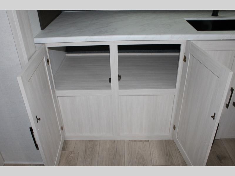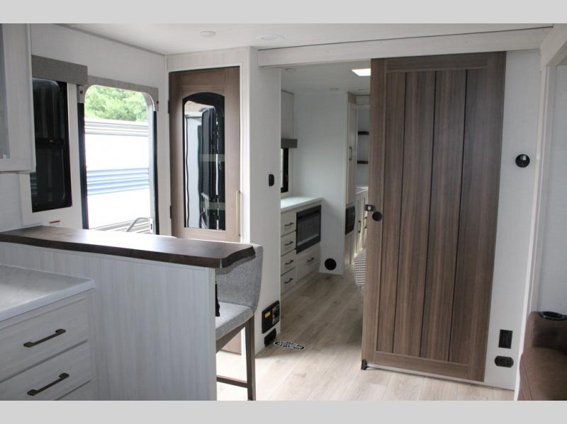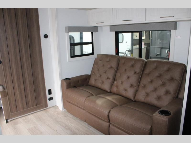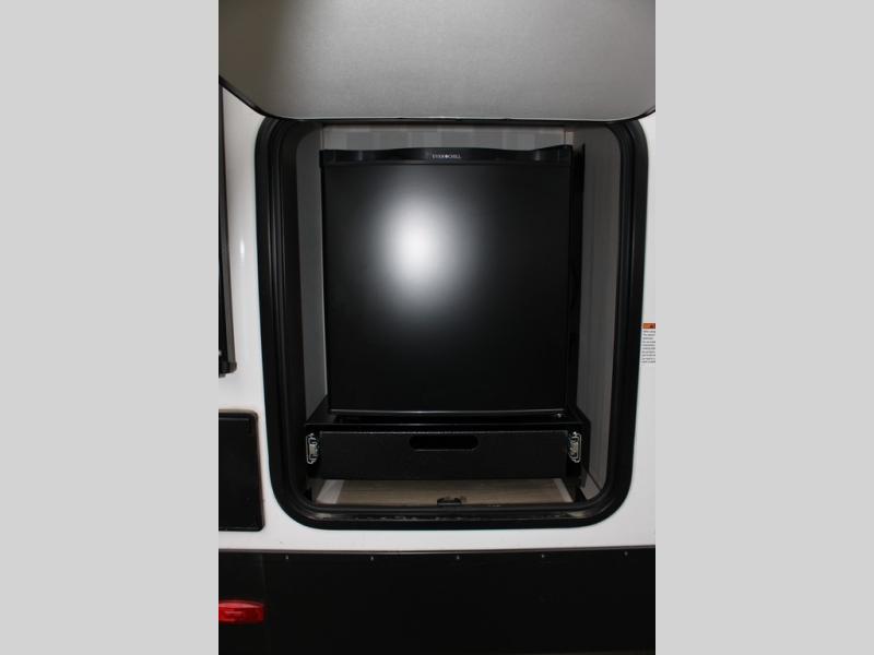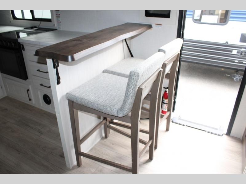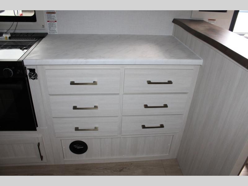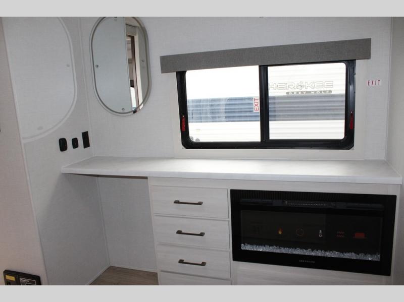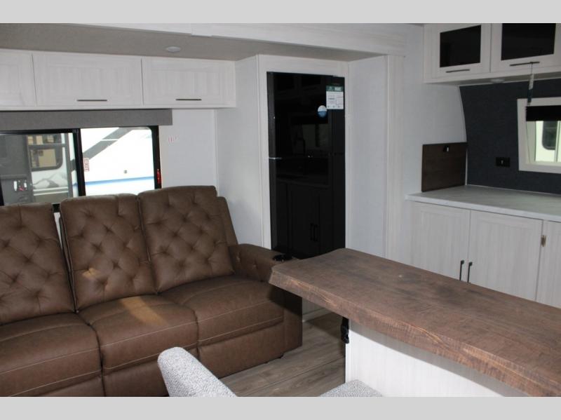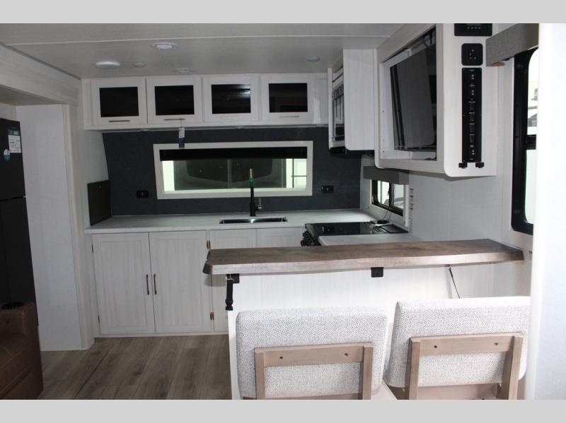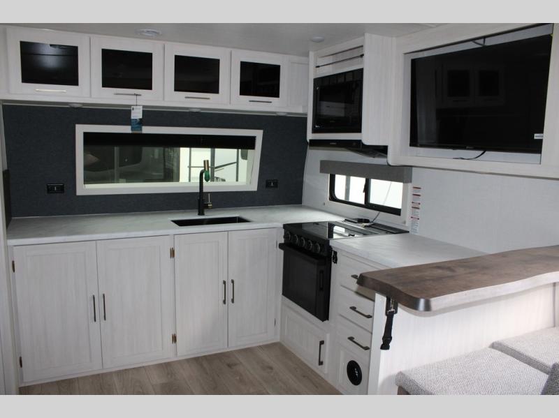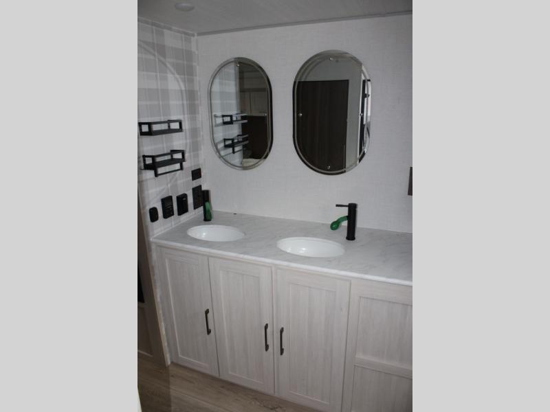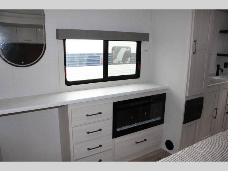 This couple's trailer will be giving you all the glamping vibes! There is a front kitchen with ample counter space, along with a counter with two bar stools, a central vacuum to easily clean up, and a slide out for more space! The second slide out is found in the middle master bedroom where you'll also enjoy a custom king bed across from a bedroom fireplace, a wardrobe, and a dresser with TV prep. Head towards the back and you'll be wowed by the full bath with dual bath sinks, an upgraded slow-close shower door, and a closet with washer and dryer prep. The exterior is just as impressive as the interior with its outside kitchen, 20' power awning with LED lights, pass-through storage, TV coax, and so much more!