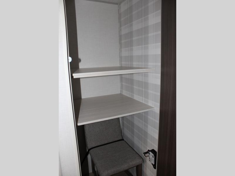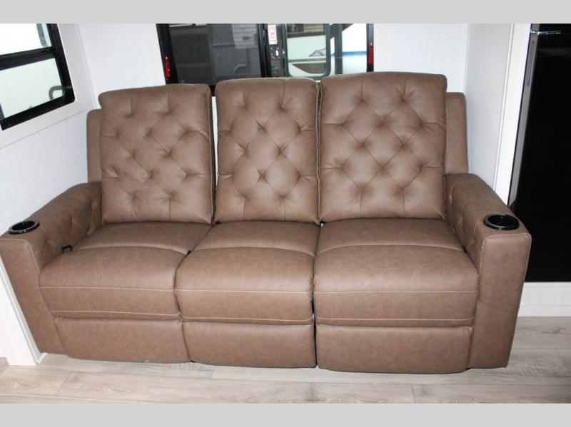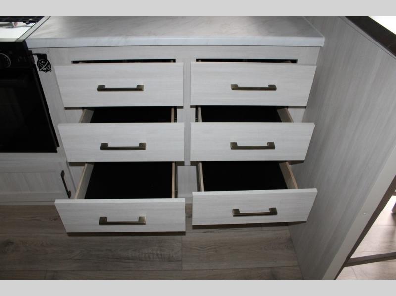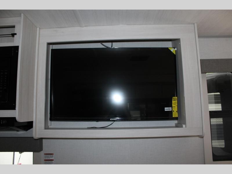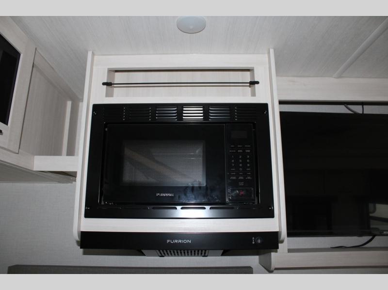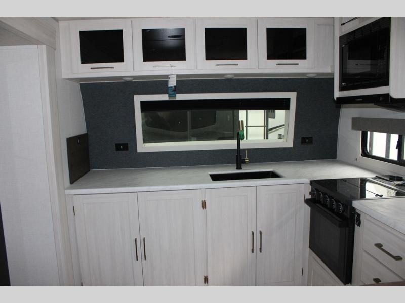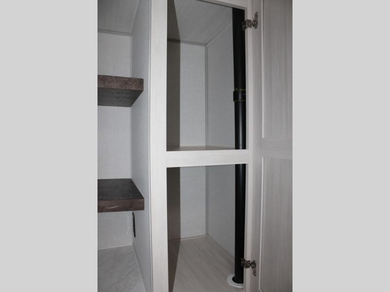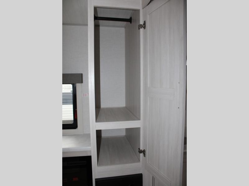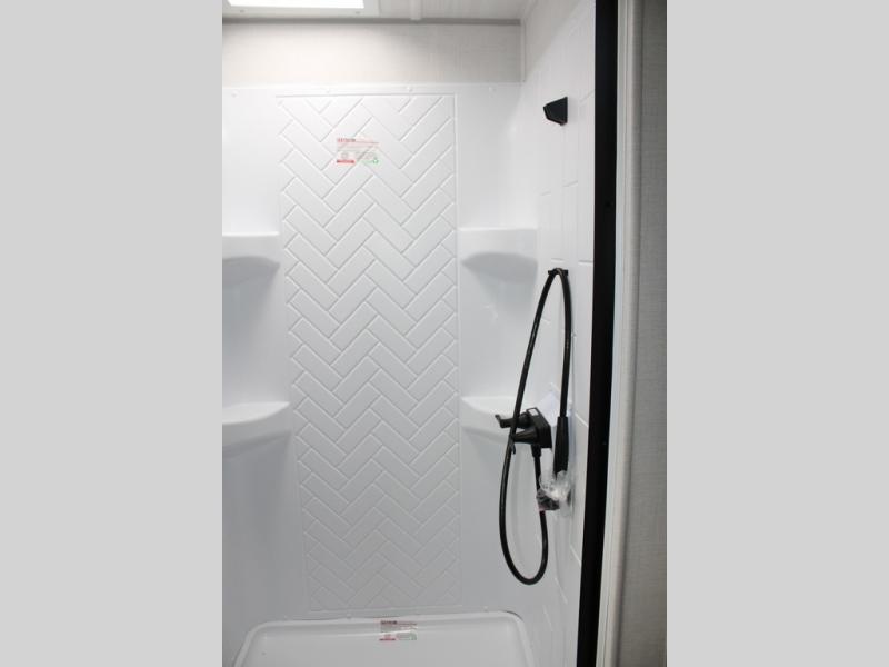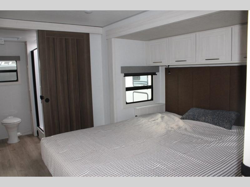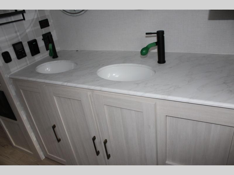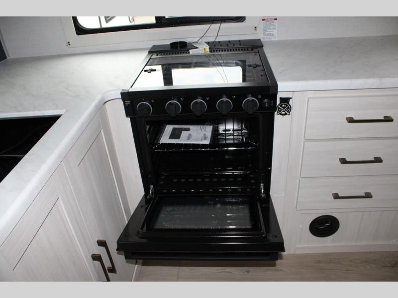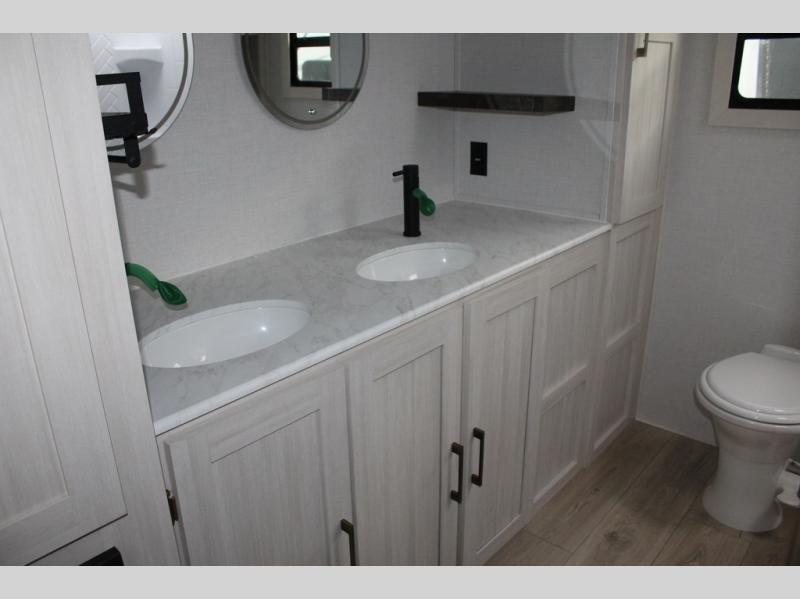 This couple's trailer will be giving you all the glamping vibes! There is a front kitchen with ample counter space, along with a counter with two bar stools, a central vacuum to easily clean up, and a slide out for more space! The second slide out is found in the middle master bedroom where you'll also enjoy a custom king bed across from a bedroom fireplace, a wardrobe, and a dresser with TV prep. Head towards the back and you'll be wowed by the full bath with dual bath sinks, an upgraded slow-close shower door, and a closet with washer and dryer prep. The exterior is just as impressive as the interior with its outside kitchen, 20' power awning with LED lights, pass-through storage, TV coax, and so much more!