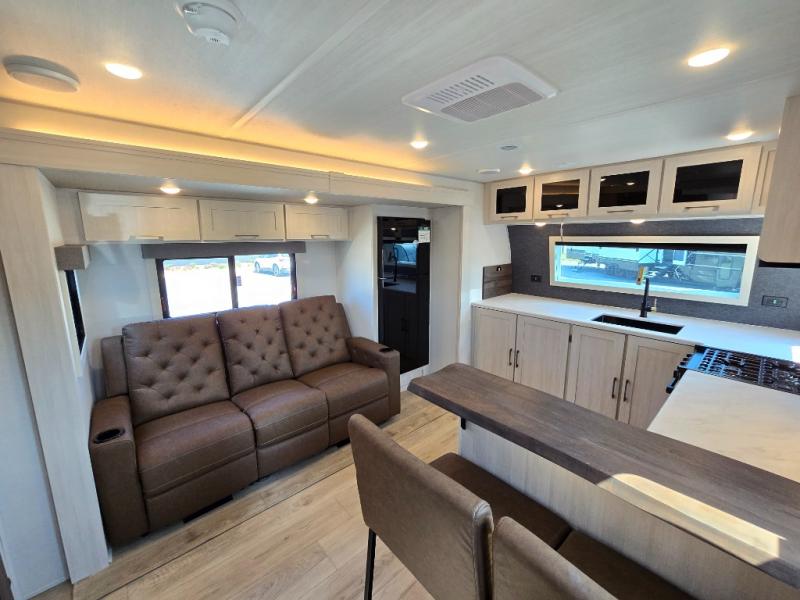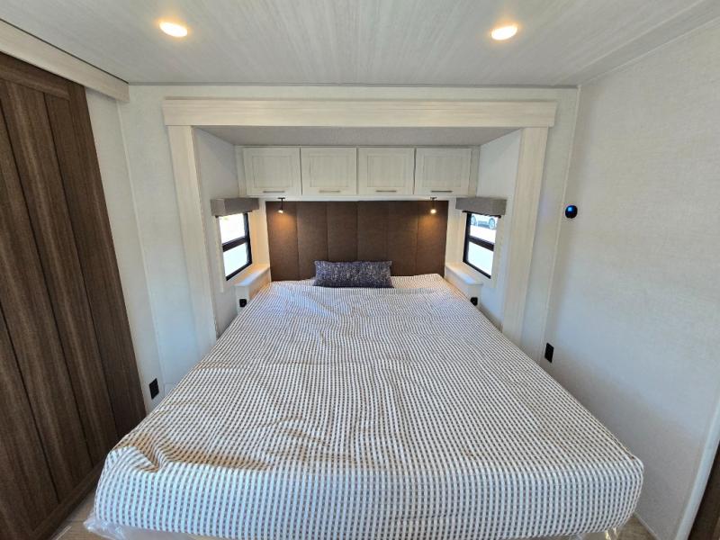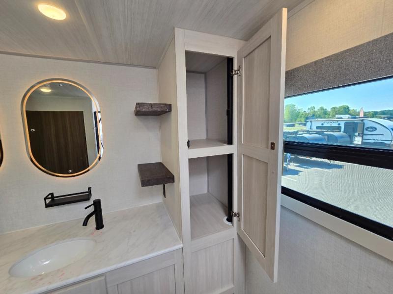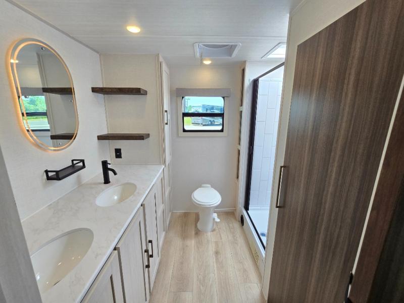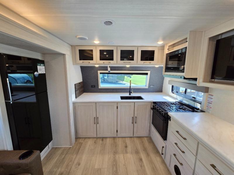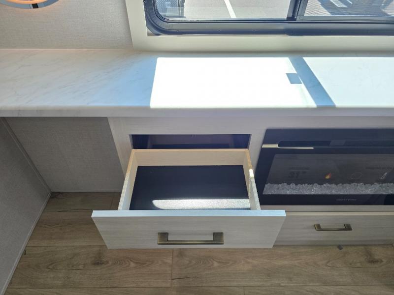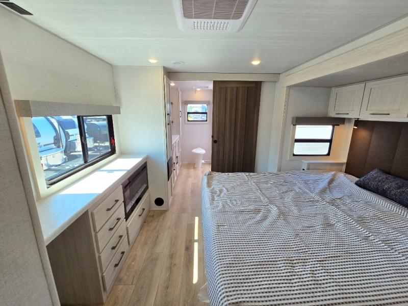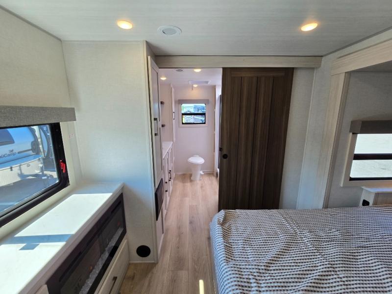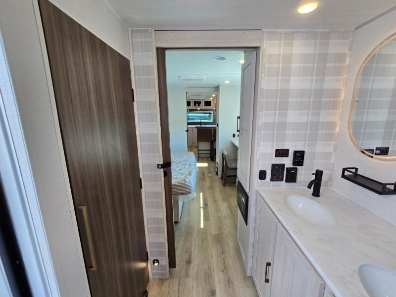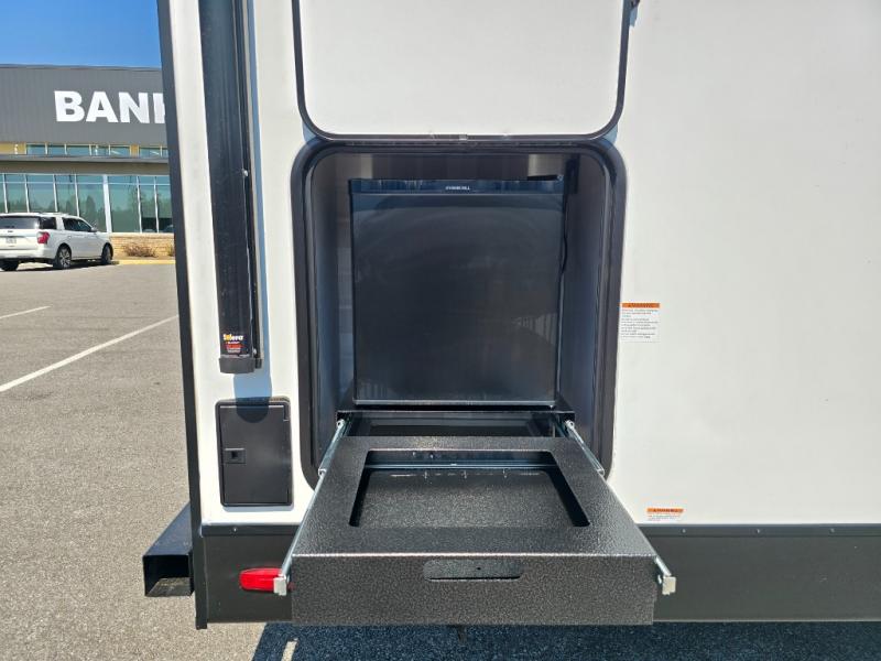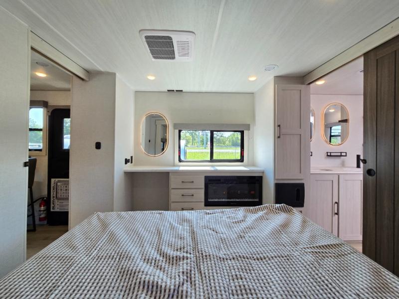 This couple's trailer will be giving you all the glamping vibes! There is a front kitchen with ample counter space, along with a counter with two bar stools, a central vacuum to easily clean up, and a slide out for more space! The second slide out is found in the middle master bedroom where you'll also enjoy a custom king bed across from a bedroom fireplace, a wardrobe, and a dresser with TV prep. Head towards the back and you'll be wowed by the full bath with dual bath sinks, an upgraded slow-close shower door, and a closet with washer and dryer prep. The exterior is just as impressive as the interior with its outside kitchen, 20' power awning with LED lights, pass-through storage, TV coax, and so much more!