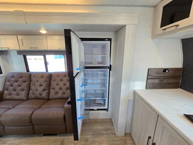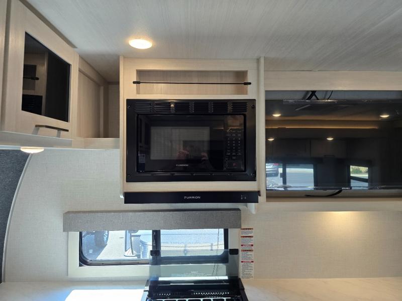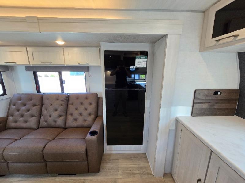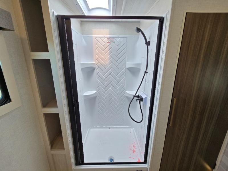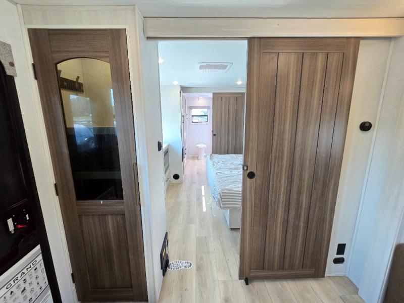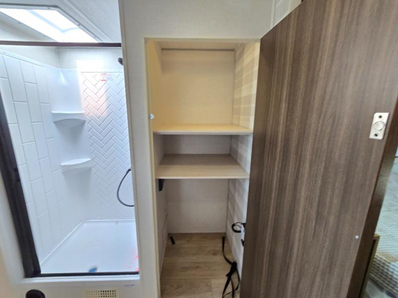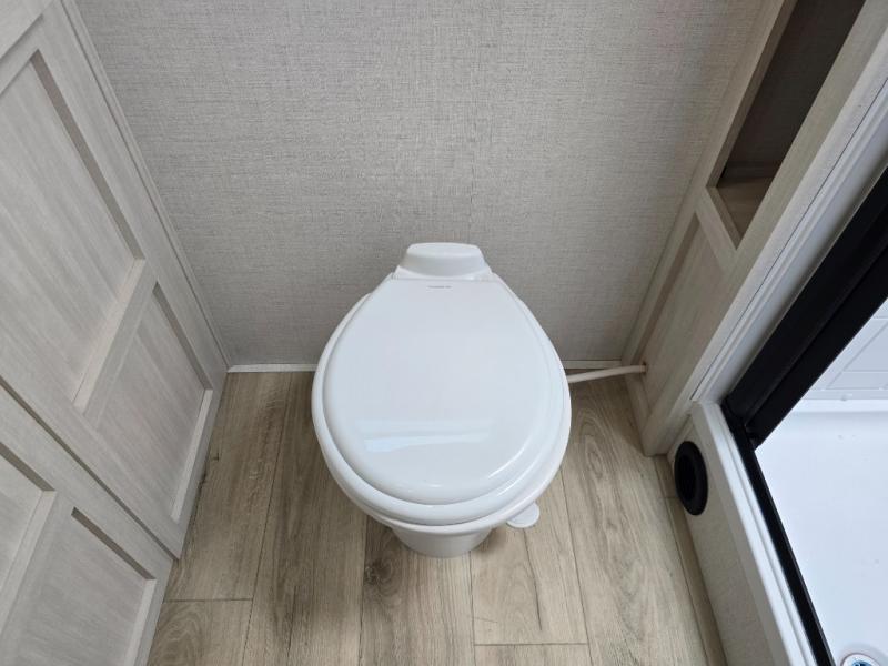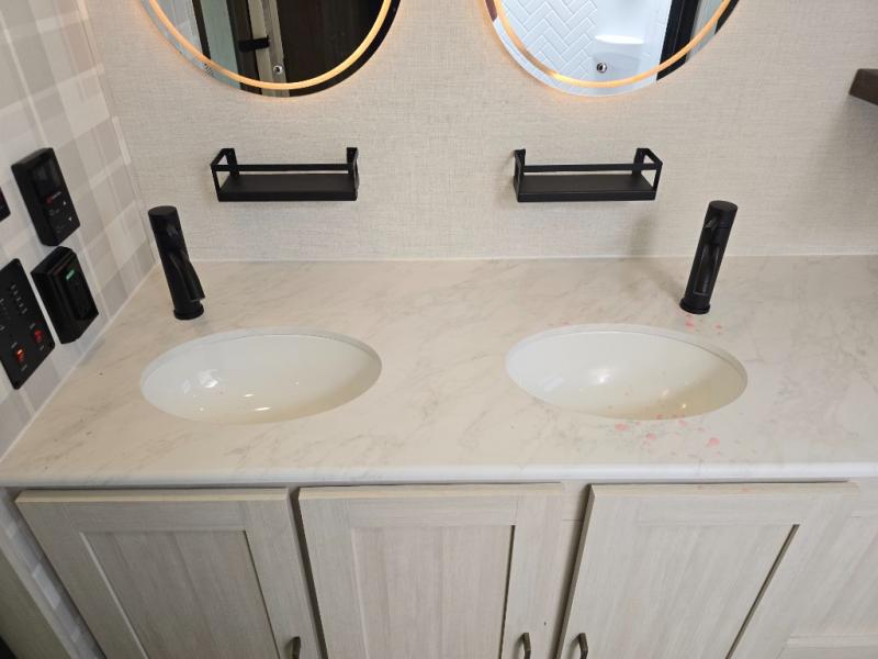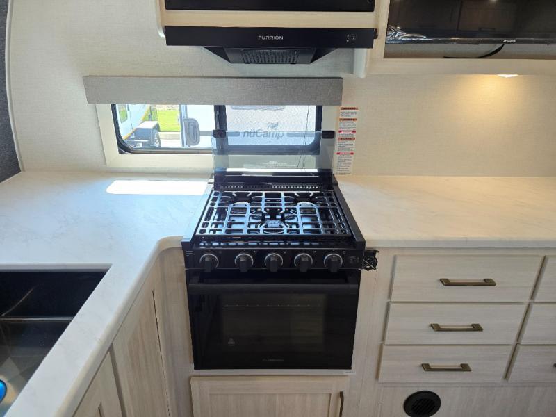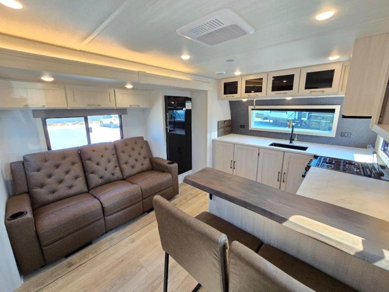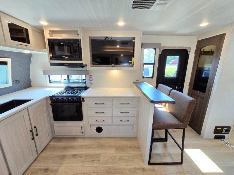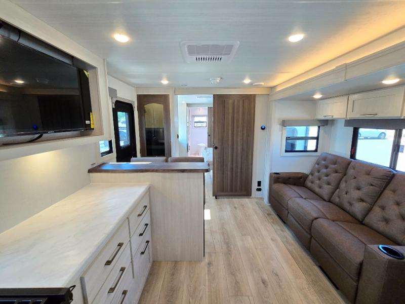 This couple's trailer will be giving you all the glamping vibes! There is a front kitchen with ample counter space, along with a counter with two bar stools, a central vacuum to easily clean up, and a slide out for more space! The second slide out is found in the middle master bedroom where you'll also enjoy a custom king bed across from a bedroom fireplace, a wardrobe, and a dresser with TV prep. Head towards the back and you'll be wowed by the full bath with dual bath sinks, an upgraded slow-close shower door, and a closet with washer and dryer prep. The exterior is just as impressive as the interior with its outside kitchen, 20' power awning with LED lights, pass-through storage, TV coax, and so much more!