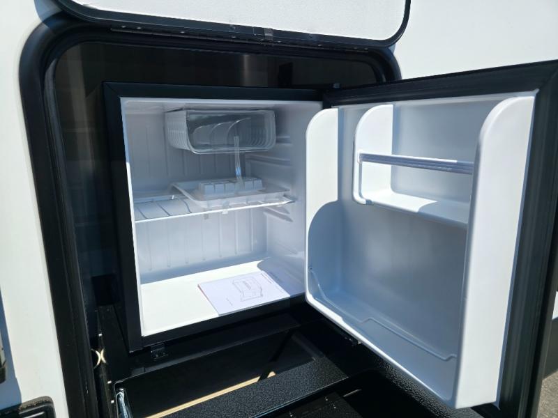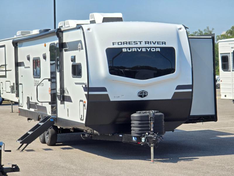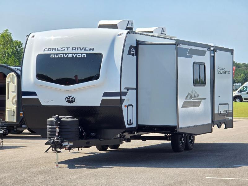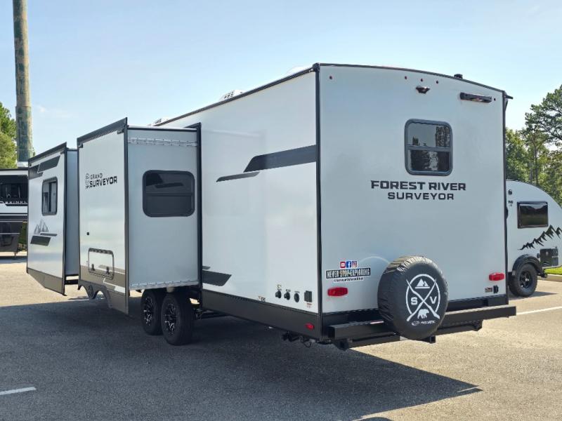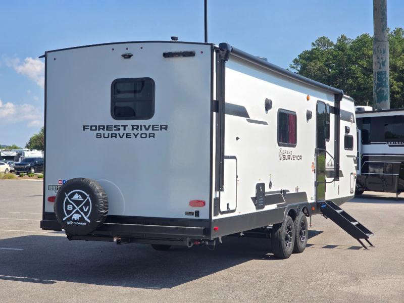 With any Grand Surveyor travel trailer by Forest River you will enjoy turn-key ready-to-go features and quality construction! Each model includes Azdel composite walls and a gel coated fiberglass front cap with an automotive style tinted windshield for a sleek look. There are friction hinge black glass entry door(s), an adjustable platform step with a night light, plus Goodyear tires and a power tongue jack for easy towing. The interior will have you feeling right at home with roller shades, residential faucets, sinks, and bathroom vanity, plus Surf(x) seamless countertops throughout. You can also plan for adventure with a 2" rear accessory and exterior spray port, and there are slam latch exterior baggage doors throughout to keep all your gear secure. Other stand-out features include a central vacuum system, a 200 watt solar panel with a 30 amp controller, a tankless water heater, carpet-free interiors, and the list goes on!