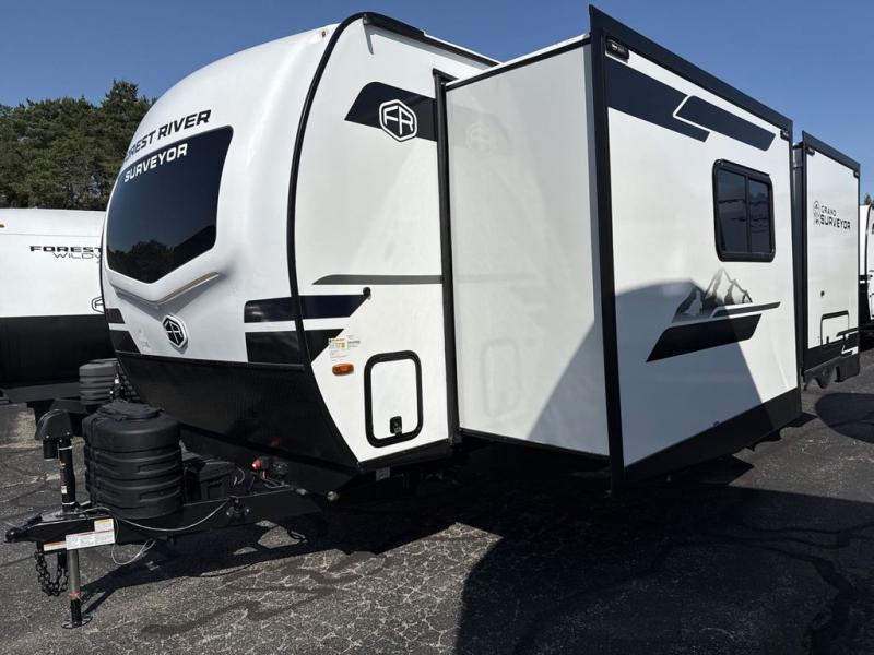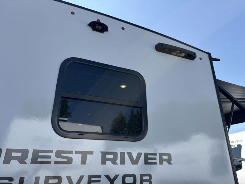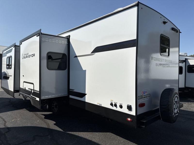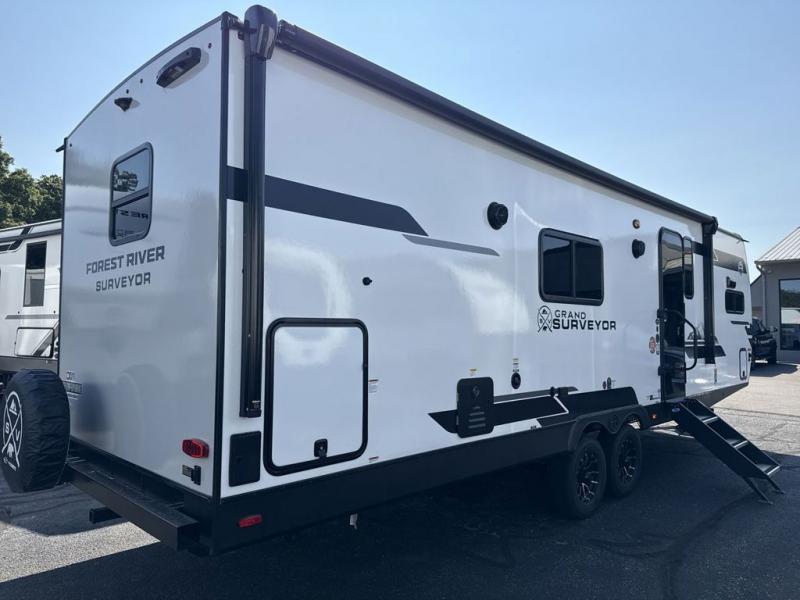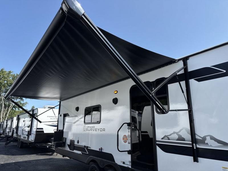 With any Grand Surveyor travel trailer by Forest River you will enjoy turn-key ready-to-go features and quality construction! Each model includes Azdel composite walls and a gel coated fiberglass front cap with an automotive style tinted windshield for a sleek look. There are friction hinge black glass entry door(s), an adjustable platform step with a night light, plus Goodyear tires and a power tongue jack for easy towing. The interior will have you feeling right at home with roller shades, residential faucets, sinks, and bathroom vanity, plus Surf(x) seamless countertops throughout. You can also plan for adventure with a 2" rear accessory and exterior spray port, and there are slam latch exterior baggage doors throughout to keep all your gear secure. Other stand-out features include a central vacuum system, a 200 watt solar panel with a 30 amp controller, a tankless water heater, carpet-free interiors, and the list goes on!