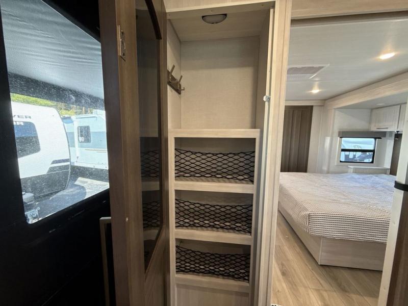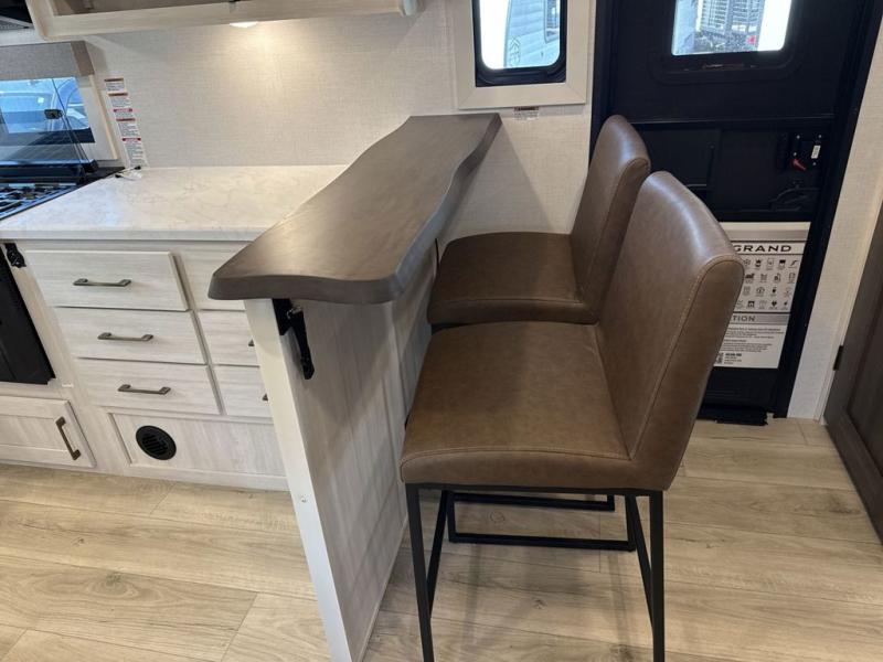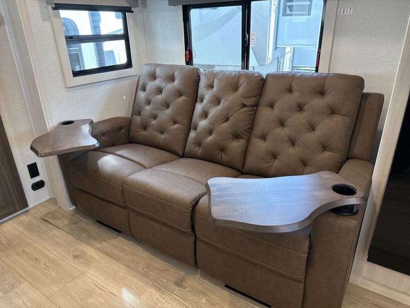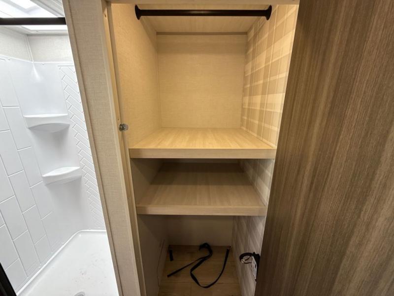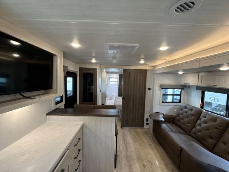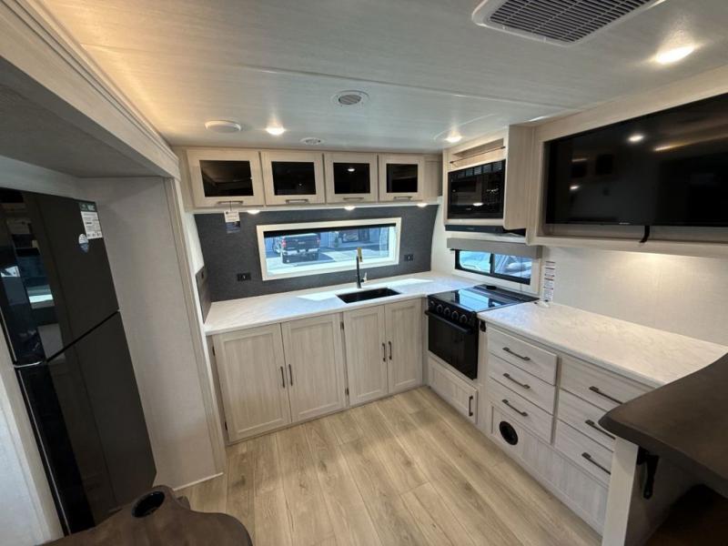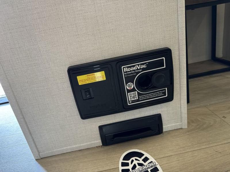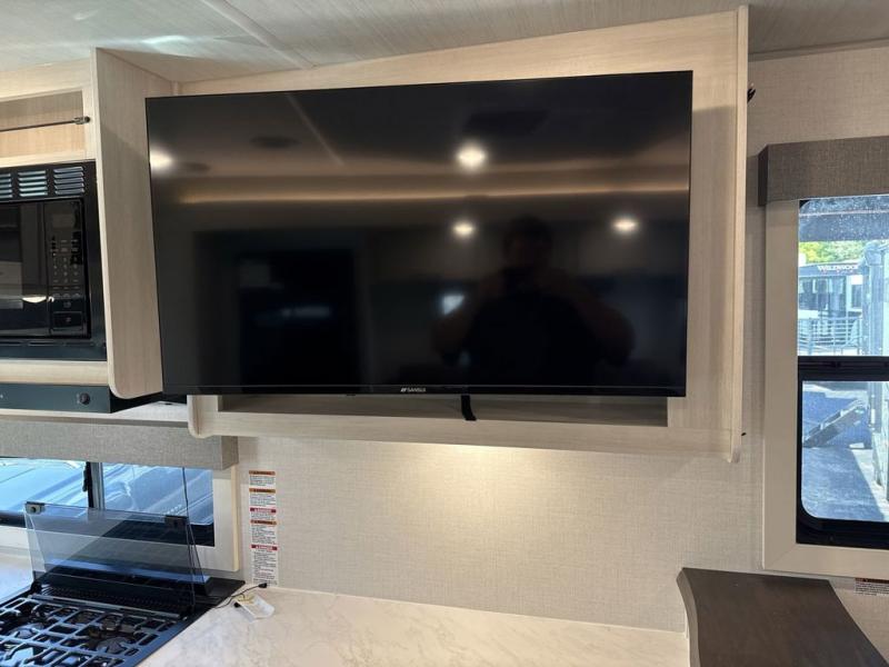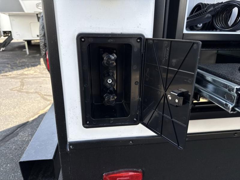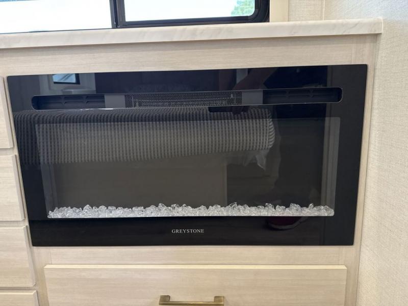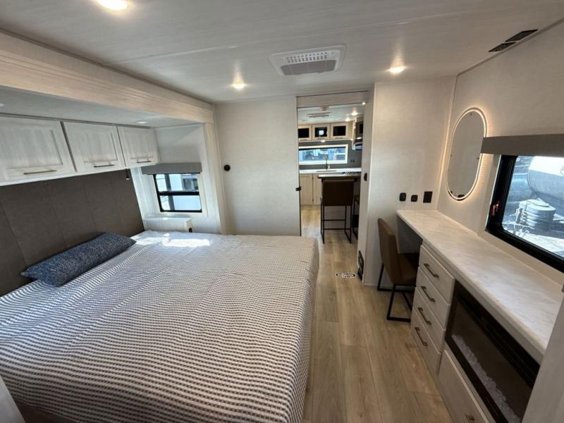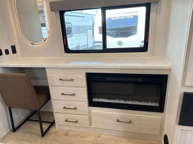 This couple's trailer will be giving you all the glamping vibes! There is a front kitchen with ample counter space, along with a counter with two bar stools, a central vacuum to easily clean up, and a slide out for more space! The second slide out is found in the middle master bedroom where you'll also enjoy a custom king bed across from a bedroom fireplace, a wardrobe, and a dresser with TV prep. Head towards the back and you'll be wowed by the full bath with dual bath sinks, an upgraded slow-close shower door, and a closet with washer and dryer prep. The exterior is just as impressive as the interior with its outside kitchen, 20' power awning with LED lights, pass-through storage, TV coax, and so much more!