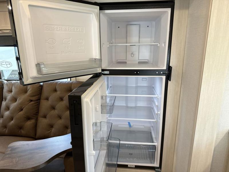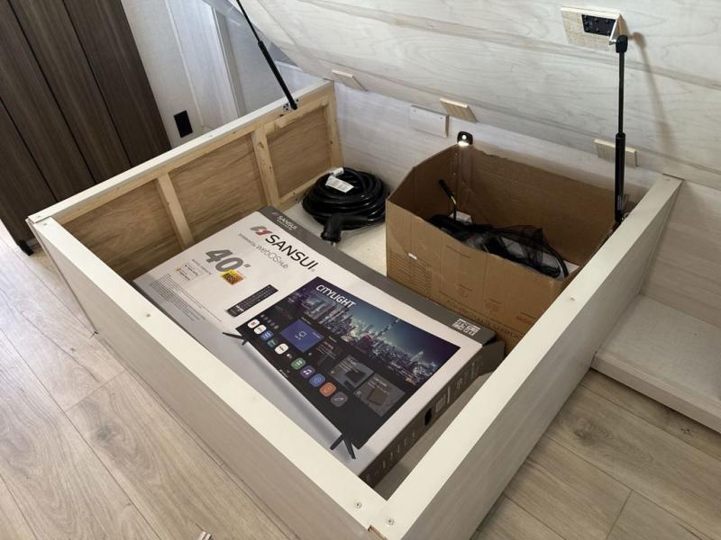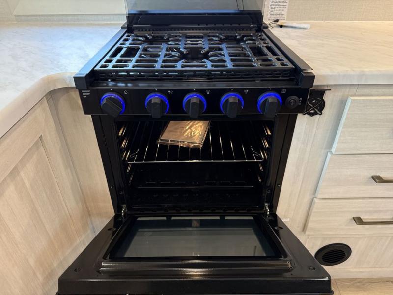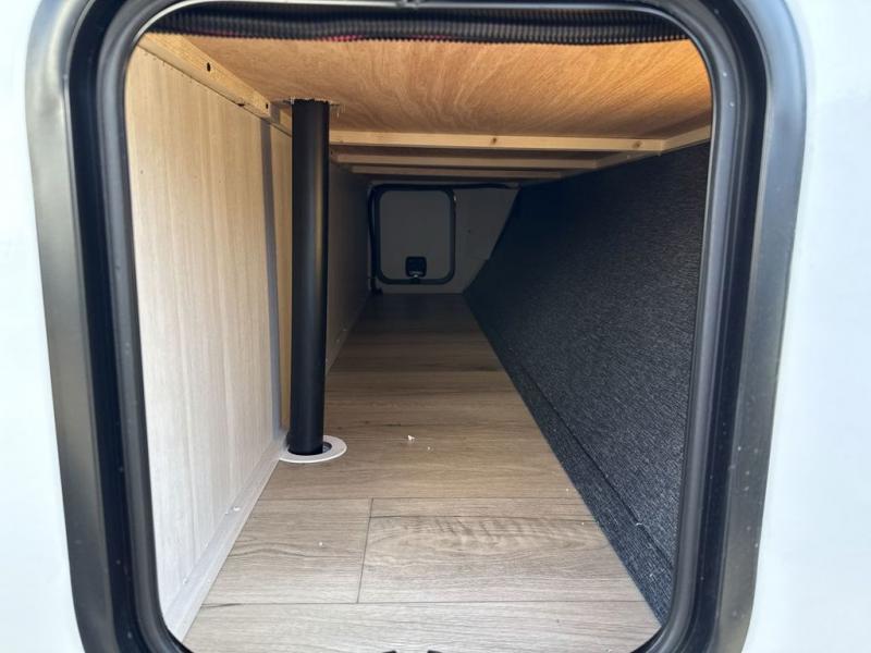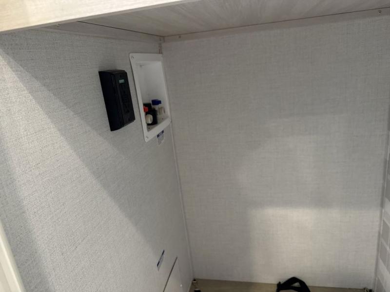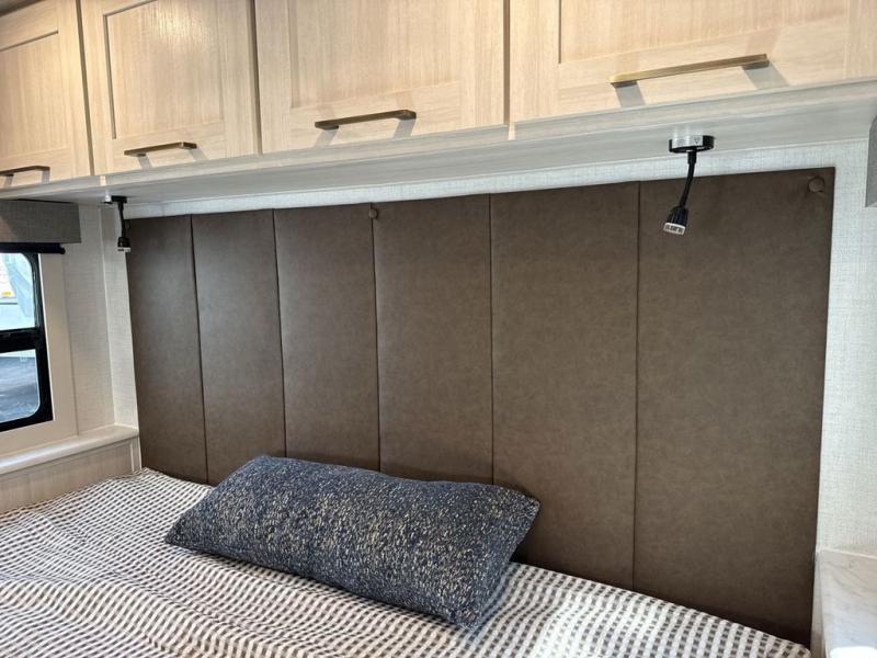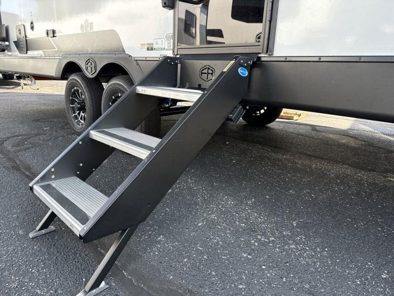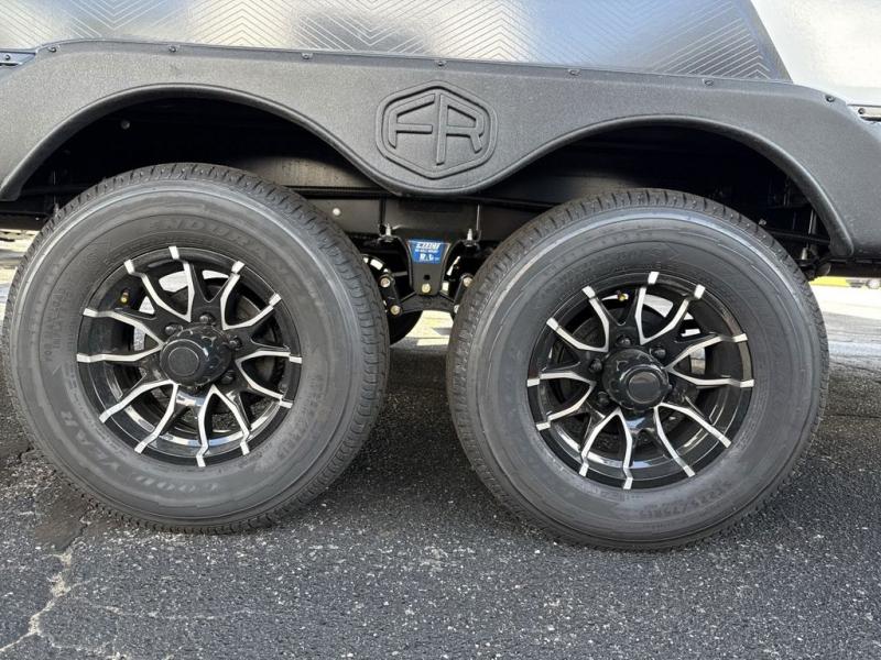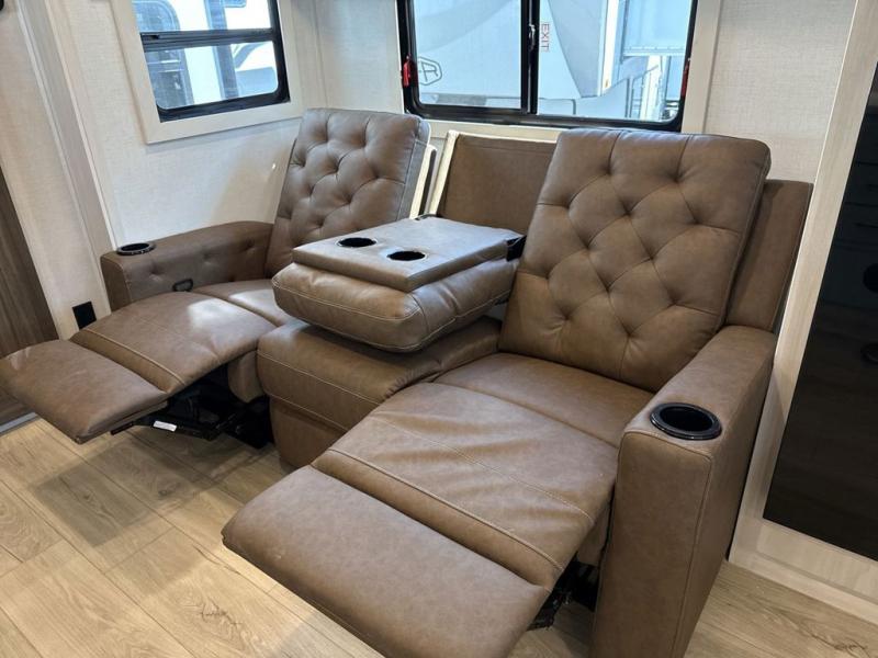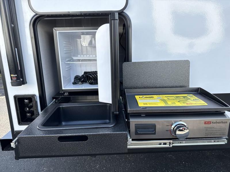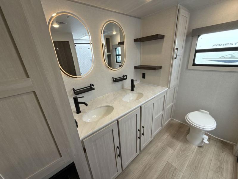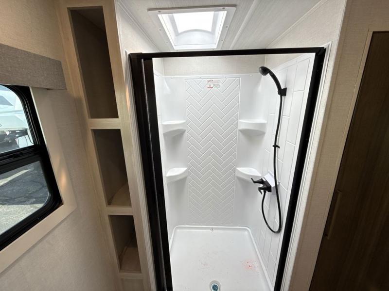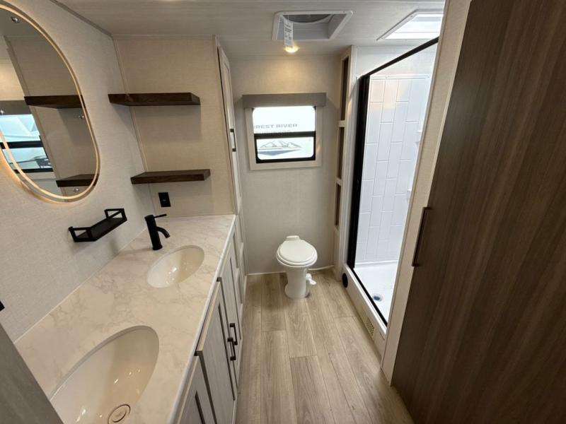 This couple's trailer will be giving you all the glamping vibes! There is a front kitchen with ample counter space, along with a counter with two bar stools, a central vacuum to easily clean up, and a slide out for more space! The second slide out is found in the middle master bedroom where you'll also enjoy a custom king bed across from a bedroom fireplace, a wardrobe, and a dresser with TV prep. Head towards the back and you'll be wowed by the full bath with dual bath sinks, an upgraded slow-close shower door, and a closet with washer and dryer prep. The exterior is just as impressive as the interior with its outside kitchen, 20' power awning with LED lights, pass-through storage, TV coax, and so much more!