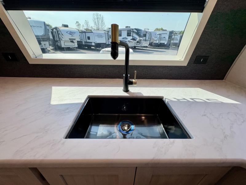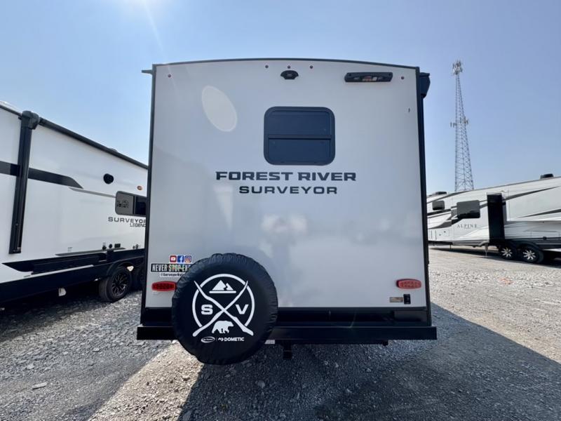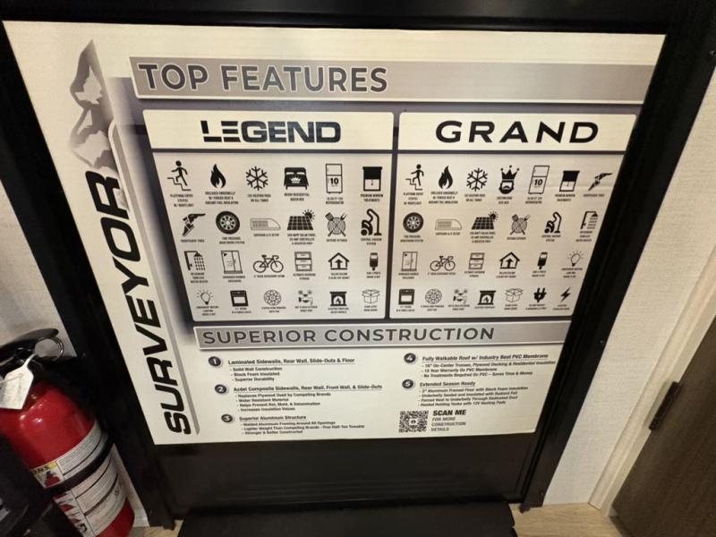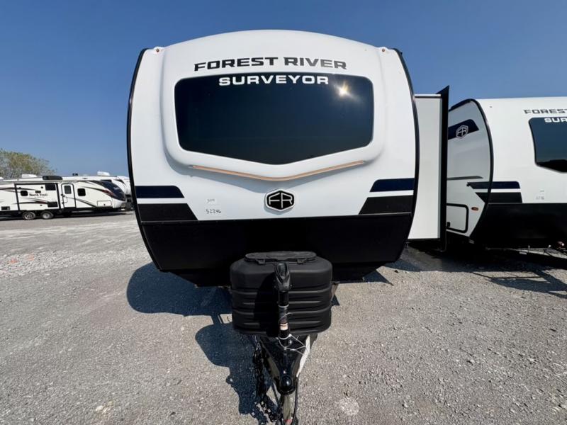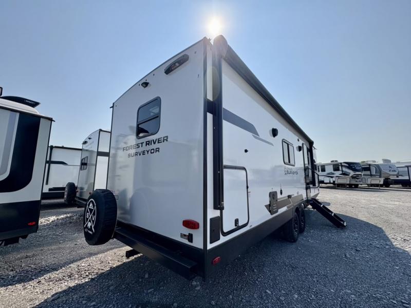 With any Grand Surveyor travel trailer by Forest River you will enjoy turn-key ready-to-go features and quality construction! Each model includes Azdel composite walls and a gel coated fiberglass front cap with an automotive style tinted windshield for a sleek look. There are friction hinge black glass entry door(s), an adjustable platform step with a night light, plus Goodyear tires and a power tongue jack for easy towing. The interior will have you feeling right at home with roller shades, residential faucets, sinks, and bathroom vanity, plus Surf(x) seamless countertops throughout. You can also plan for adventure with a 2" rear accessory and exterior spray port, and there are slam latch exterior baggage doors throughout to keep all your gear secure. Other stand-out features include a central vacuum system, a 200 watt solar panel with a 30 amp controller, a tankless water heater, carpet-free interiors, and the list goes on!
