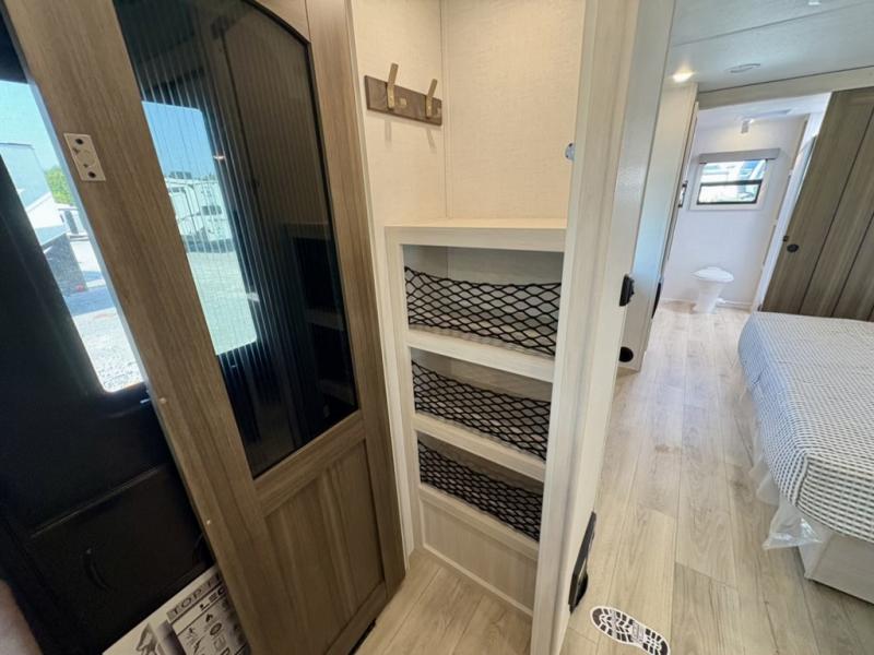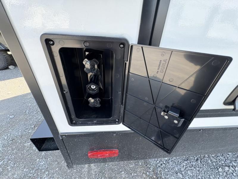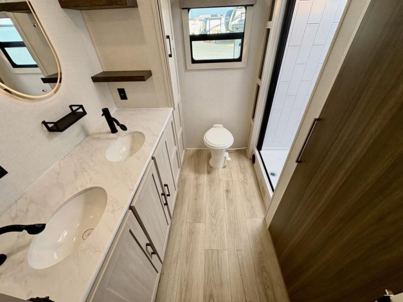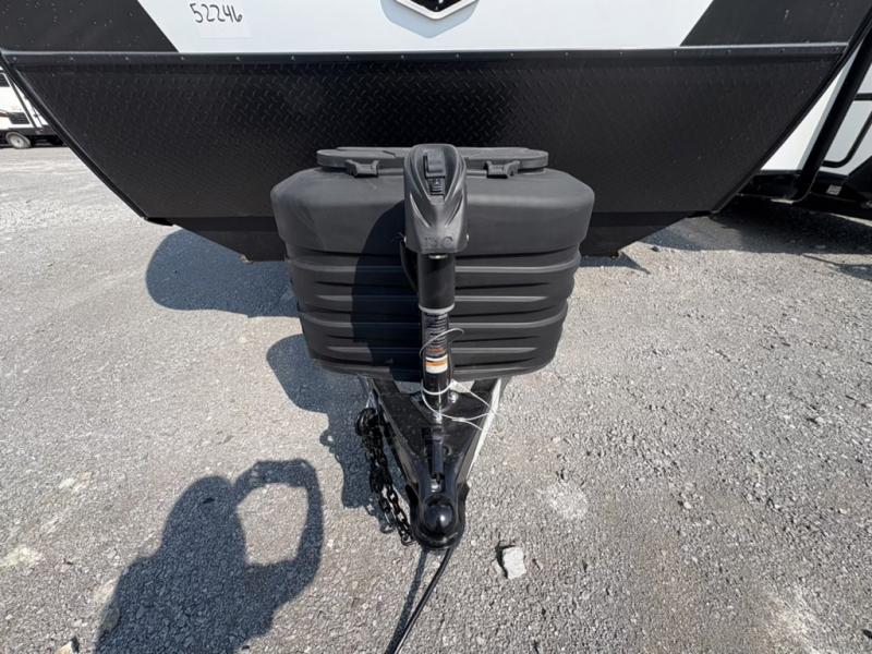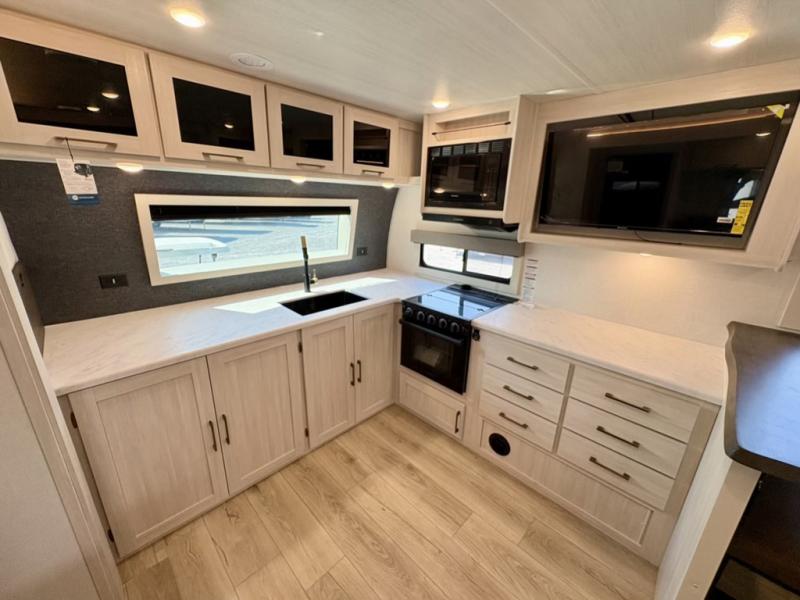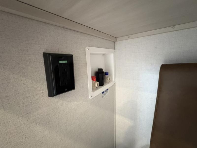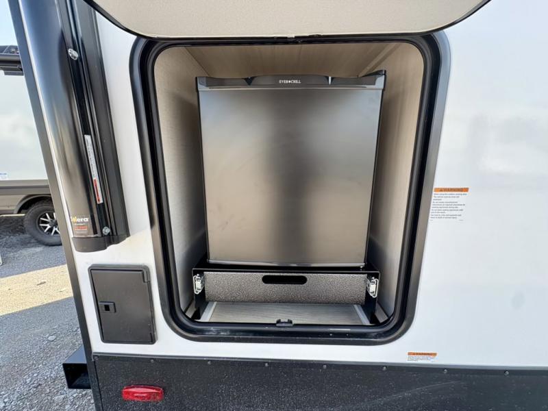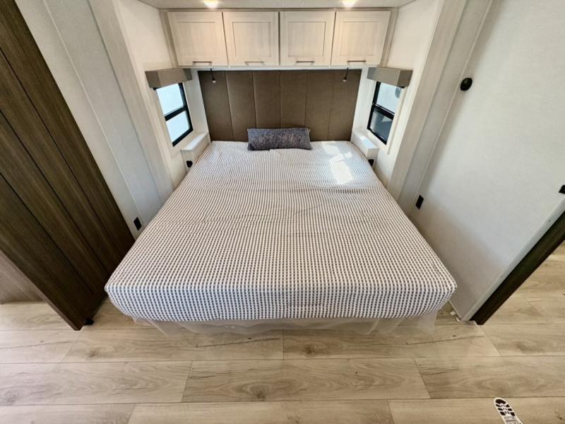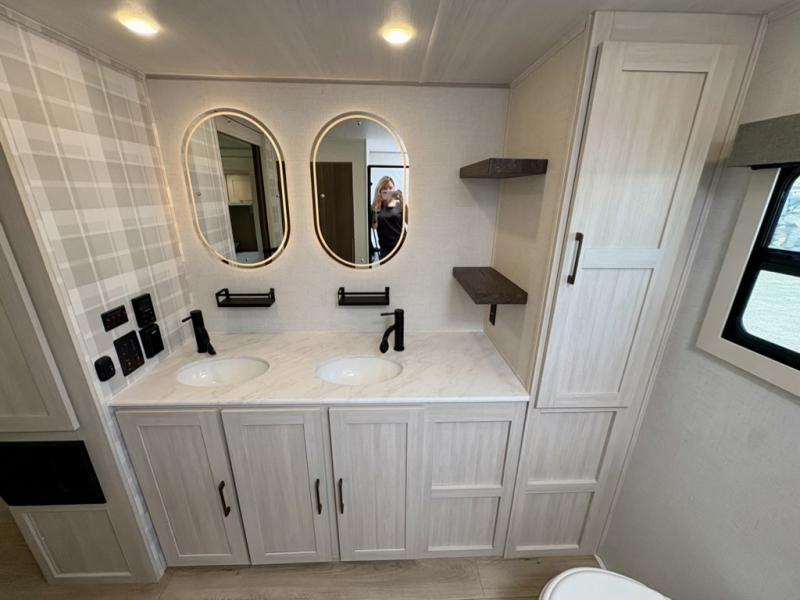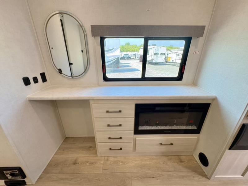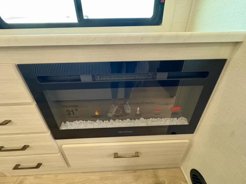 This couple's trailer will be giving you all the glamping vibes! There is a front kitchen with ample counter space, along with a counter with two bar stools, a central vacuum to easily clean up, and a slide out for more space! The second slide out is found in the middle master bedroom where you'll also enjoy a custom king bed across from a bedroom fireplace, a wardrobe, and a dresser with TV prep. Head towards the back and you'll be wowed by the full bath with dual bath sinks, an upgraded slow-close shower door, and a closet with washer and dryer prep. The exterior is just as impressive as the interior with its outside kitchen, 20' power awning with LED lights, pass-through storage, TV coax, and so much more!