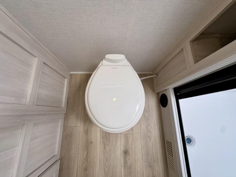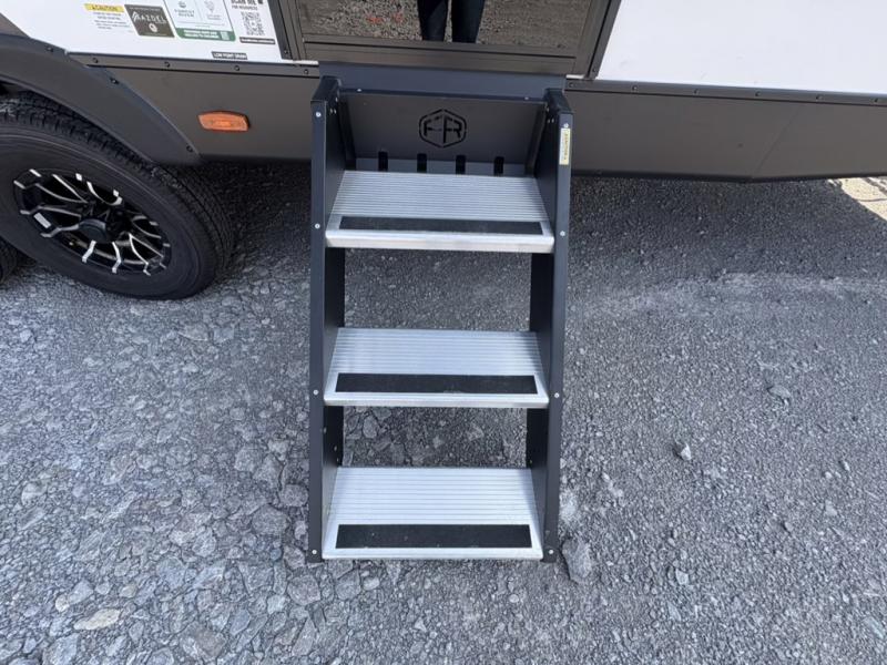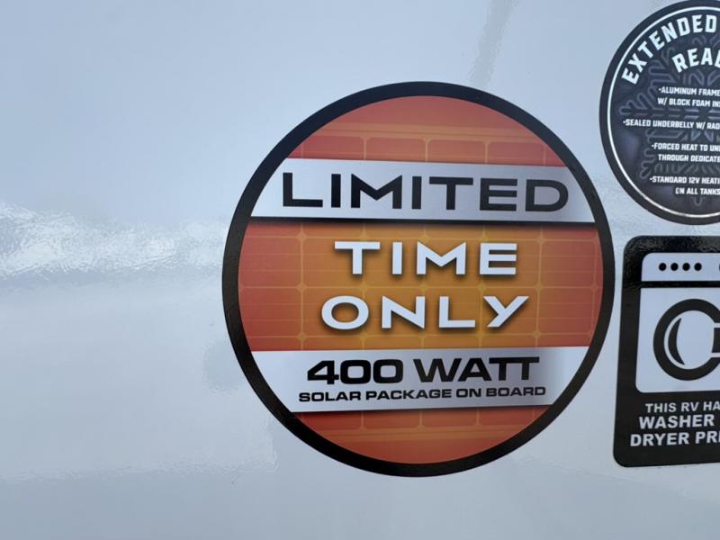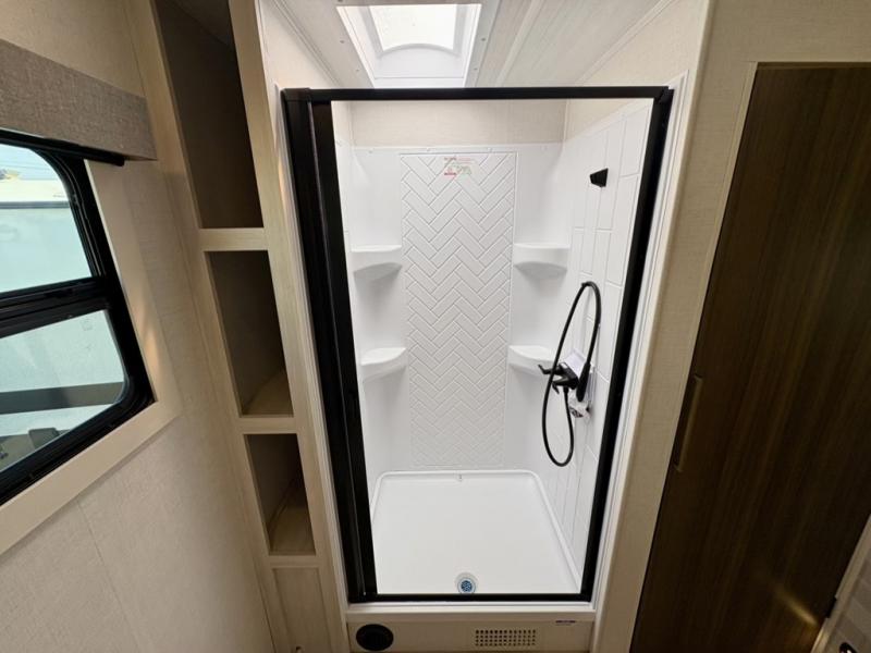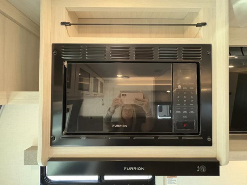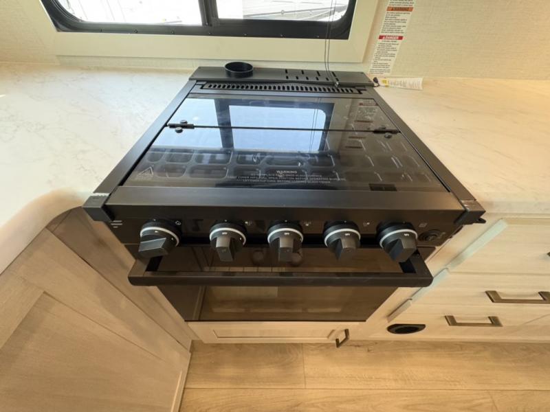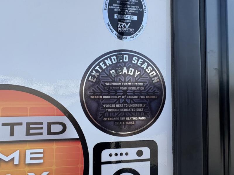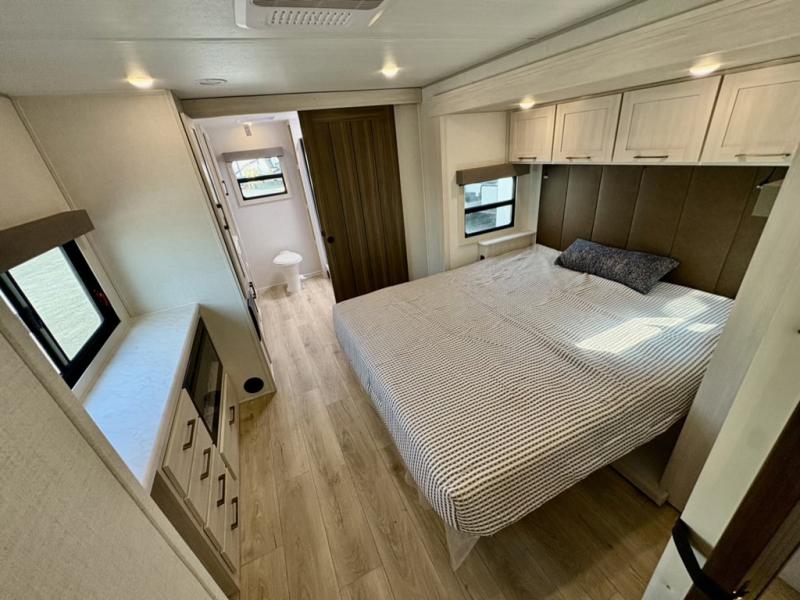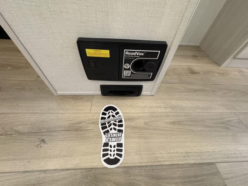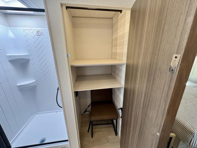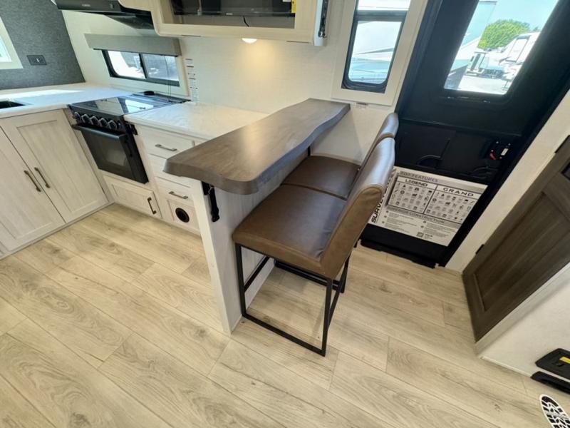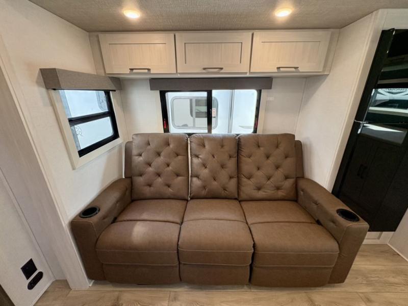 This couple's trailer will be giving you all the glamping vibes! There is a front kitchen with ample counter space, along with a counter with two bar stools, a central vacuum to easily clean up, and a slide out for more space! The second slide out is found in the middle master bedroom where you'll also enjoy a custom king bed across from a bedroom fireplace, a wardrobe, and a dresser with TV prep. Head towards the back and you'll be wowed by the full bath with dual bath sinks, an upgraded slow-close shower door, and a closet with washer and dryer prep. The exterior is just as impressive as the interior with its outside kitchen, 20' power awning with LED lights, pass-through storage, TV coax, and so much more!