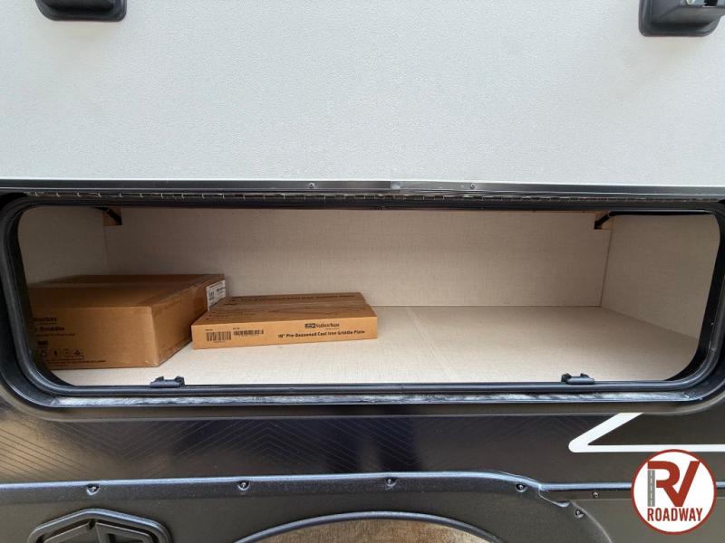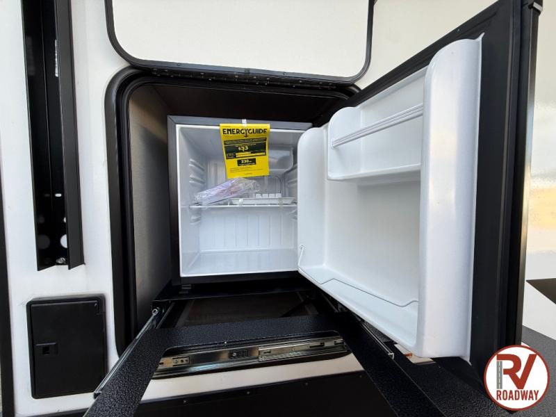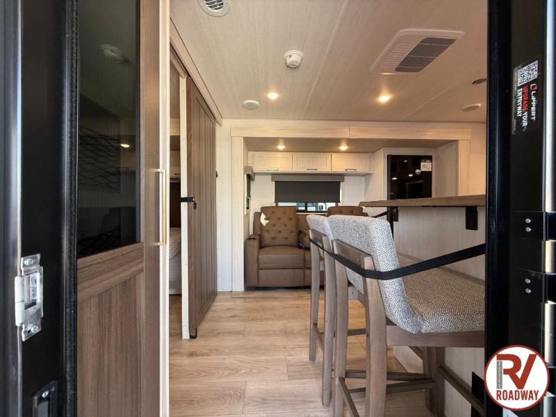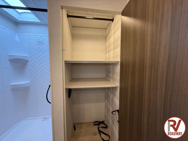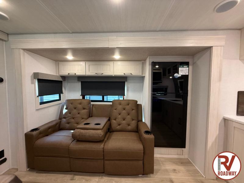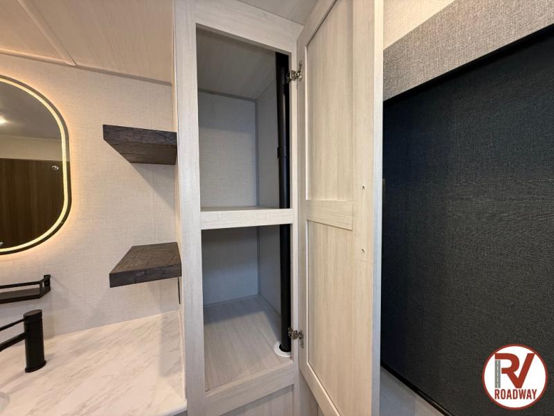 This couple's trailer will be giving you all the glamping vibes! There is a front kitchen with ample counter space, along with a counter with two bar stools, a central vacuum to easily clean up, and a slide out for more space! The second slide out is found in the middle master bedroom where you'll also enjoy a custom king bed across from a bedroom fireplace, a wardrobe, and a dresser with TV prep. Head towards the back and you'll be wowed by the full bath with dual bath sinks, an upgraded slow-close shower door, and a closet with washer and dryer prep. The exterior is just as impressive as the interior with its outside kitchen, 20' power awning with LED lights, pass-through storage, TV coax, and so much more!