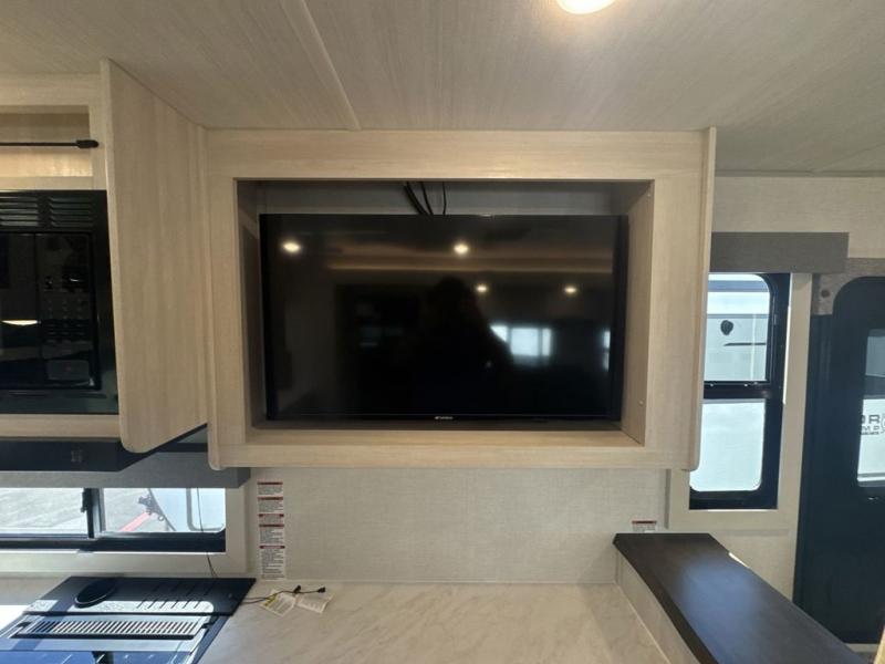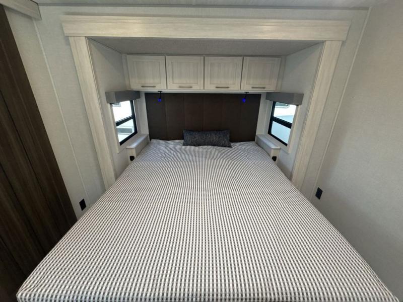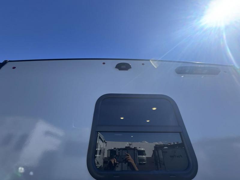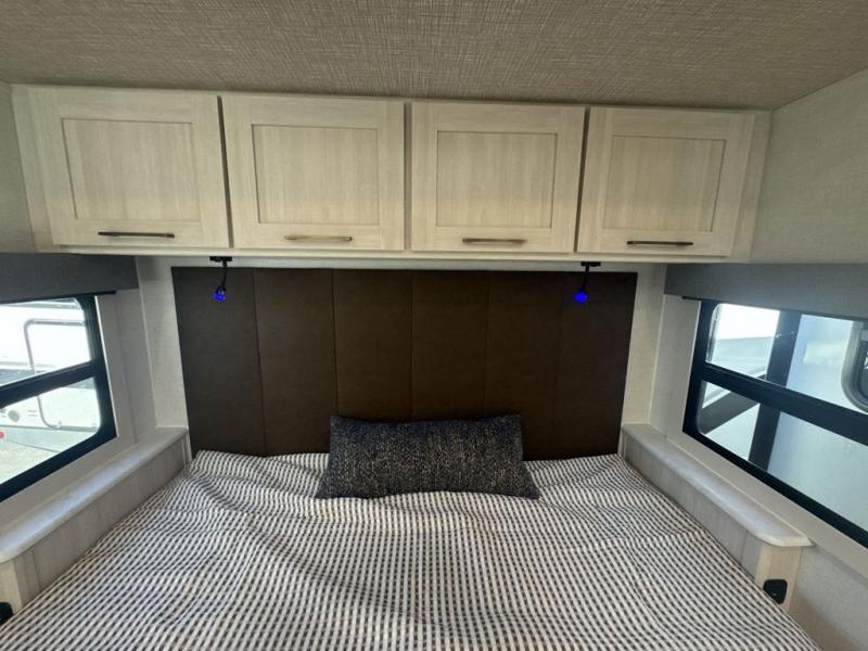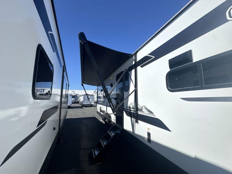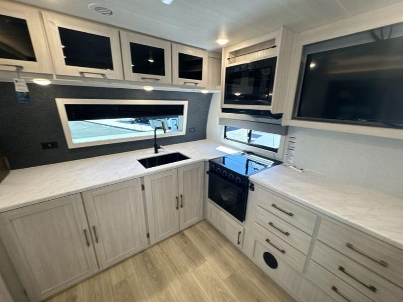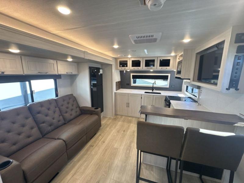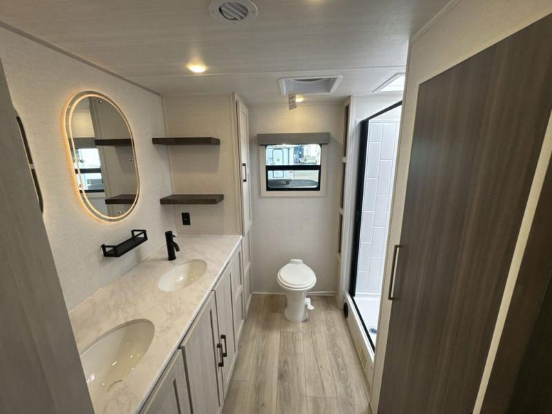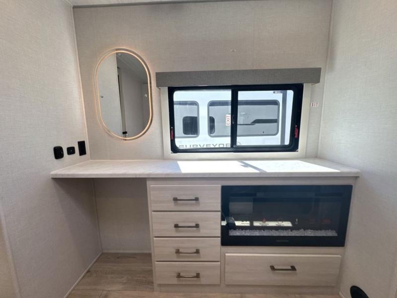 This couple's trailer will be giving you all the glamping vibes! There is a front kitchen with ample counter space, along with a counter with two bar stools, a central vacuum to easily clean up, and a slide out for more space! The second slide out is found in the middle master bedroom where you'll also enjoy a custom king bed across from a bedroom fireplace, a wardrobe, and a dresser with TV prep. Head towards the back and you'll be wowed by the full bath with dual bath sinks, an upgraded slow-close shower door, and a closet with washer and dryer prep. The exterior is just as impressive as the interior with its outside kitchen, 20' power awning with LED lights, pass-through storage, TV coax, and so much more!