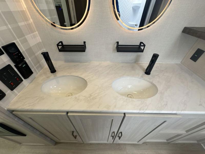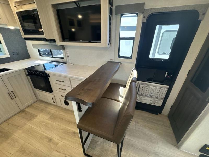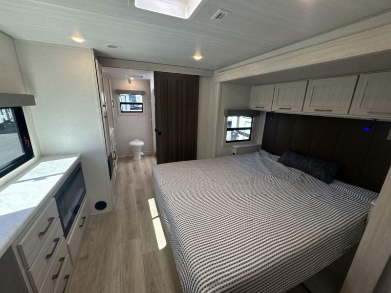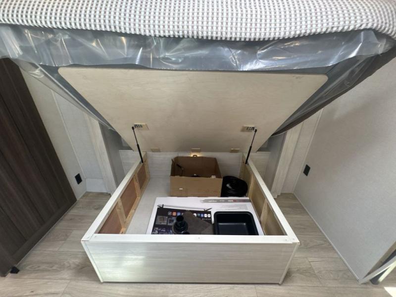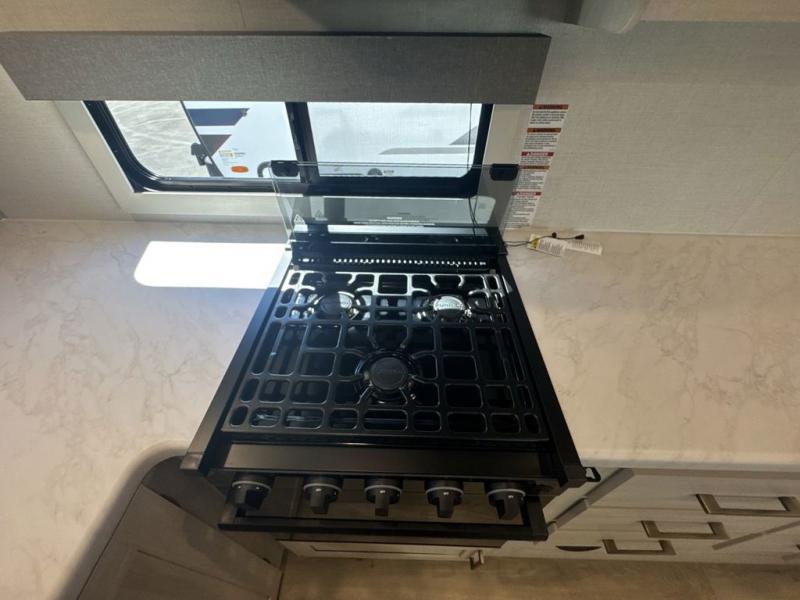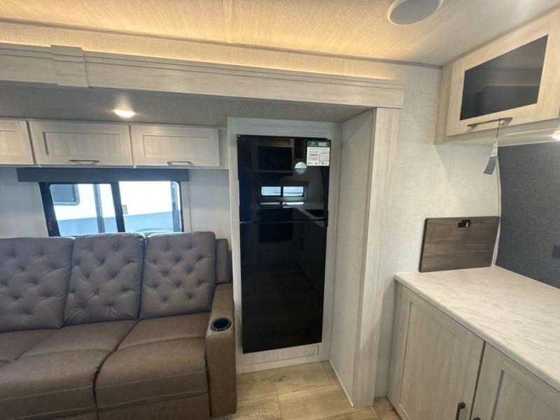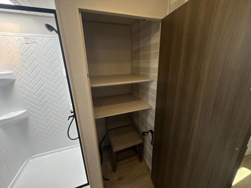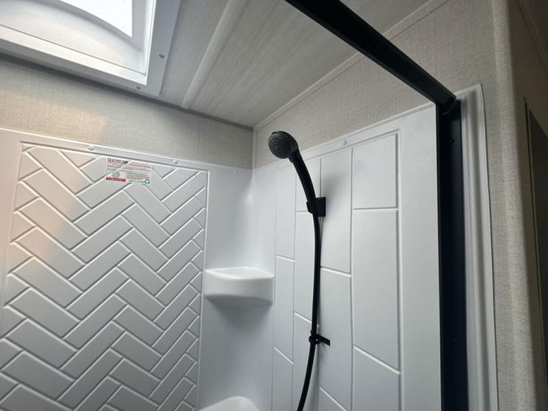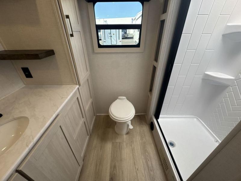 This couple's trailer will be giving you all the glamping vibes! There is a front kitchen with ample counter space, along with a counter with two bar stools, a central vacuum to easily clean up, and a slide out for more space! The second slide out is found in the middle master bedroom where you'll also enjoy a custom king bed across from a bedroom fireplace, a wardrobe, and a dresser with TV prep. Head towards the back and you'll be wowed by the full bath with dual bath sinks, an upgraded slow-close shower door, and a closet with washer and dryer prep. The exterior is just as impressive as the interior with its outside kitchen, 20' power awning with LED lights, pass-through storage, TV coax, and so much more!