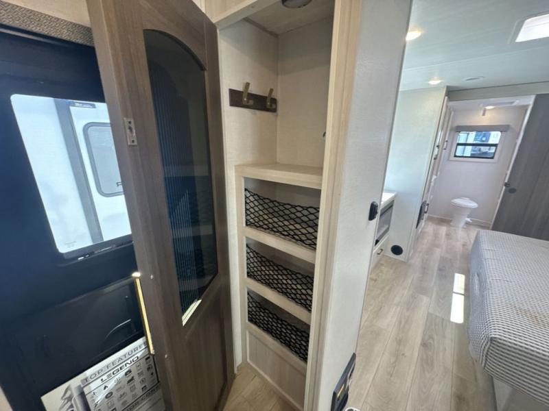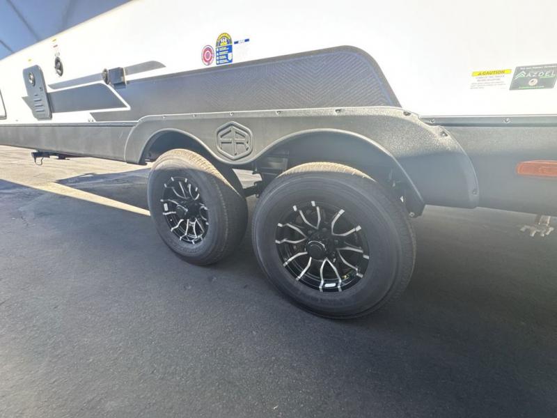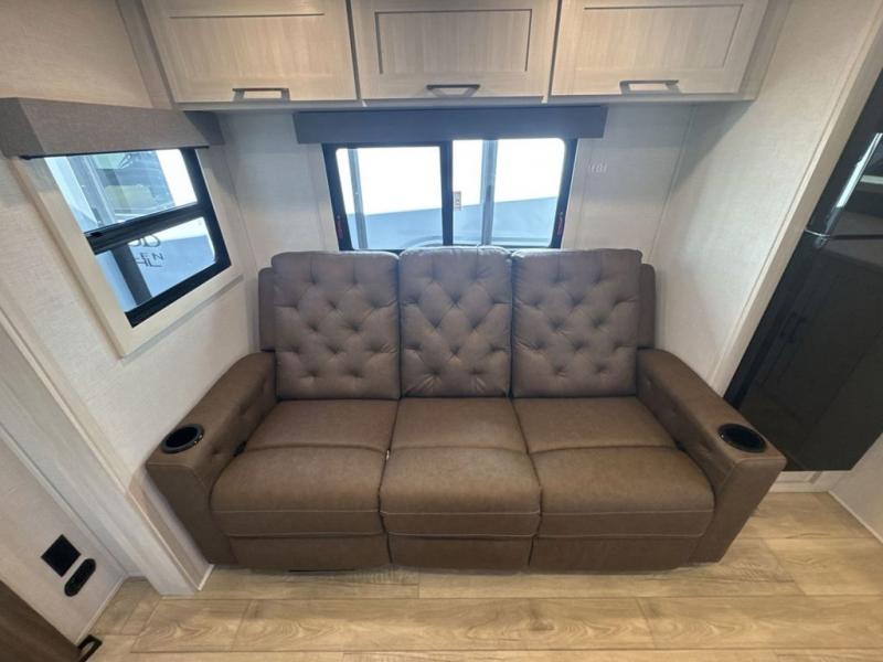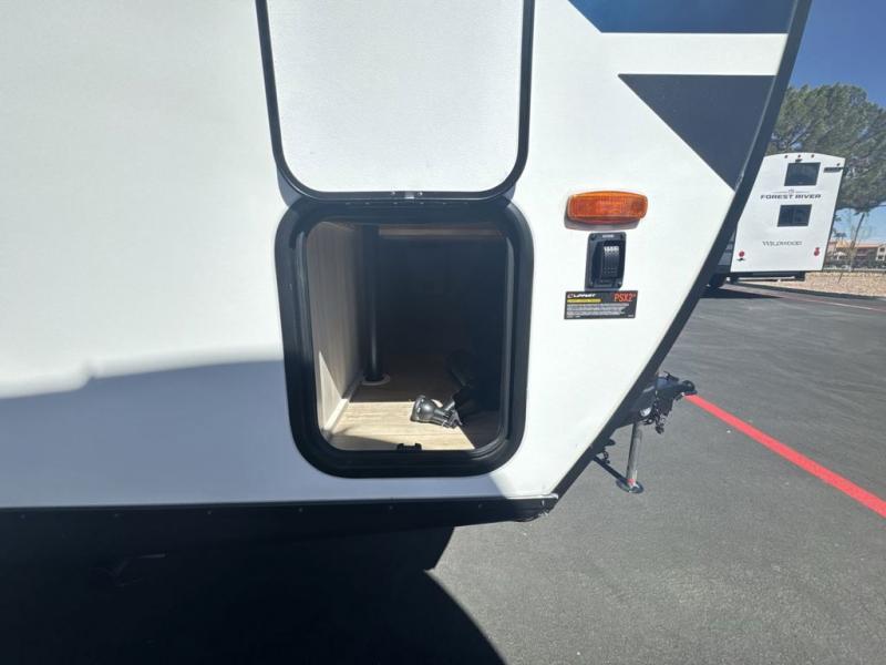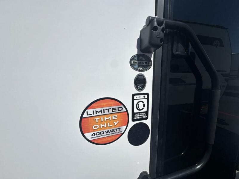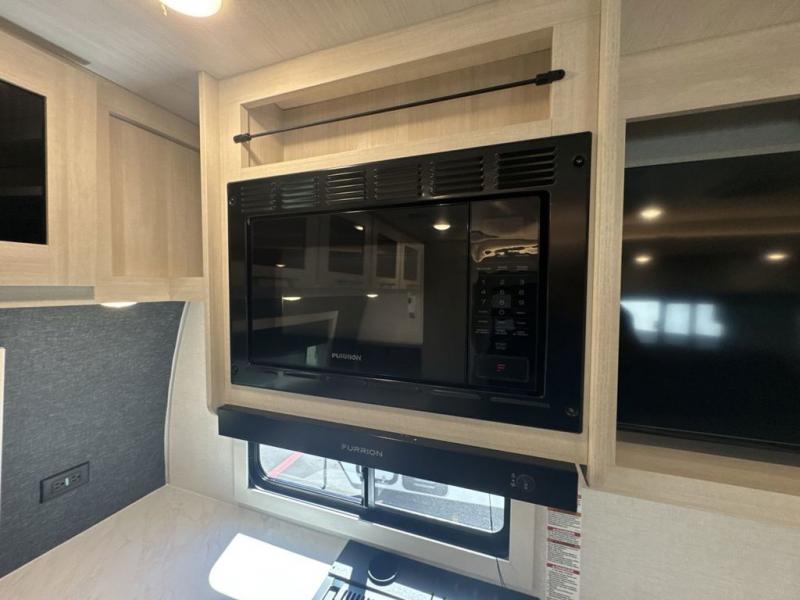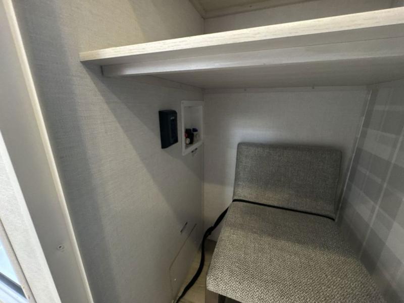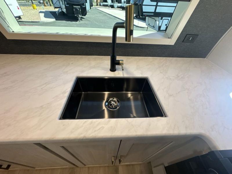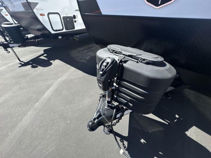 This couple's trailer will be giving you all the glamping vibes! There is a front kitchen with ample counter space, along with a counter with two bar stools, a central vacuum to easily clean up, and a slide out for more space! The second slide out is found in the middle master bedroom where you'll also enjoy a custom king bed across from a bedroom fireplace, a wardrobe, and a dresser with TV prep. Head towards the back and you'll be wowed by the full bath with dual bath sinks, an upgraded slow-close shower door, and a closet with washer and dryer prep. The exterior is just as impressive as the interior with its outside kitchen, 20' power awning with LED lights, pass-through storage, TV coax, and so much more!
