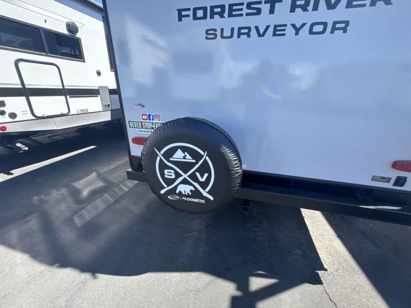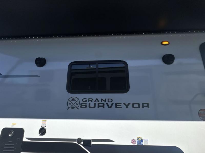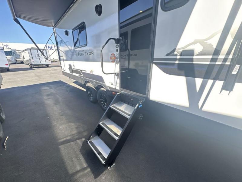 With any Grand Surveyor travel trailer by Forest River you will enjoy turn-key ready-to-go features and quality construction! Each model includes Azdel composite walls and a gel coated fiberglass front cap with an automotive style tinted windshield for a sleek look. There are friction hinge black glass entry door(s), an adjustable platform step with a night light, plus Goodyear tires and a power tongue jack for easy towing. The interior will have you feeling right at home with roller shades, residential faucets, sinks, and bathroom vanity, plus Surf(x) seamless countertops throughout. You can also plan for adventure with a 2" rear accessory and exterior spray port, and there are slam latch exterior baggage doors throughout to keep all your gear secure. Other stand-out features include a central vacuum system, a 200 watt solar panel with a 30 amp controller, a tankless water heater, carpet-free interiors, and the list goes on!