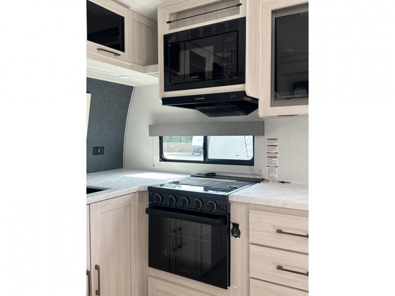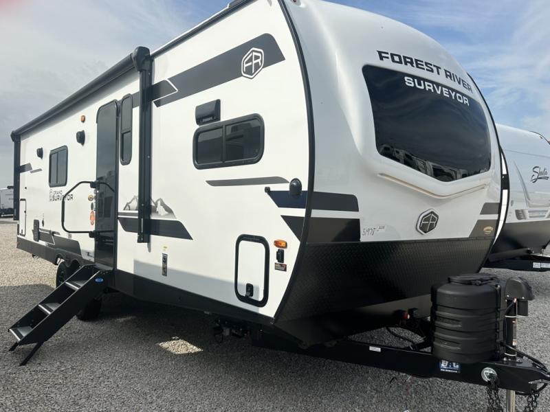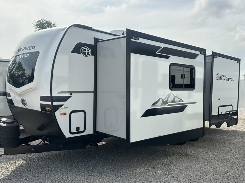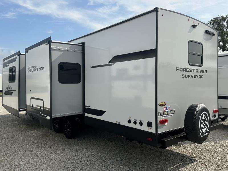 With any Grand Surveyor travel trailer by Forest River you will enjoy turn-key ready-to-go features and quality construction! Each model includes Azdel composite walls and a gel coated fiberglass front cap with an automotive style tinted windshield for a sleek look. There are friction hinge black glass entry door(s), an adjustable platform step with a night light, plus Goodyear tires and a power tongue jack for easy towing. The interior will have you feeling right at home with roller shades, residential faucets, sinks, and bathroom vanity, plus Surf(x) seamless countertops throughout. You can also plan for adventure with a 2" rear accessory and exterior spray port, and there are slam latch exterior baggage doors throughout to keep all your gear secure. Other stand-out features include a central vacuum system, a 200 watt solar panel with a 30 amp controller, a tankless water heater, carpet-free interiors, and the list goes on!