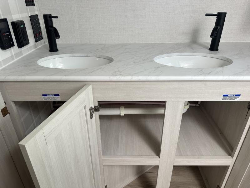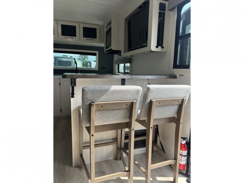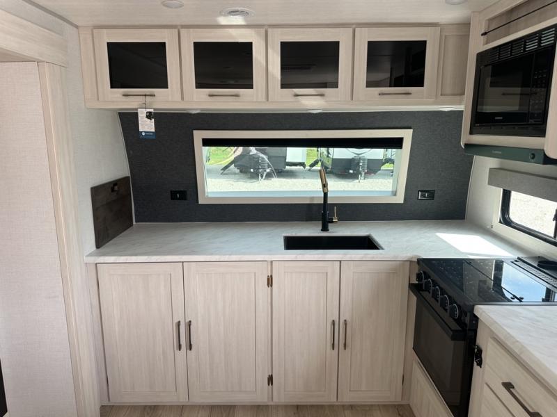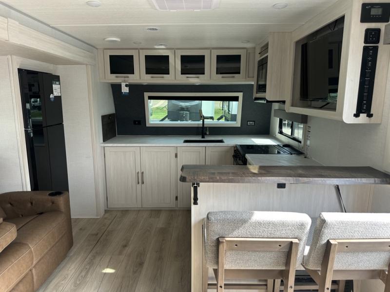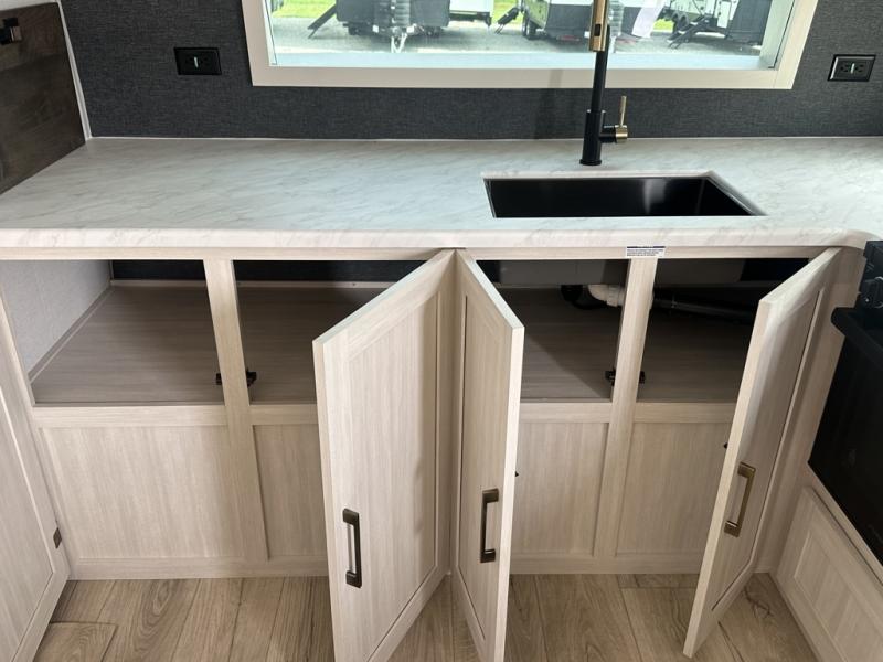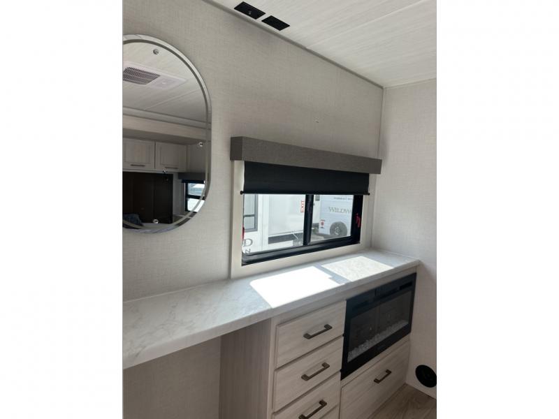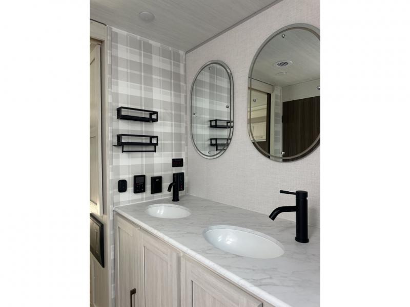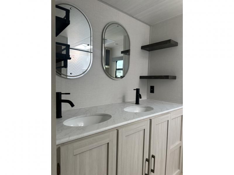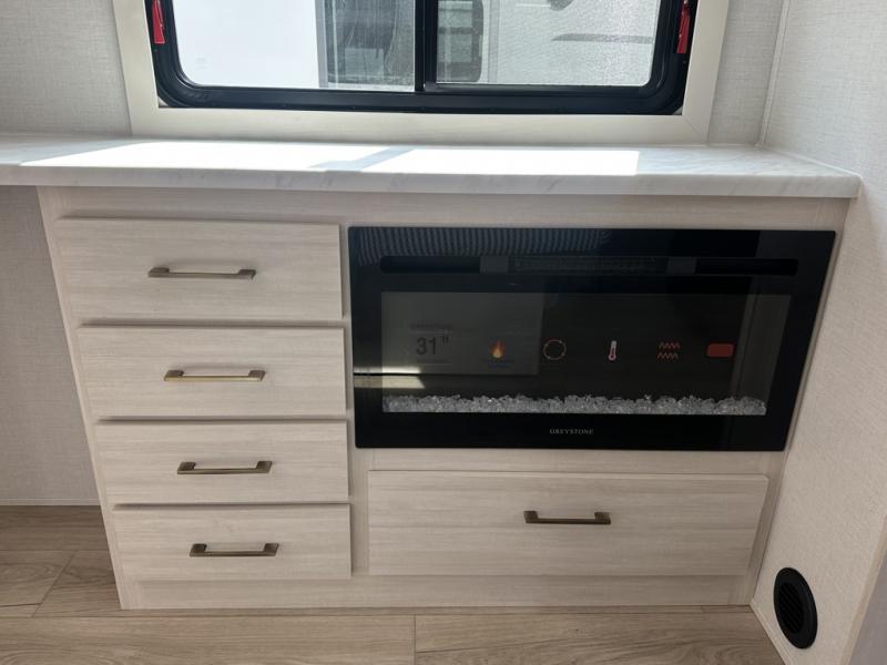 This couple's trailer will be giving you all the glamping vibes! There is a front kitchen with ample counter space, along with a counter with two bar stools, a central vacuum to easily clean up, and a slide out for more space! The second slide out is found in the middle master bedroom where you'll also enjoy a custom king bed across from a bedroom fireplace, a wardrobe, and a dresser with TV prep. Head towards the back and you'll be wowed by the full bath with dual bath sinks, an upgraded slow-close shower door, and a closet with washer and dryer prep. The exterior is just as impressive as the interior with its outside kitchen, 20' power awning with LED lights, slam-latch cargo doors, TV coax, and so much more!