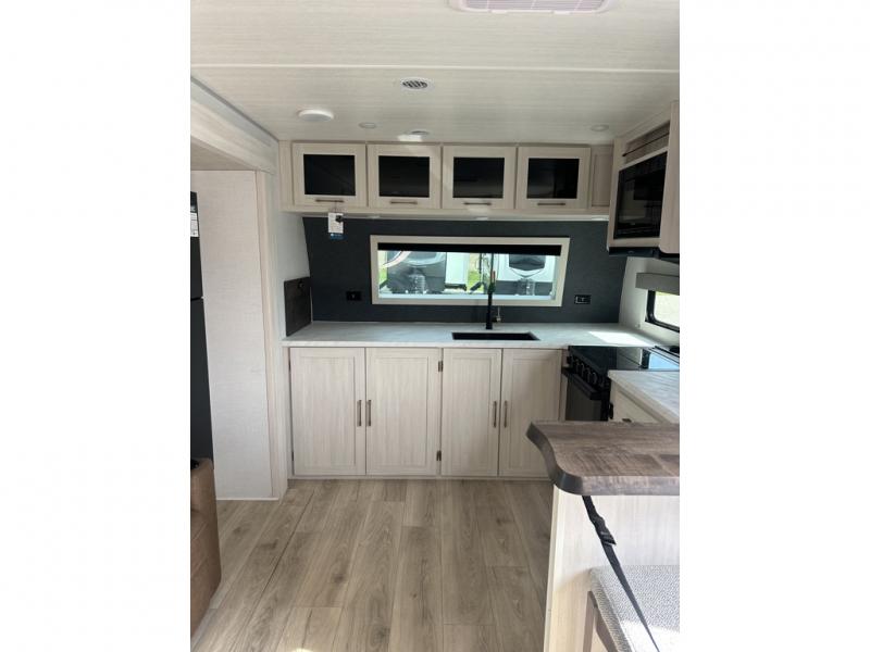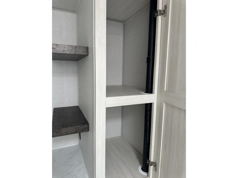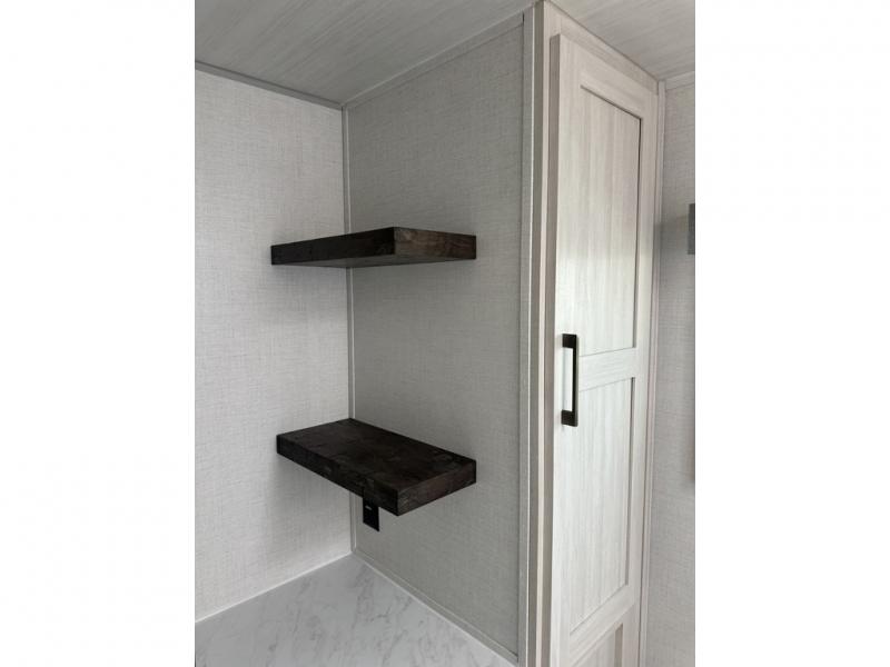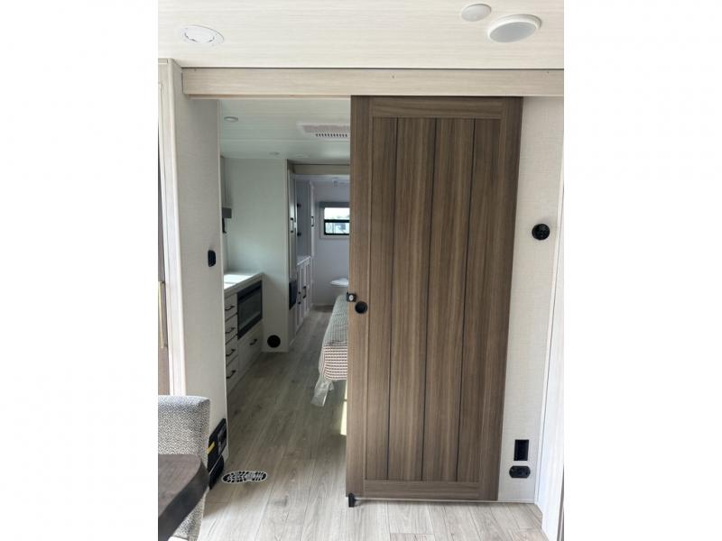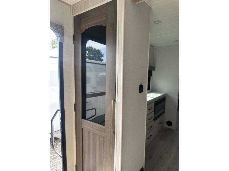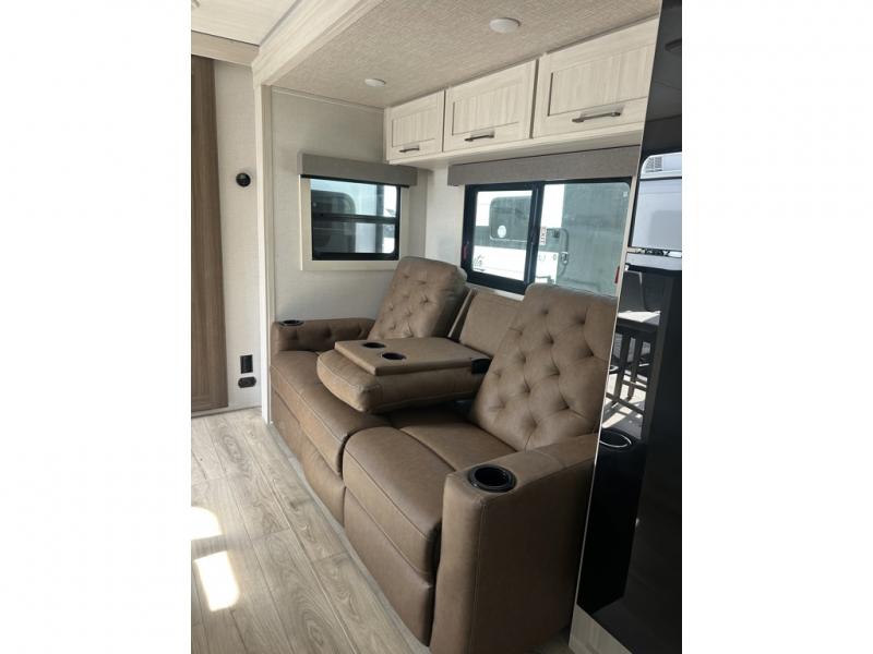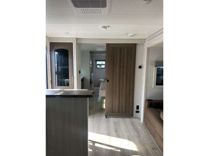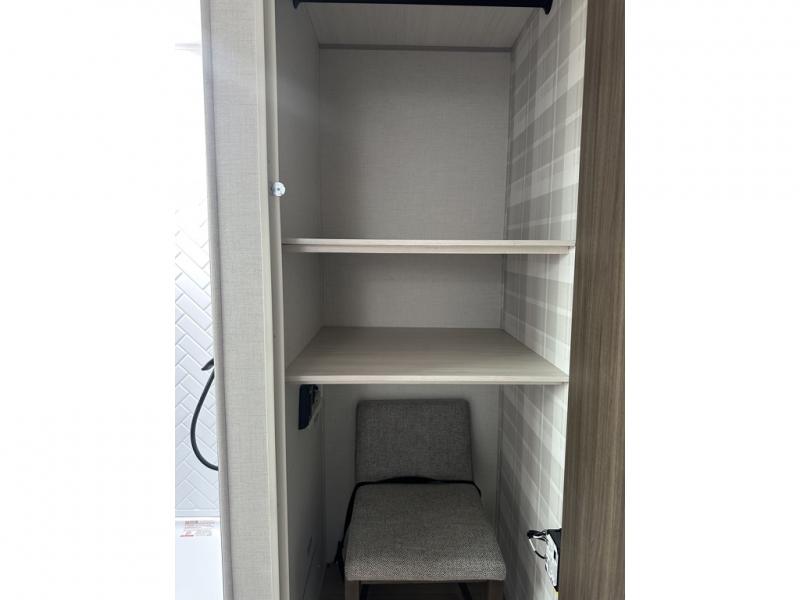 This couple's trailer will be giving you all the glamping vibes! There is a front kitchen with ample counter space, along with a counter with two bar stools, a central vacuum to easily clean up, and a slide out for more space! The second slide out is found in the middle master bedroom where you'll also enjoy a custom king bed across from a bedroom fireplace, a wardrobe, and a dresser with TV prep. Head towards the back and you'll be wowed by the full bath with dual bath sinks, an upgraded slow-close shower door, and a closet with washer and dryer prep. The exterior is just as impressive as the interior with its outside kitchen, 20' power awning with LED lights, slam-latch cargo doors, TV coax, and so much more!