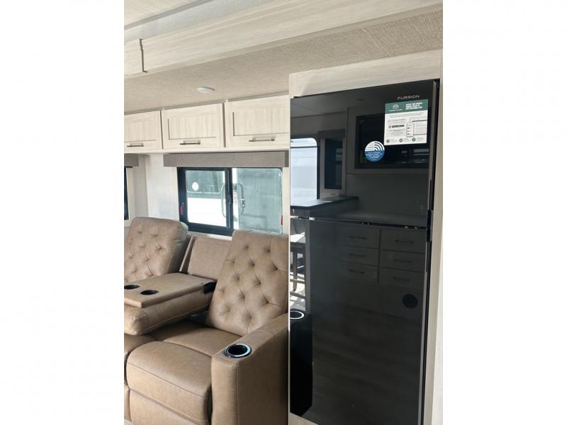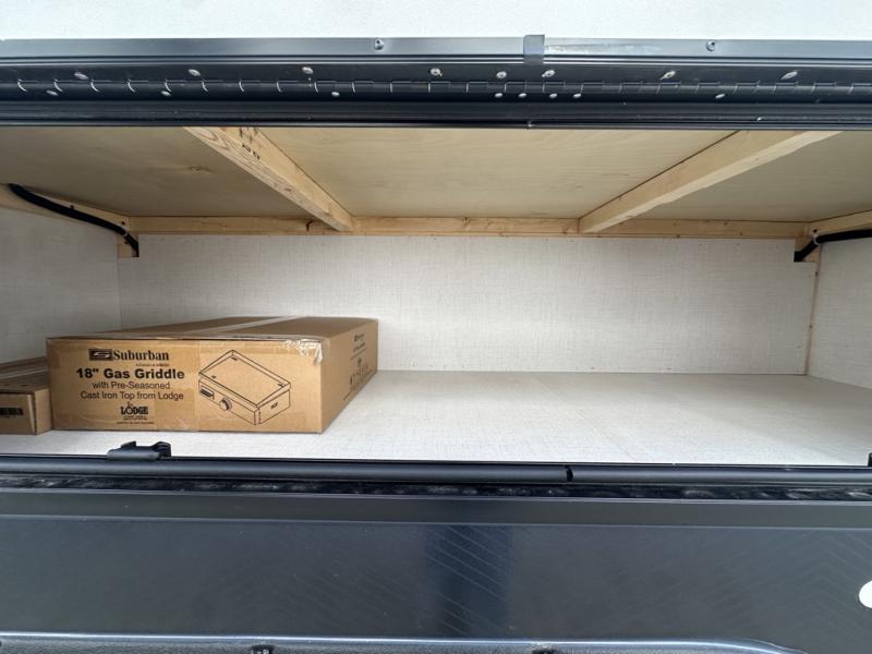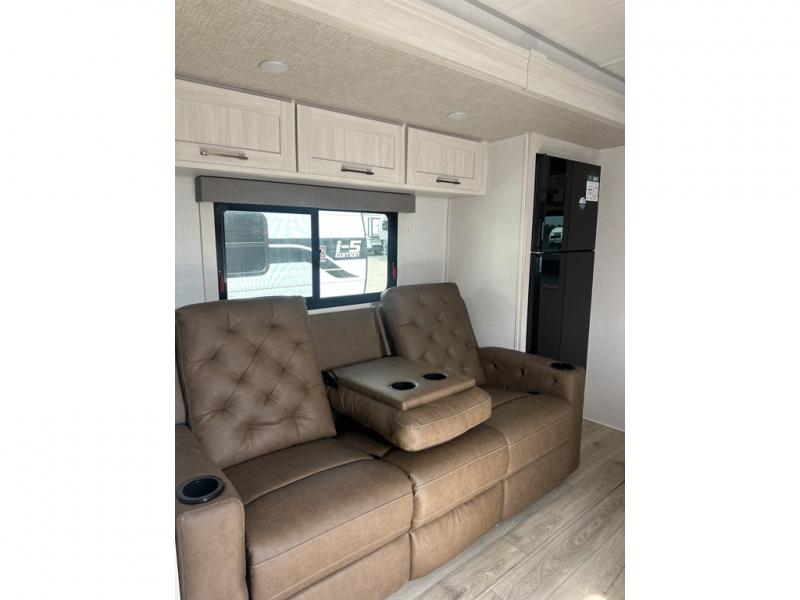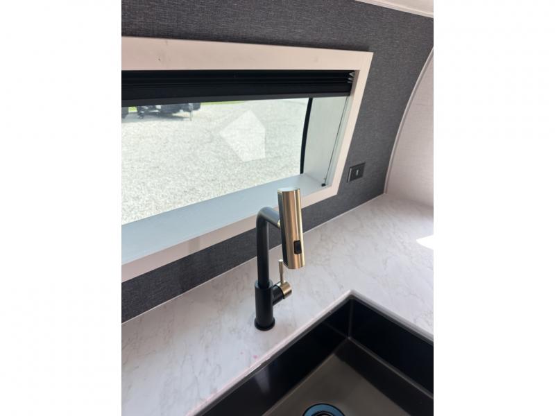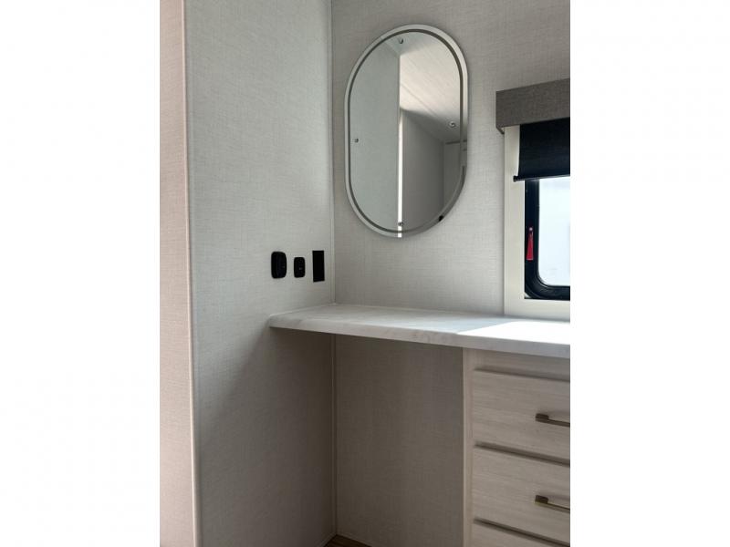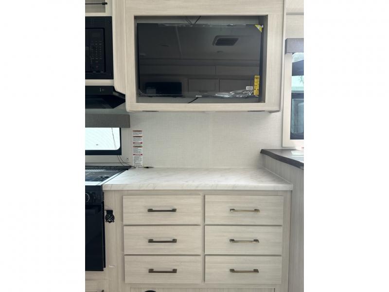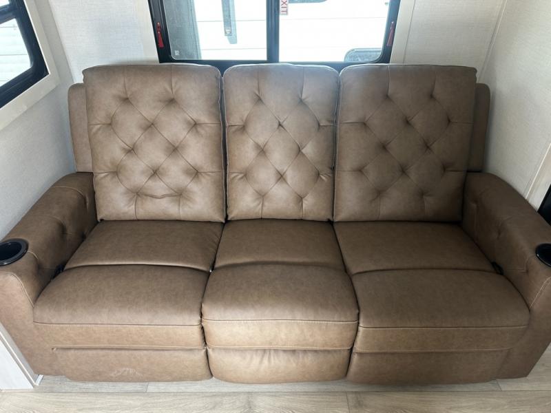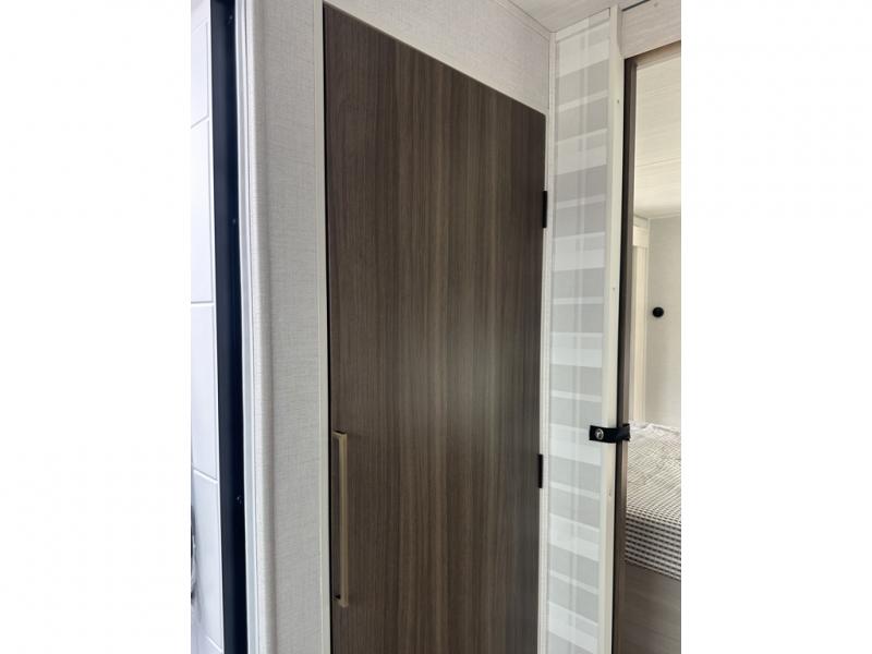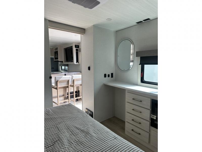 This couple's trailer will be giving you all the glamping vibes! There is a front kitchen with ample counter space, along with a counter with two bar stools, a central vacuum to easily clean up, and a slide out for more space! The second slide out is found in the middle master bedroom where you'll also enjoy a custom king bed across from a bedroom fireplace, a wardrobe, and a dresser with TV prep. Head towards the back and you'll be wowed by the full bath with dual bath sinks, an upgraded slow-close shower door, and a closet with washer and dryer prep. The exterior is just as impressive as the interior with its outside kitchen, 20' power awning with LED lights, slam-latch cargo doors, TV coax, and so much more!