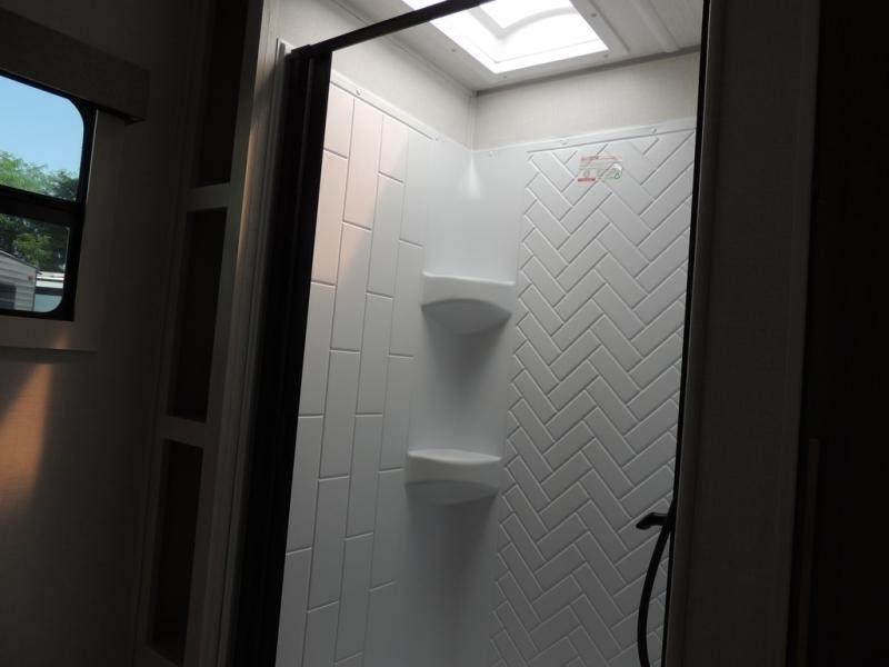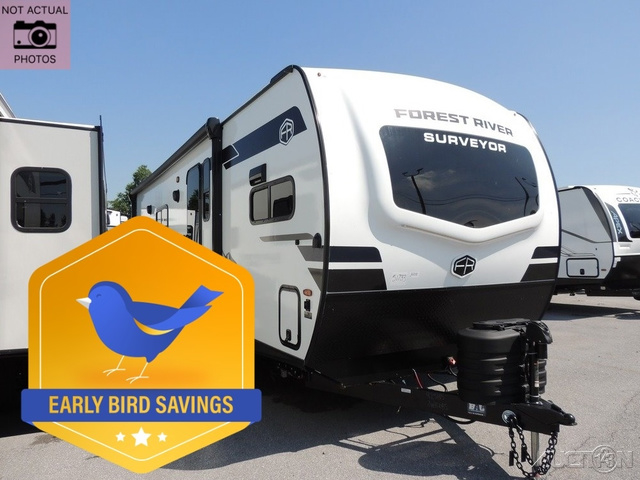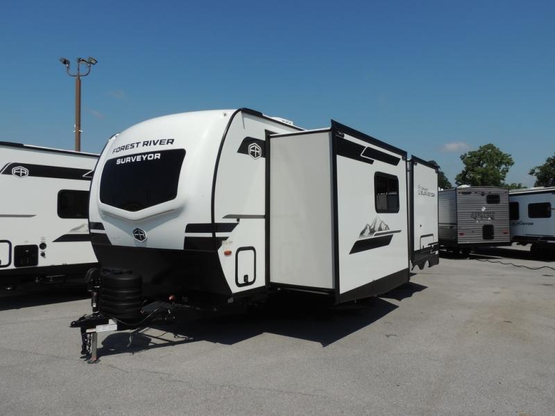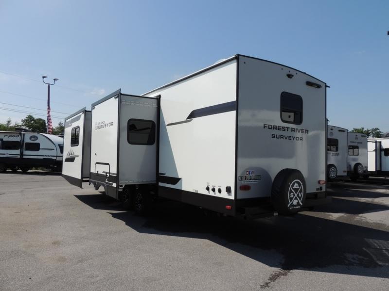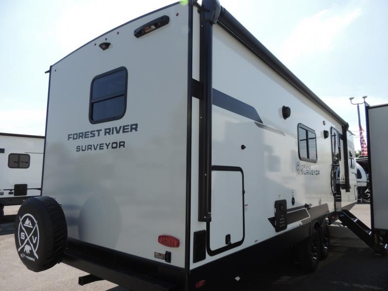 With any Grand Surveyor travel trailer by Forest River you will enjoy turn-key ready-to-go features and quality construction! Each model includes Azdel composite walls and a gel coated fiberglass front cap with an automotive style tinted windshield for a sleek look. There are friction hinge black glass entry door(s), an adjustable platform step with a night light, plus Goodyear tires and a power tongue jack for easy towing. The interior will have you feeling right at home with roller shades, residential faucets, sinks, and bathroom vanity, plus Surf(x) seamless countertops throughout. You can also plan for adventure with a 2" rear accessory and exterior spray port, and there are slam latch exterior baggage doors throughout to keep all your gear secure. Other stand-out features include a central vacuum system, a 200 watt solar panel with a 30 amp controller, a tankless water heater, carpet-free interiors, and the list goes on!