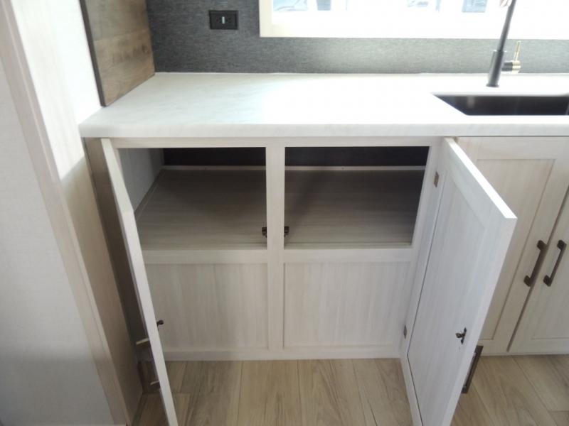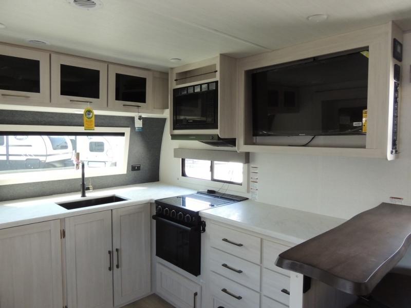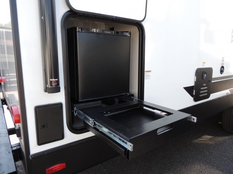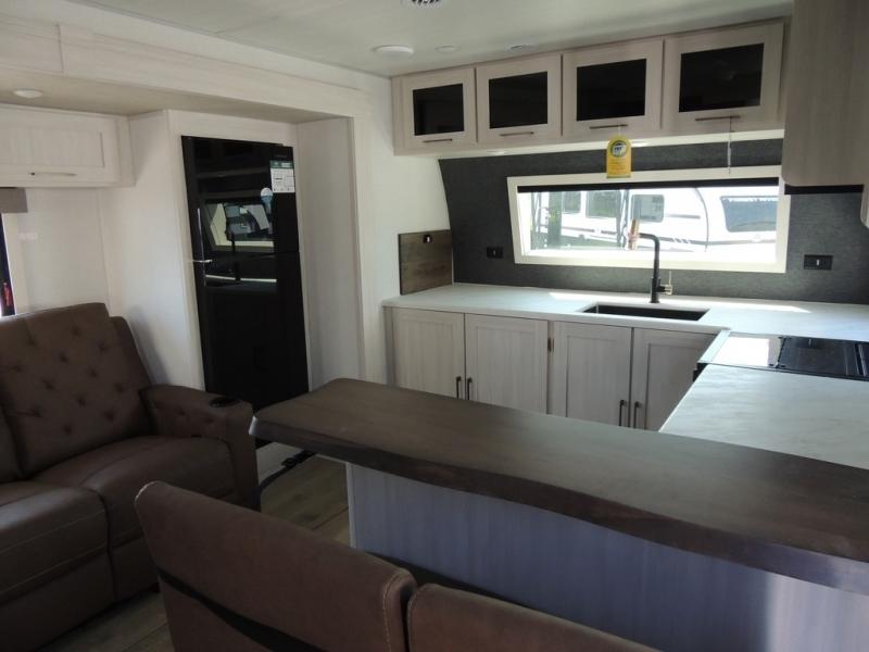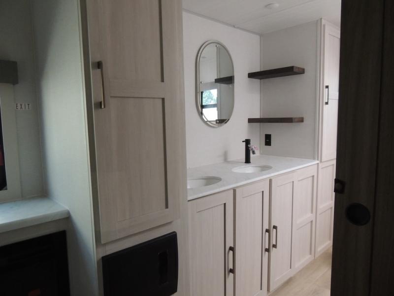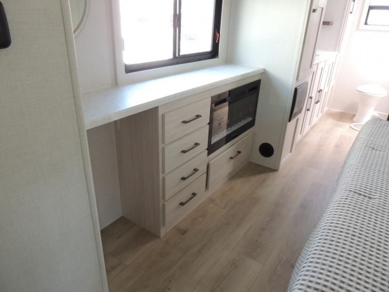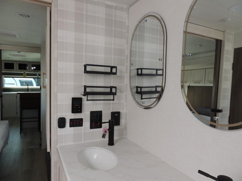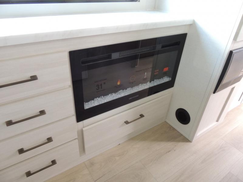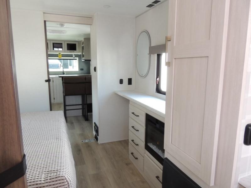 This couple's trailer will be giving you all the glamping vibes! There is a front kitchen with ample counter space, along with a counter with two bar stools, a central vacuum to easily clean up, and a slide out for more space! The second slide out is found in the middle master bedroom where you'll also enjoy a custom king bed across from a bedroom fireplace, a wardrobe, and a dresser with TV prep. Head towards the back and you'll be wowed by the full bath with dual bath sinks, an upgraded slow-close shower door, and a closet with washer and dryer prep. The exterior is just as impressive as the interior with its outside kitchen, 20' power awning with LED lights, slam-latch cargo doors, TV coax, and so much more!