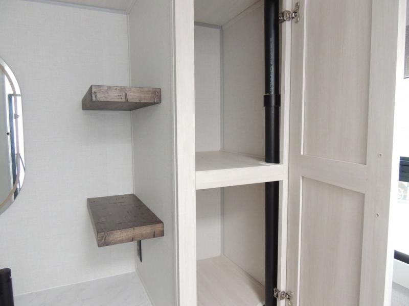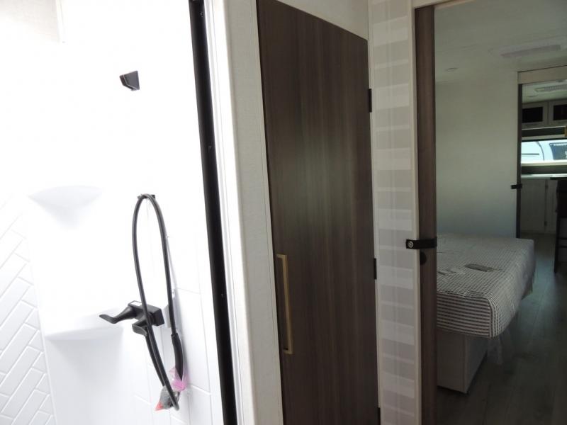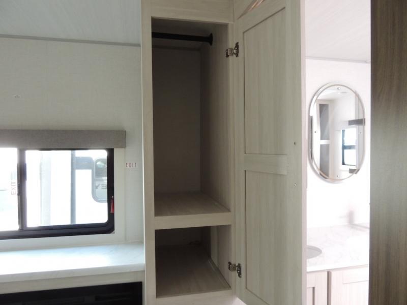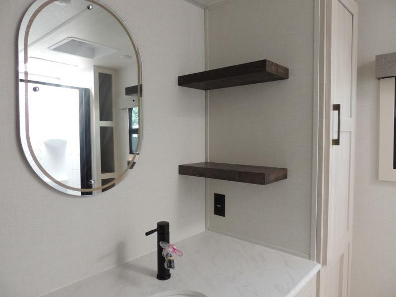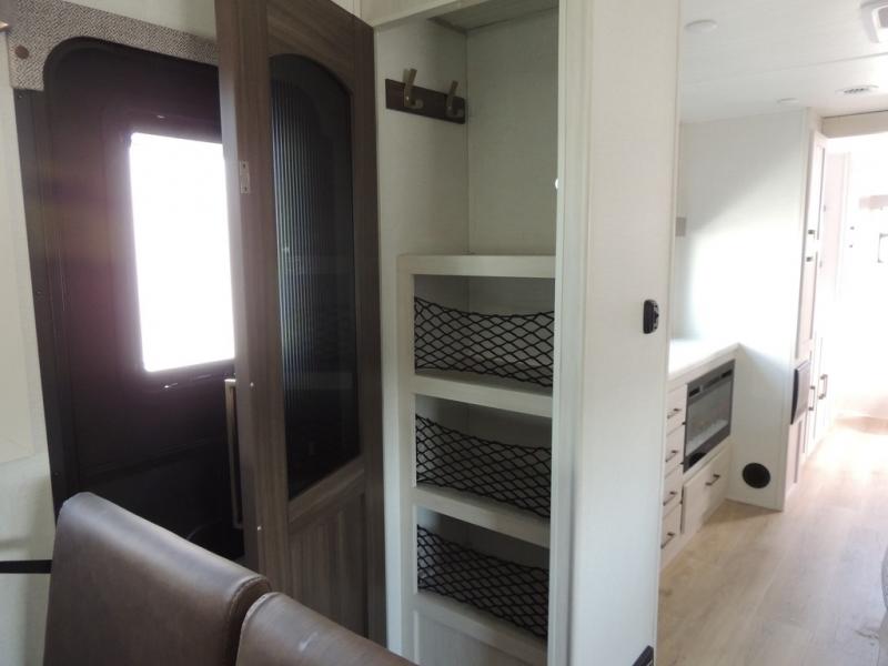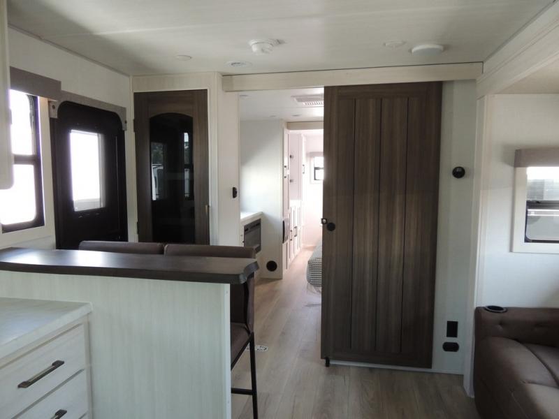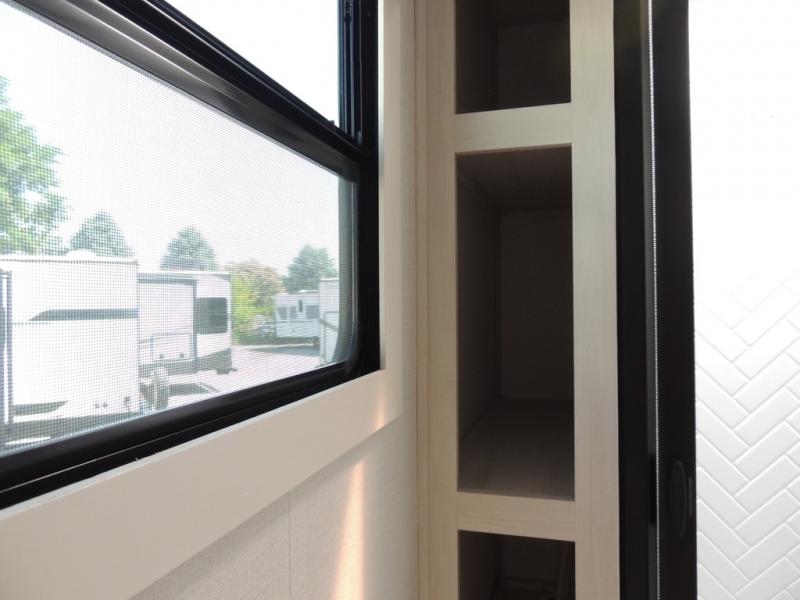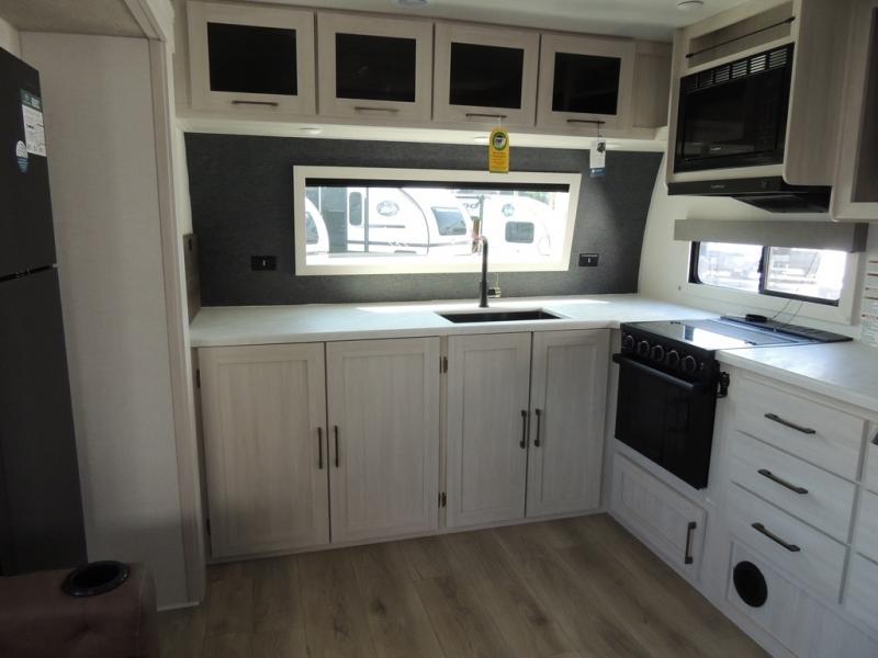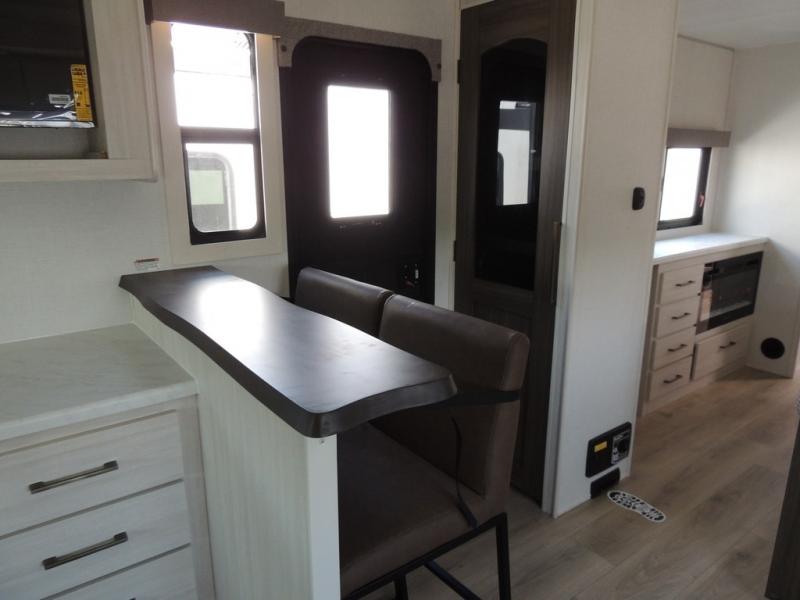 This couple's trailer will be giving you all the glamping vibes! There is a front kitchen with ample counter space, along with a counter with two bar stools, a central vacuum to easily clean up, and a slide out for more space! The second slide out is found in the middle master bedroom where you'll also enjoy a custom king bed across from a bedroom fireplace, a wardrobe, and a dresser with TV prep. Head towards the back and you'll be wowed by the full bath with dual bath sinks, an upgraded slow-close shower door, and a closet with washer and dryer prep. The exterior is just as impressive as the interior with its outside kitchen, 20' power awning with LED lights, slam-latch cargo doors, TV coax, and so much more!