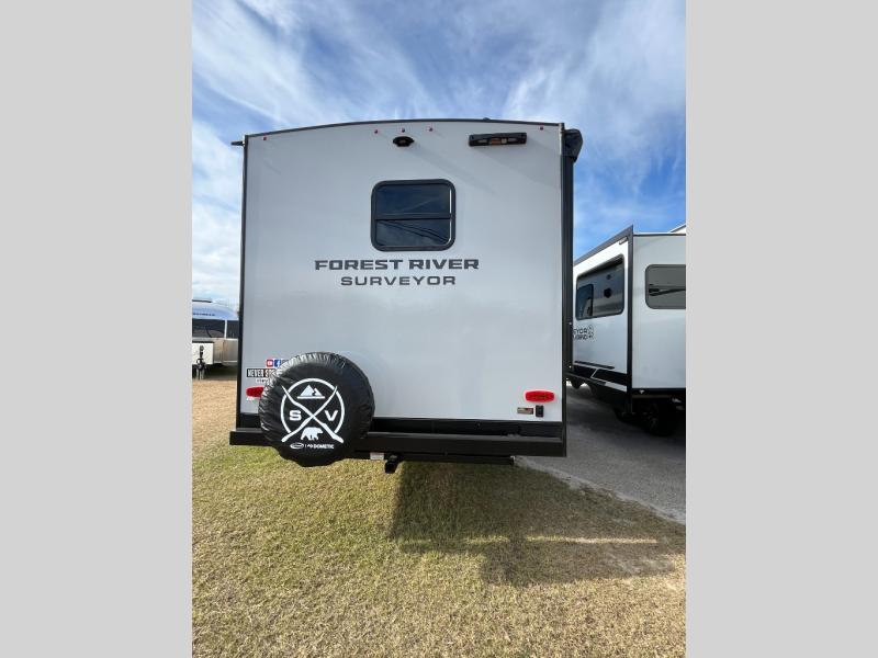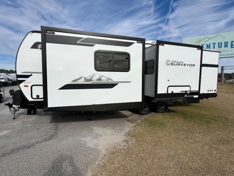 With any Grand Surveyor travel trailer by Forest River you will enjoy turn-key ready-to-go features and quality construction! Each model includes Azdel composite walls and a gel coated fiberglass front cap with an automotive style tinted windshield for a sleek look. There are friction hinge black glass entry door(s), an adjustable platform step with a night light, plus Goodyear tires and a power tongue jack for easy towing. The interior will have you feeling right at home with roller shades, residential faucets, sinks, and bathroom vanity, plus Surf(x) seamless countertops throughout. You can also plan for adventure with a 2" rear accessory and exterior spray port, and there are slam latch exterior baggage doors throughout to keep all your gear secure. Other stand-out features include a central vacuum system, a 200 watt solar panel with a 30 amp controller, a tankless water heater, carpet-free interiors, and the list goes on!