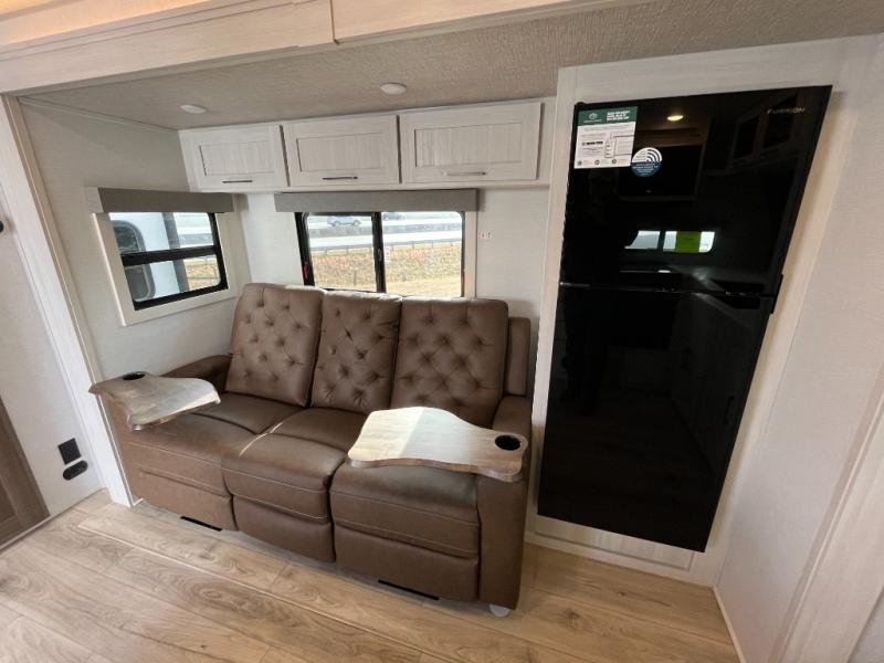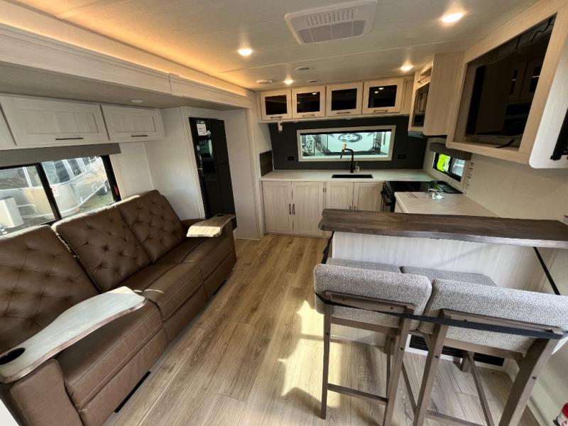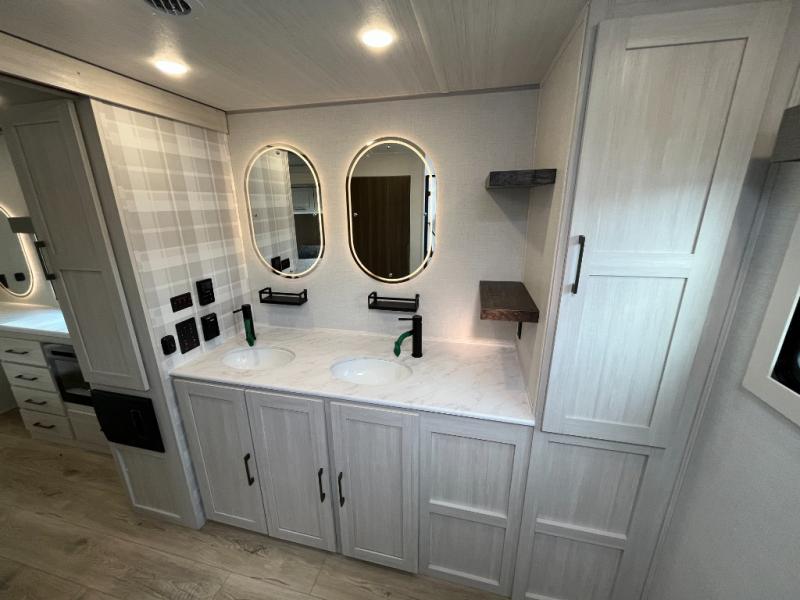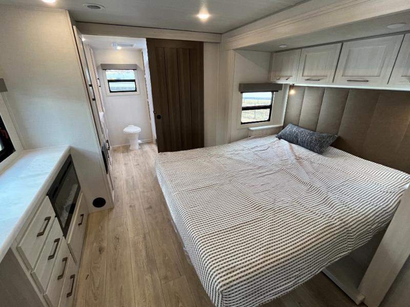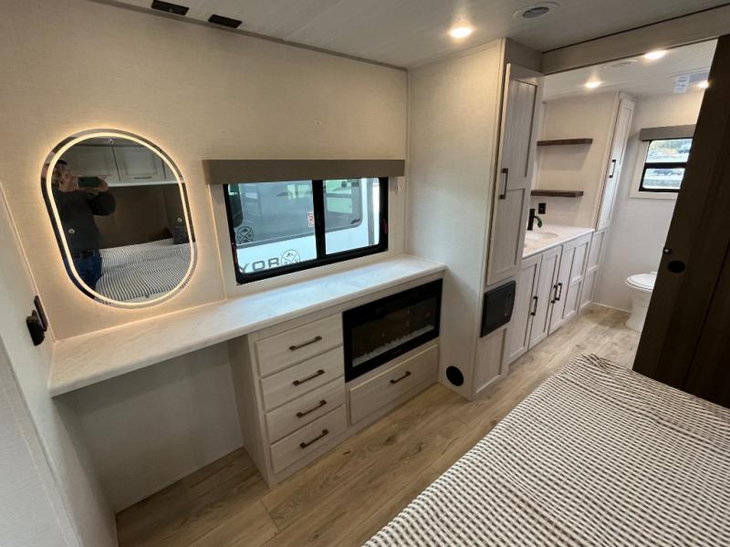 This couple's trailer will be giving you all the glamping vibes! There is a front kitchen with ample counter space, along with a counter with two bar stools, a central vacuum to easily clean up, and a slide out for more space! The second slide out is found in the middle master bedroom where you'll also enjoy a custom king bed across from a bedroom fireplace, a wardrobe, and a dresser with TV prep. Head towards the back and you'll be wowed by the full bath with dual bath sinks, an upgraded slow-close shower door, and a closet with washer and dryer prep. The exterior is just as impressive as the interior with its outside kitchen, 20' power awning with LED lights, slam-latch cargo doors, TV coax, and so much more!