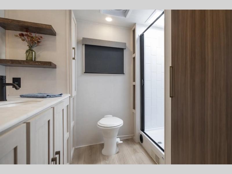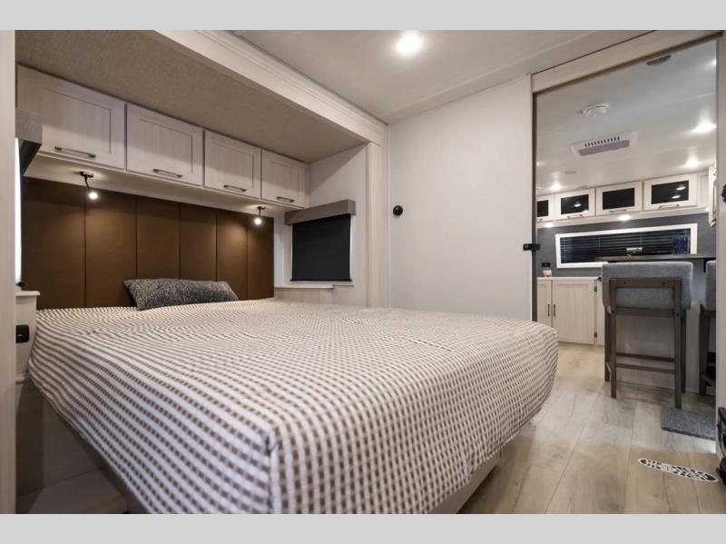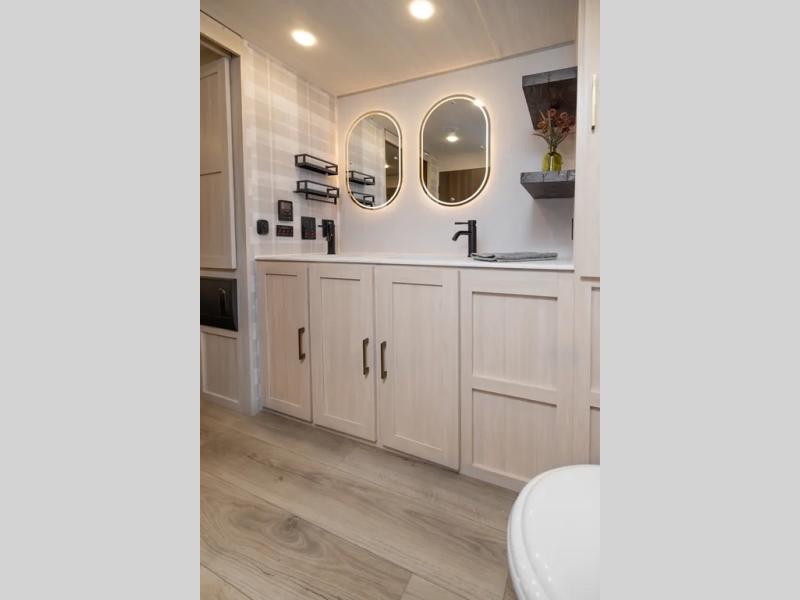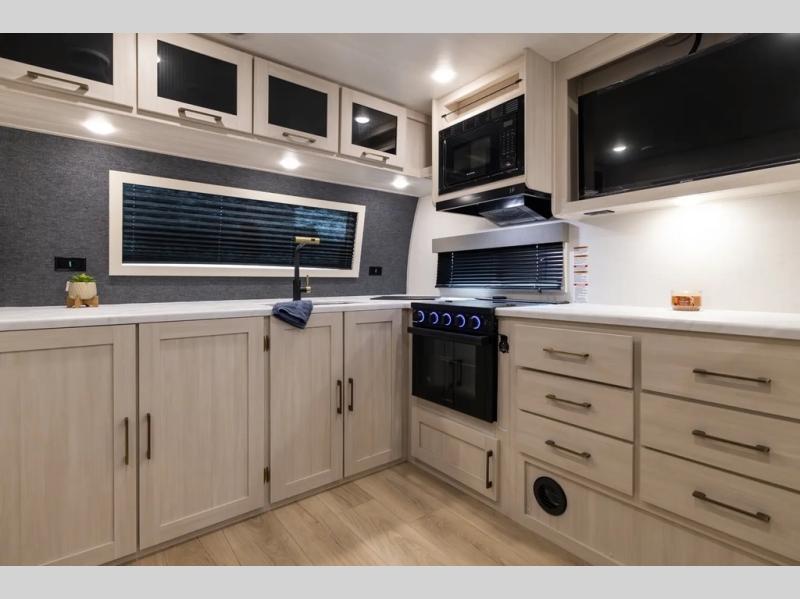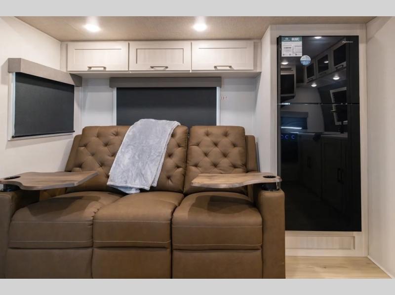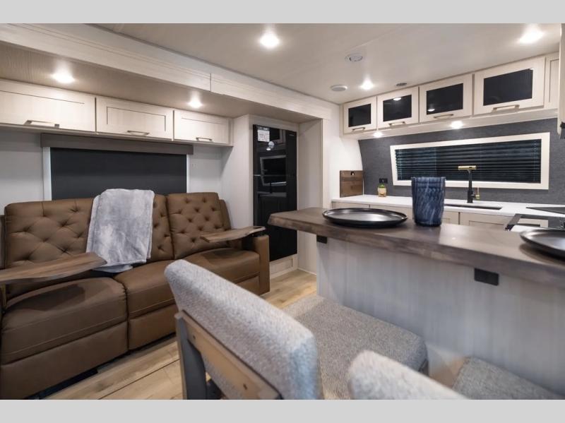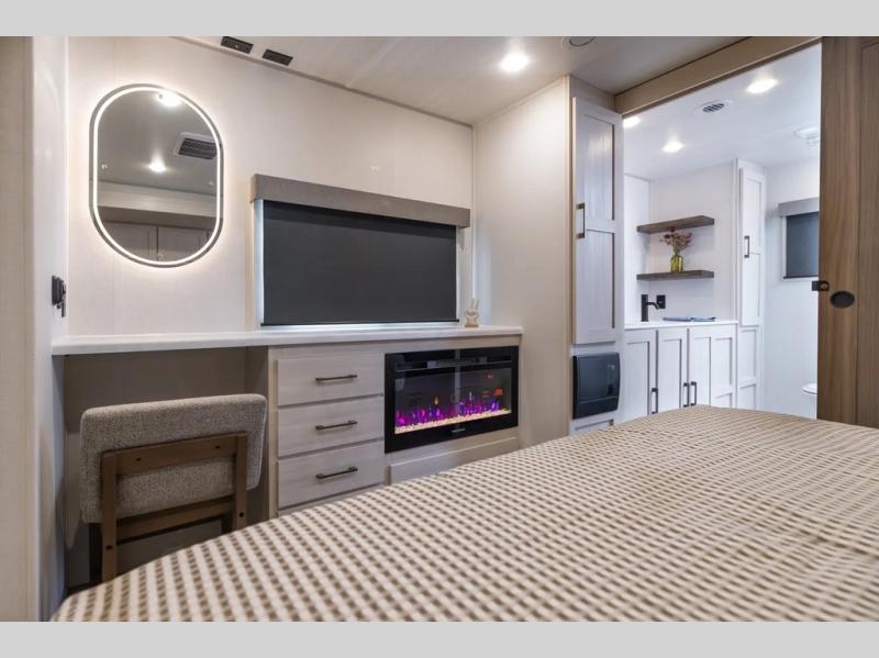 This couple's trailer will be giving you all the glamping vibes! There is a front kitchen with ample counter space, along with a counter with two bar stools, a central vacuum to easily clean up, and a slide out for more space! The second slide out is found in the middle master bedroom where you'll also enjoy a custom king bed across from a bedroom fireplace, a wardrobe, and a dresser with TV prep. Head towards the back and you'll be wowed by the full bath with dual bath sinks, an upgraded slow-close shower door, and a closet with washer and dryer prep. The exterior is just as impressive as the interior with its outside kitchen, 20' power awning with LED lights, slam-latch cargo doors, TV coax, and so much more!