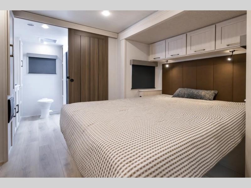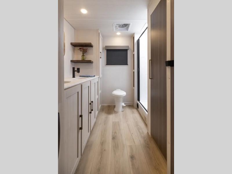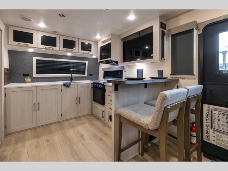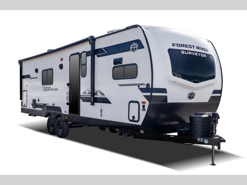With any Grand Surveyor travel trailer by Forest River you will enjoy turn-key ready-to-go features and quality construction! Each model includes Azdel composite walls and a gel coated fiberglass front cap with an automotive style tinted windshield for a sleek look. There are friction hinge black glass entry door(s), an adjustable platform step with a night light, plus Goodyear tires and a power tongue jack for easy towing. The interior will have you feeling right at home with roller shades, residential faucets, sinks, and bathroom vanity, plus Surf(x) seamless countertops throughout. You can also plan for adventure with a 2" rear accessory and exterior spray port, and there are slam latch exterior baggage doors throughout to keep all your gear secure. Other stand-out features include a central vacuum system, a 200 watt solar panel with a 30 amp controller, a tankless water heater, carpet-free interiors, and the list goes on!