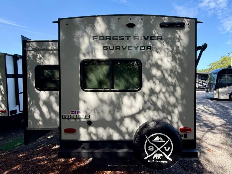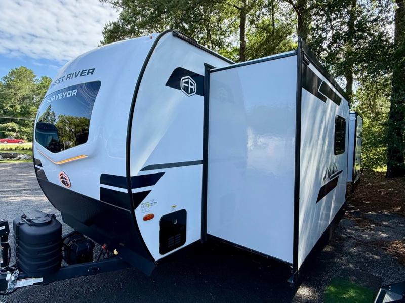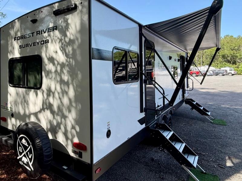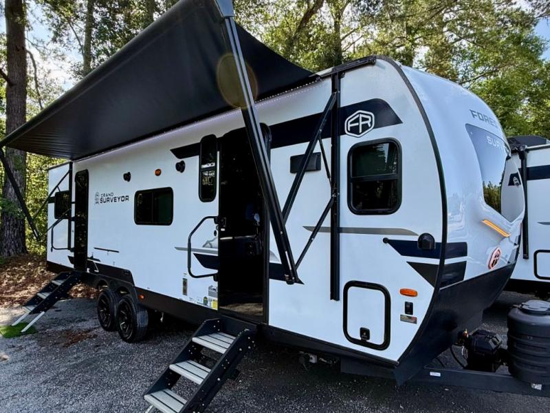 With any Grand Surveyor travel trailer by Forest River you will enjoy turn-key ready-to-go features and quality construction! Each model includes Azdel composite walls and a gel coated fiberglass front cap with an automotive style tinted windshield for a sleek look. There are friction hinge black glass entry door(s), an adjustable platform step with a night light, plus Goodyear tires and a power tongue jack for easy towing. The interior will have you feeling right at home with roller shades, residential faucets, sinks, and bathroom vanity, plus Surf(x) seamless countertops throughout. You can also plan for adventure with a 2" rear accessory and exterior spray port, and there are slam latch exterior baggage doors throughout to keep all your gear secure. Other stand-out features include a central vacuum system, a 200 watt solar panel with a 30 amp controller, a tankless water heater, carpet-free interiors, and the list goes on!