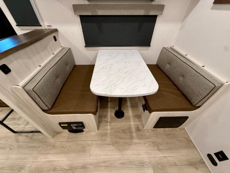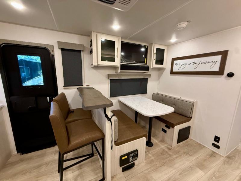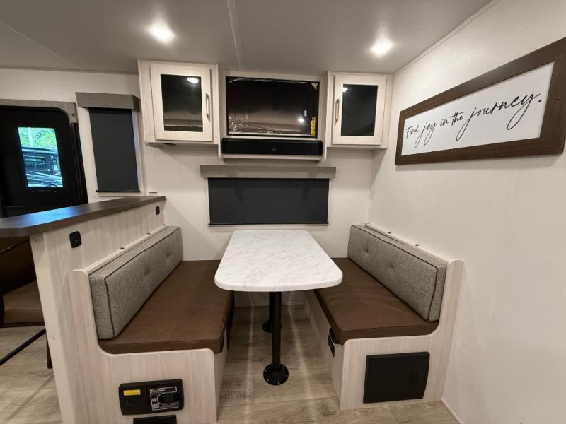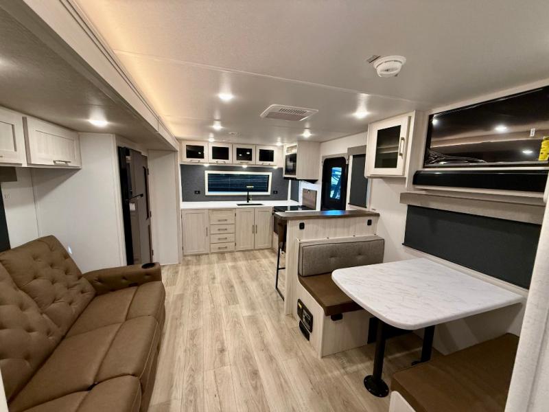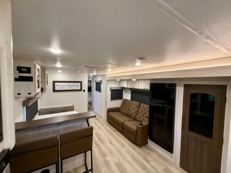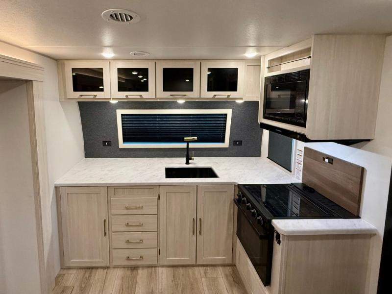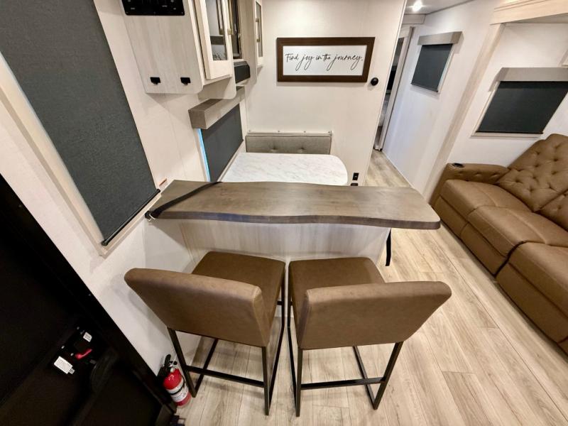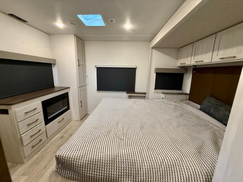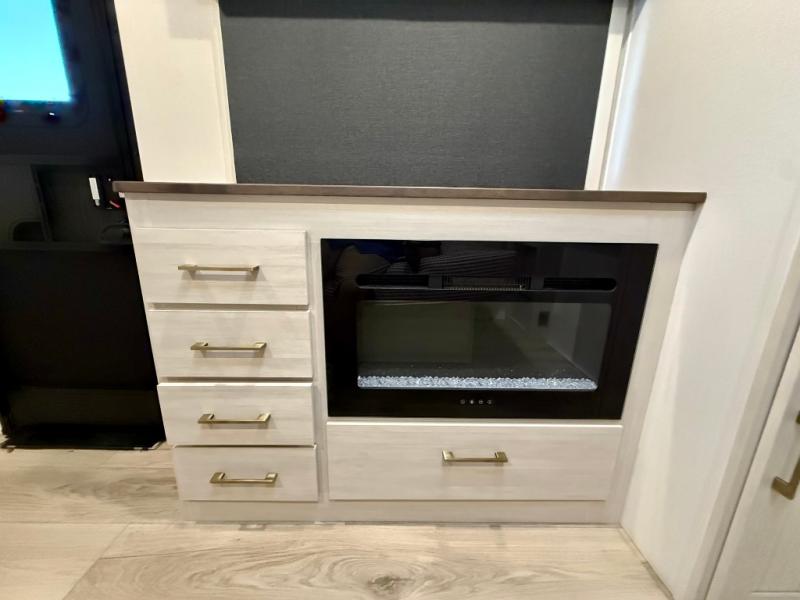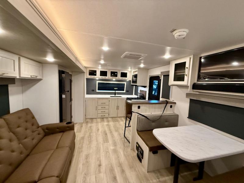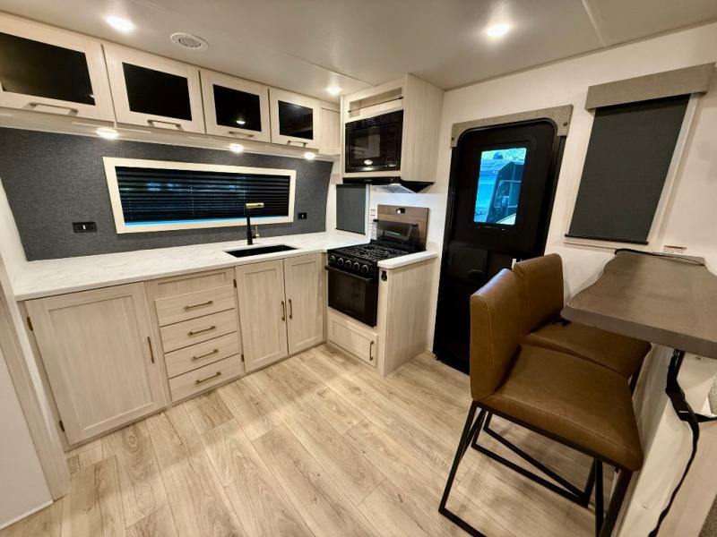 This travel trailer is a masterpiece of comfort, style, and functionality. Take the party outside with the outdoor kitchen, perfect for family dining, socializing, and making unforgettable memories! Retreat to the serene bedroom, featuring a king bed, spacious wardrobe, and overhead storage for effortless organization, plus, cozy up by the warm fireplace on chilly nights. Moreover, the incredible kitchen is a culinary dream, equipped with a pantry, 10 cu. refrigerator, overhead cabinets, and a countertop with stylish bar stools. The living room is a haven of relaxation, boasting a vibrant LED TV, overhead cabinets, and theater seating. Also, share meals with loved ones at the convenient dinette. Finally, bath in the amazing full bathroom, perfect for cleaning up after a long day in the woods.