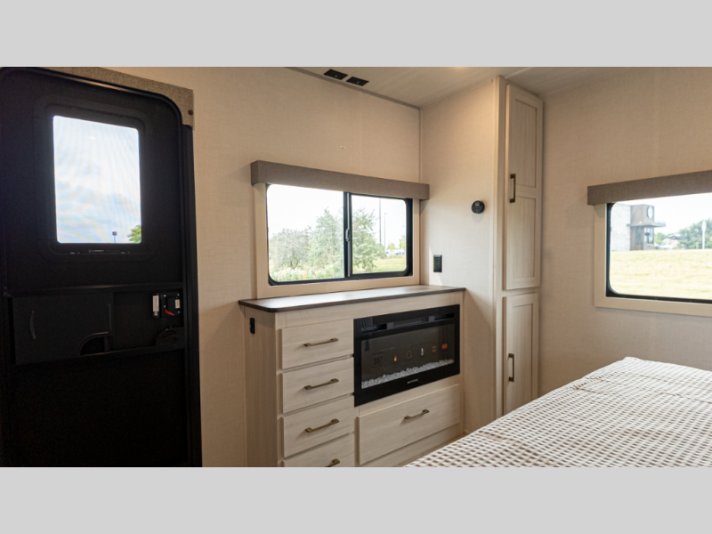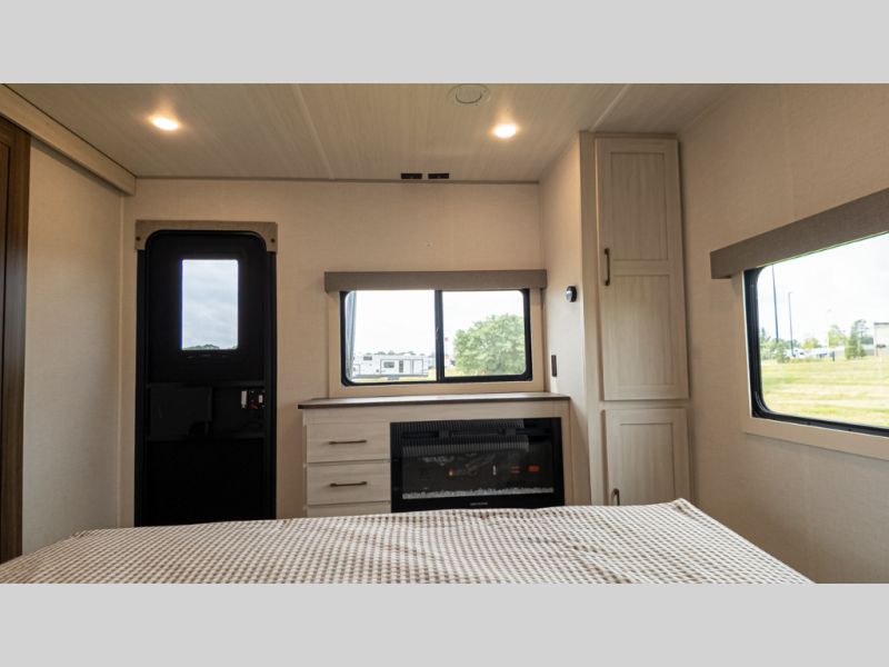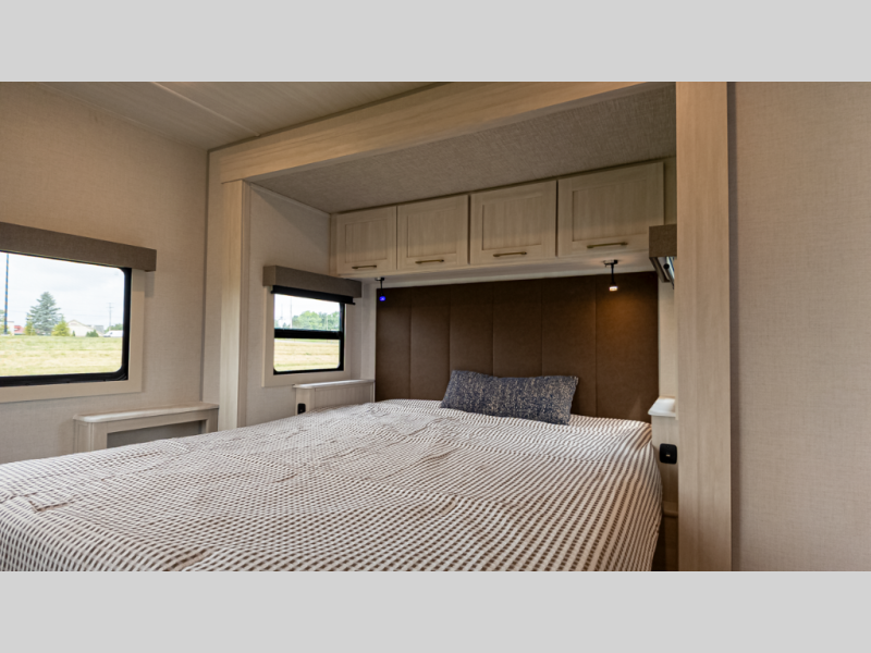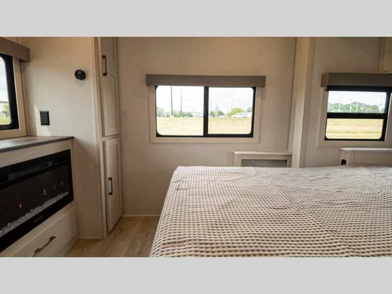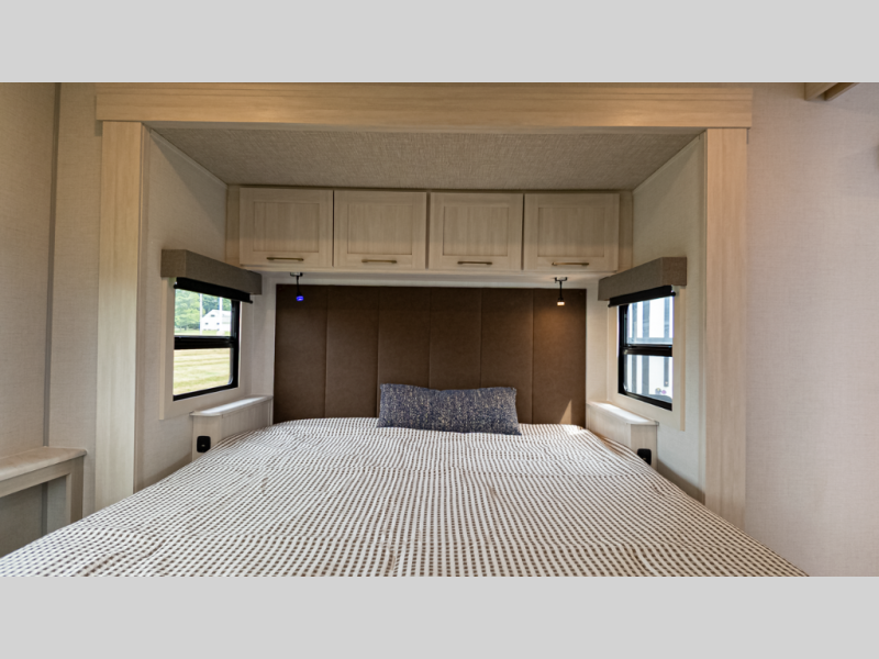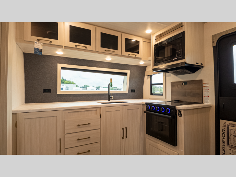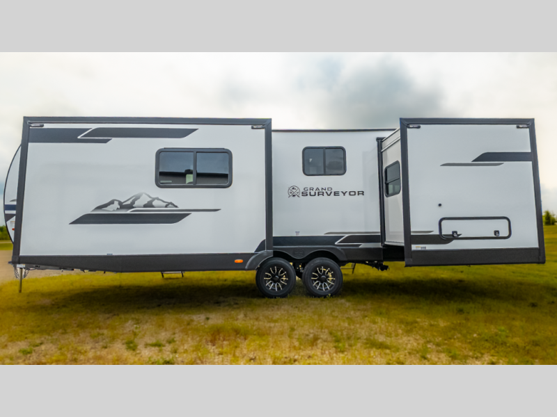 A: The Surveyor 275FKBS nails the balance of space, style, and smart design—featuring a massive front kitchen with panoramic windows, opposing slide-outs for lounge-like space, and a king bed suite with full-width wardrobe and washer/dryer prep.
