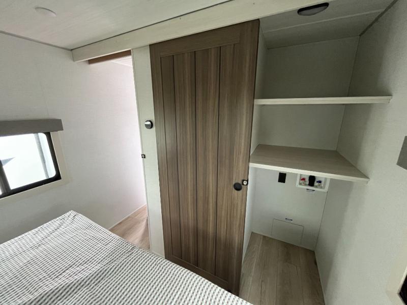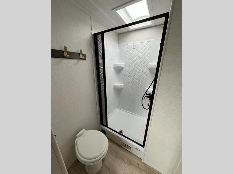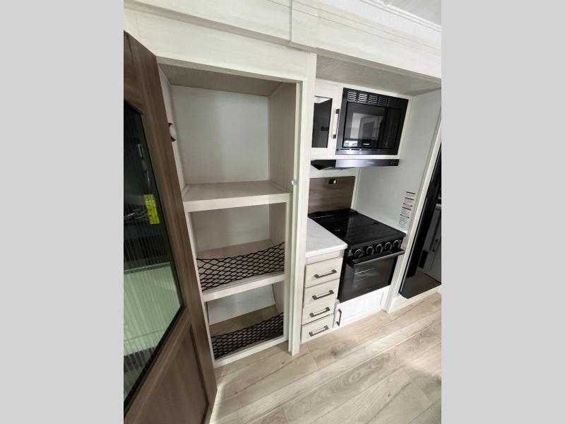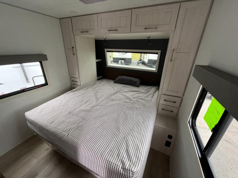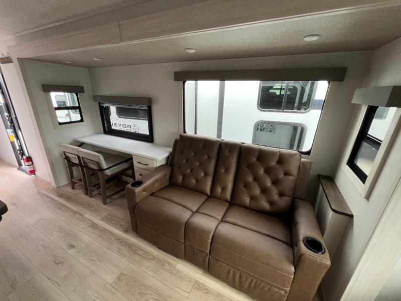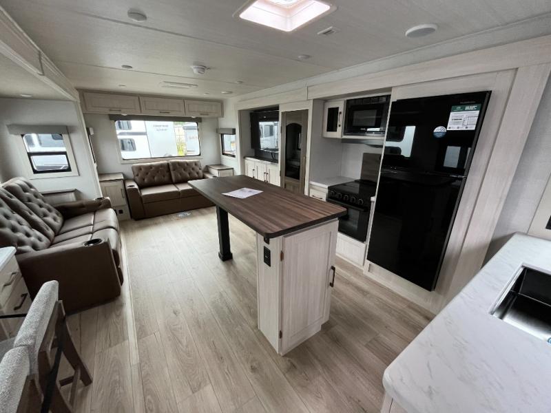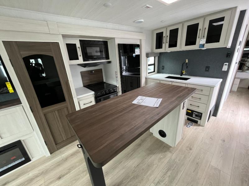 If comfort is what you're looking for, you won't have to search far with this travel trailer! There are dual opposing slides in the main living area for maximum space. The kitchen that flows from the living room area features a high-top dinette that gives a more residential feel to this space, plus there is a pantry, overhead storage, a 10 cu. ft. 12V black glass refrigerator, and more kitchen features you are sure to love. The rear living area includes an EZ-out sofa bed to provide sleeping space for two overnight guests, and there is a theater seat across from the fireplace and HD TV. You'll also enjoy a refreshing drink at the bar top that can also function as a desk! When it's time to call it a night, you can clean up in the spacious full bath, then head to the front bedroom. There is a custom king bed here along with two wardrobes and overhead storage that makes organizing easy!